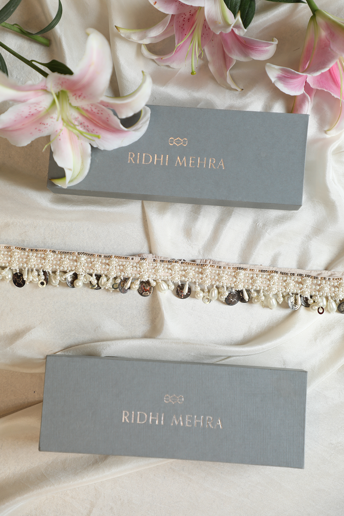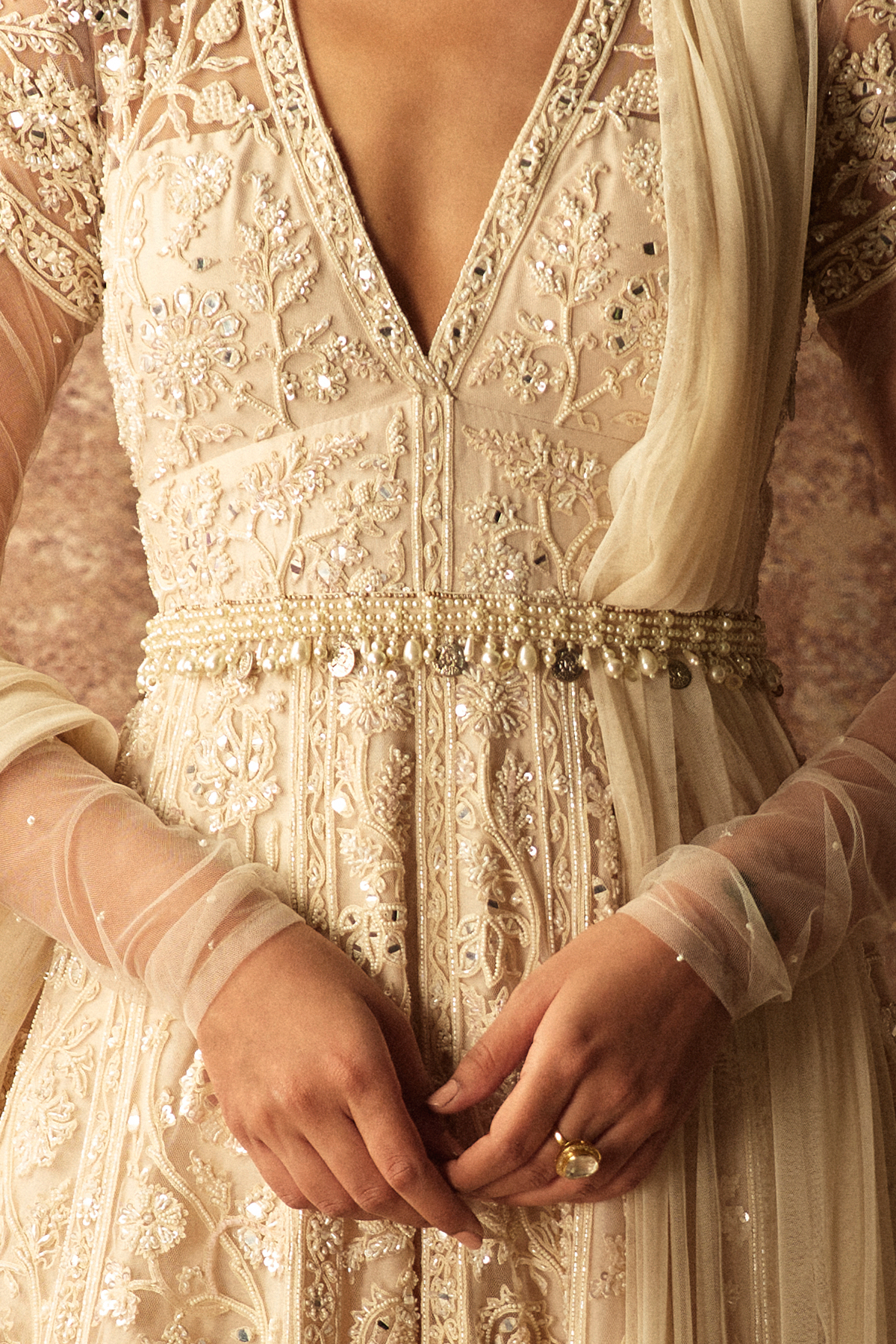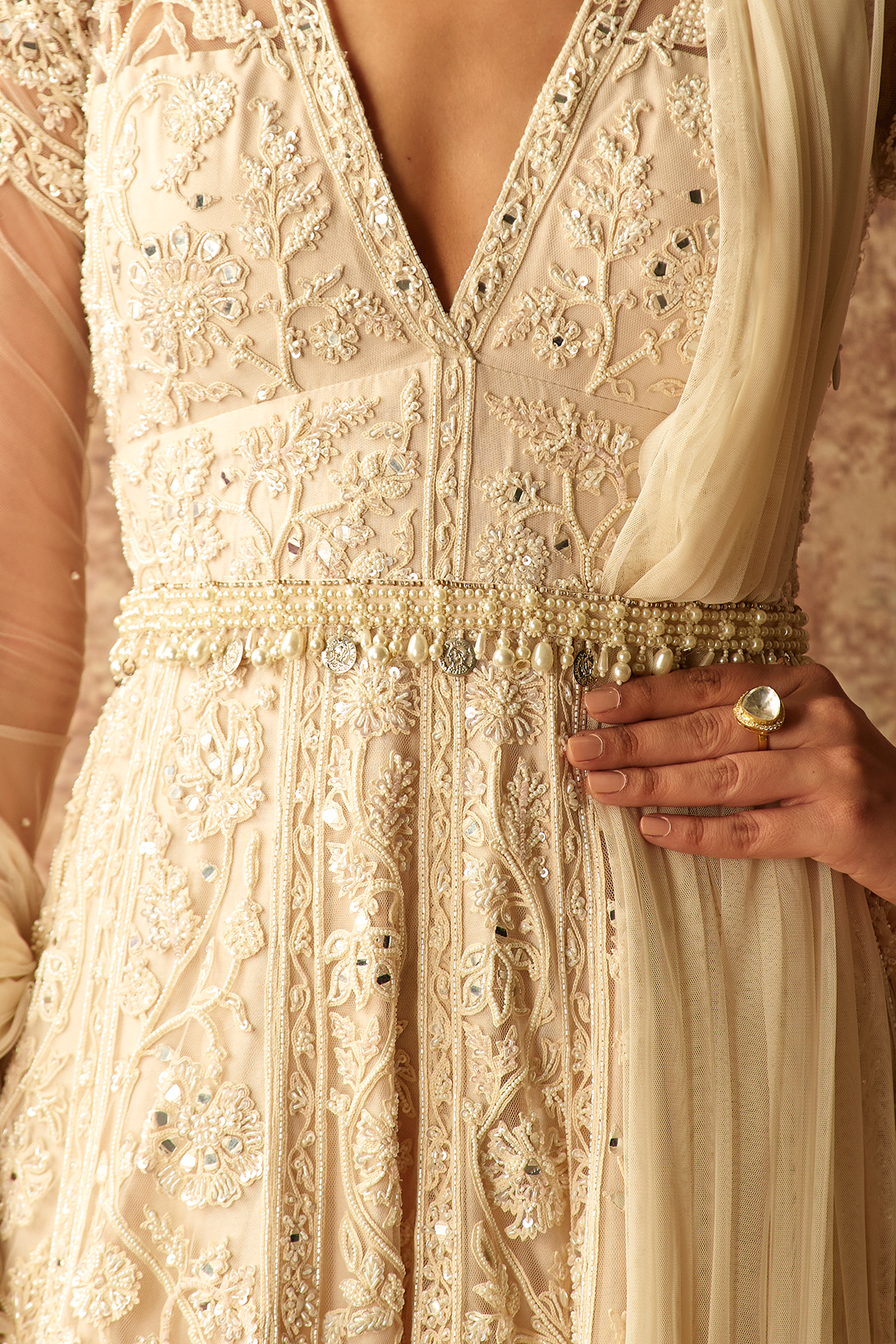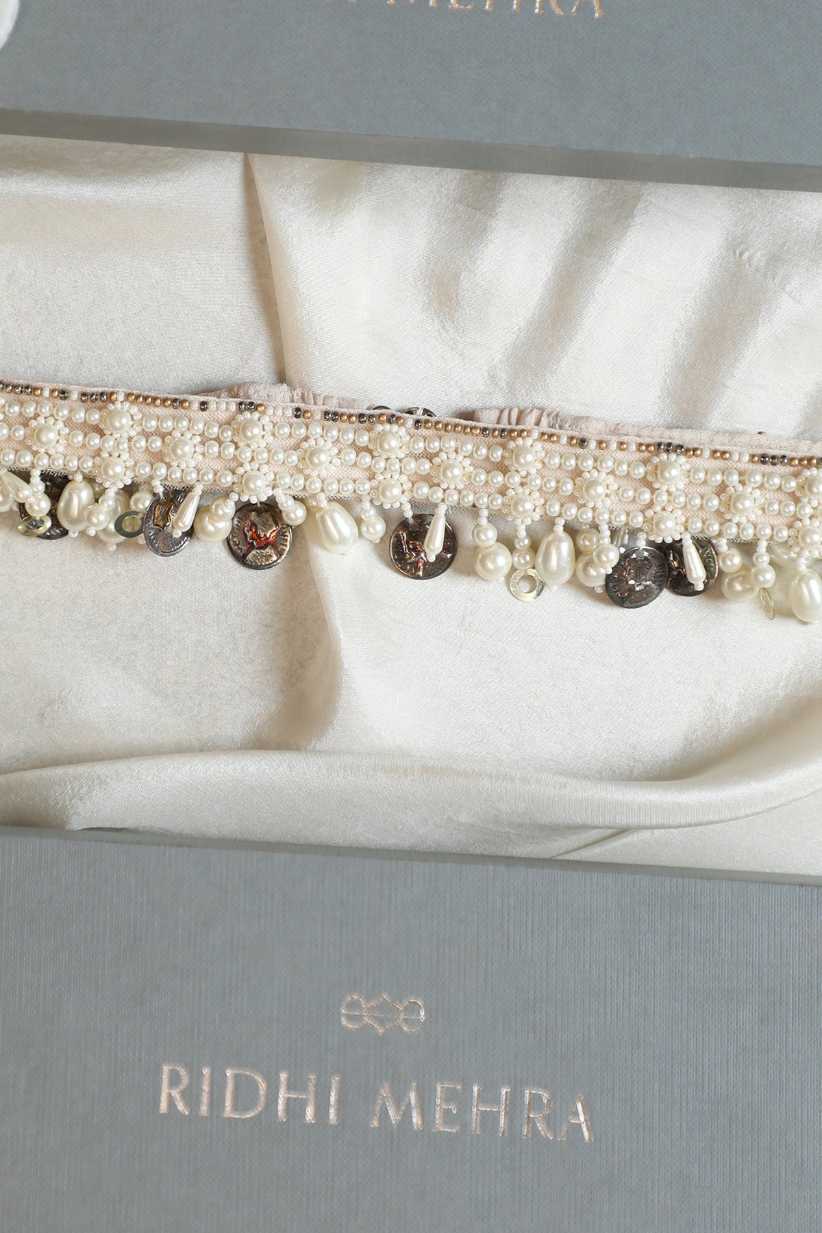 Pearl embroidered belt with pearl and coin tassels.