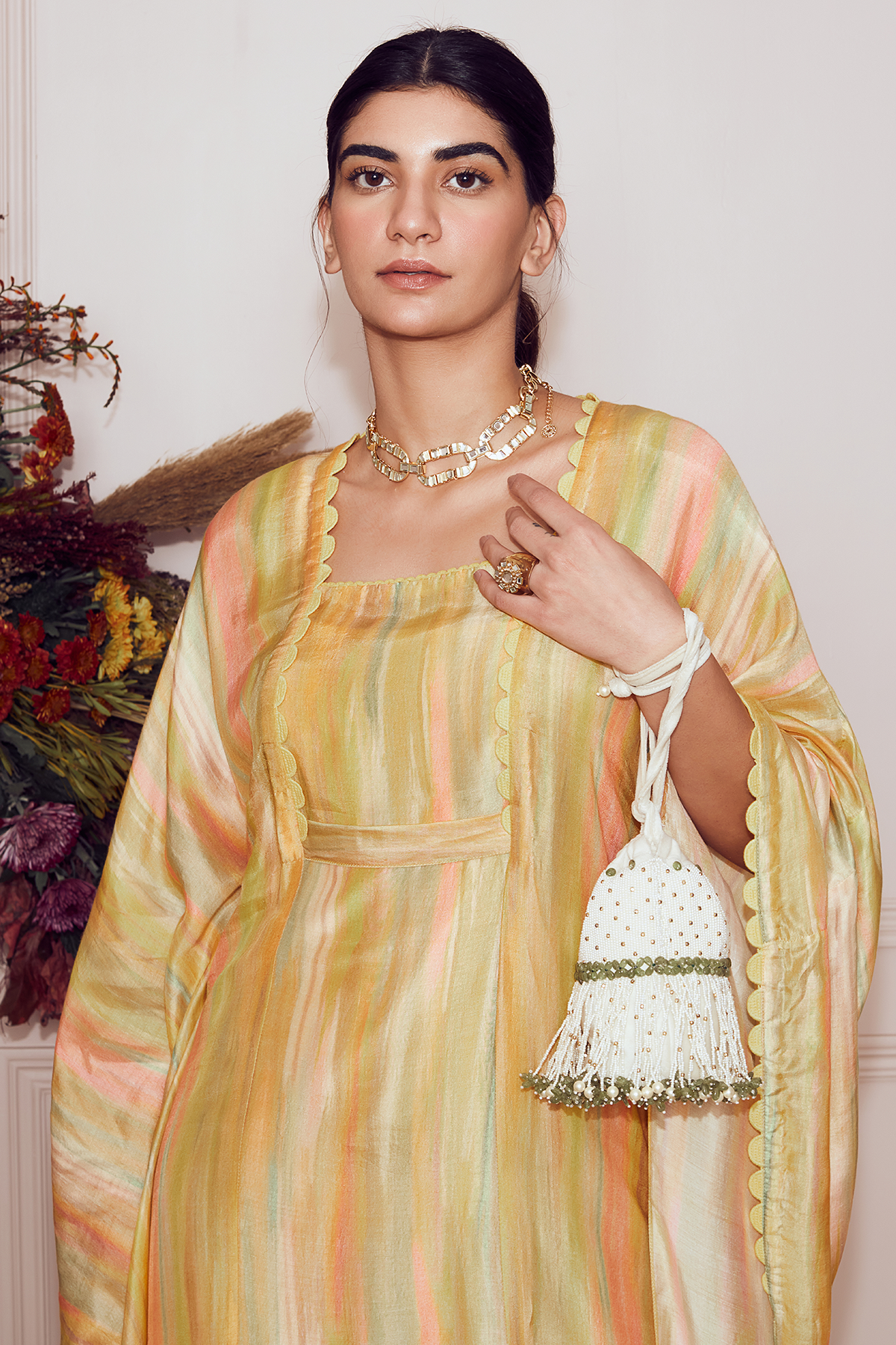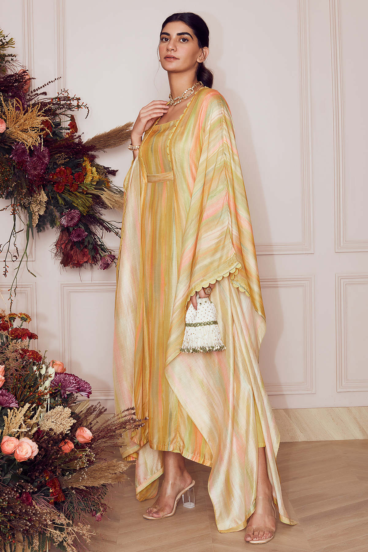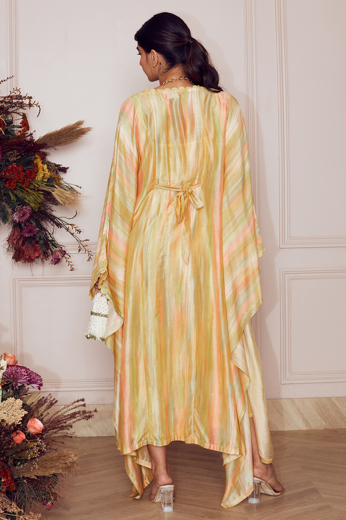 Yellow ombre printed silk square neck kaftan with mulmul slip