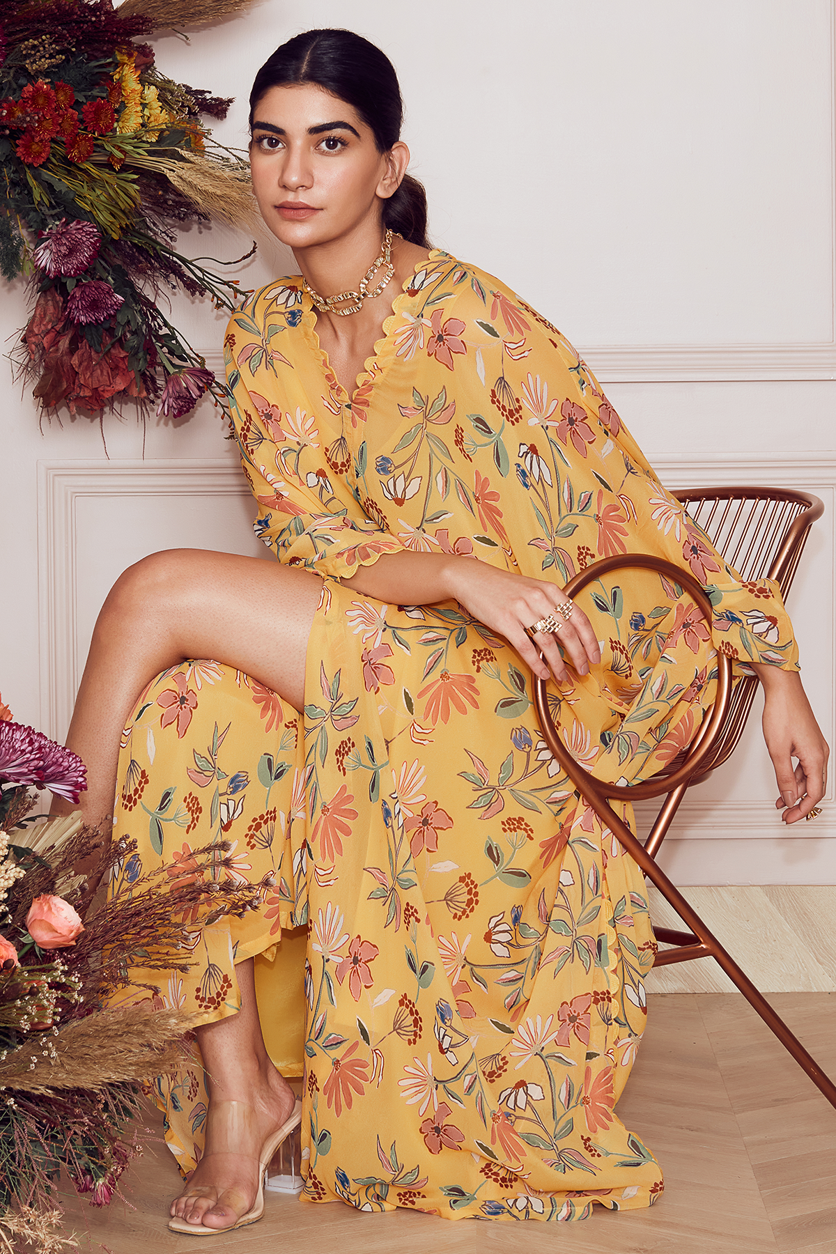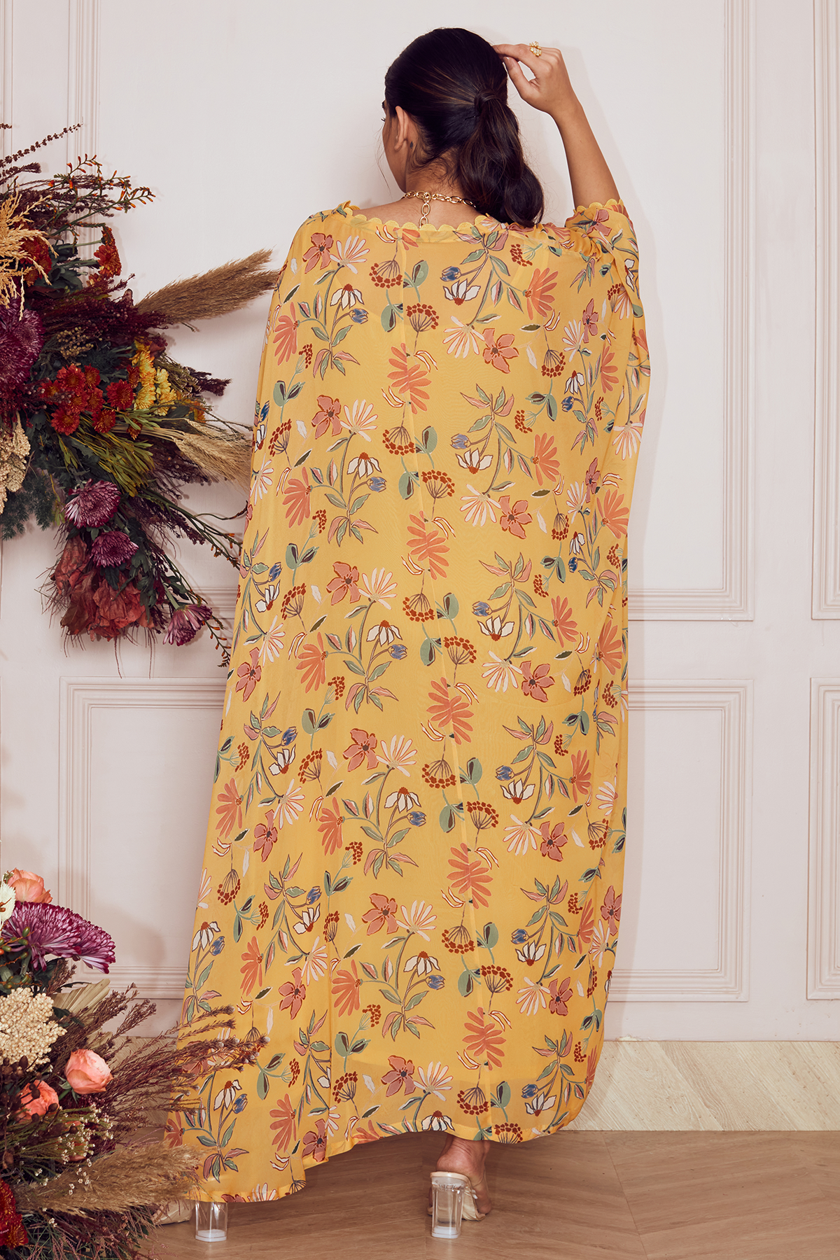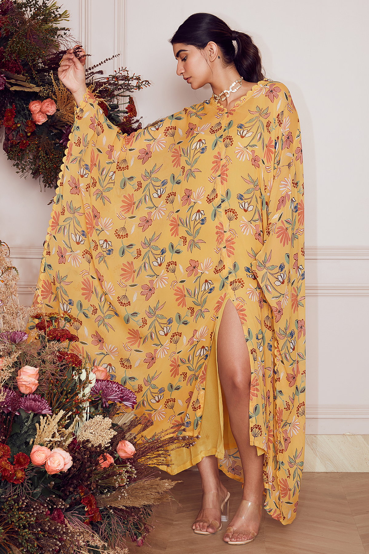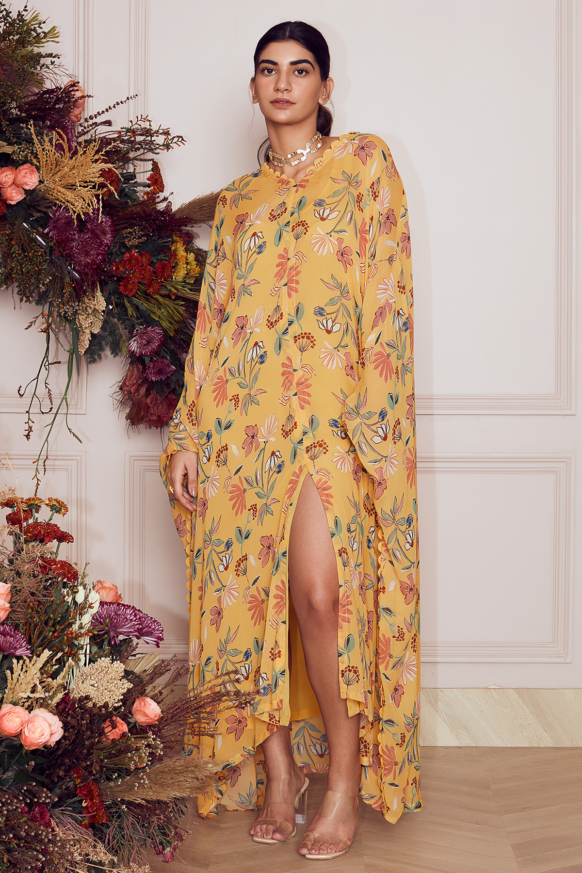Yelllow big floral printed georgette kaftan with mulmul slip