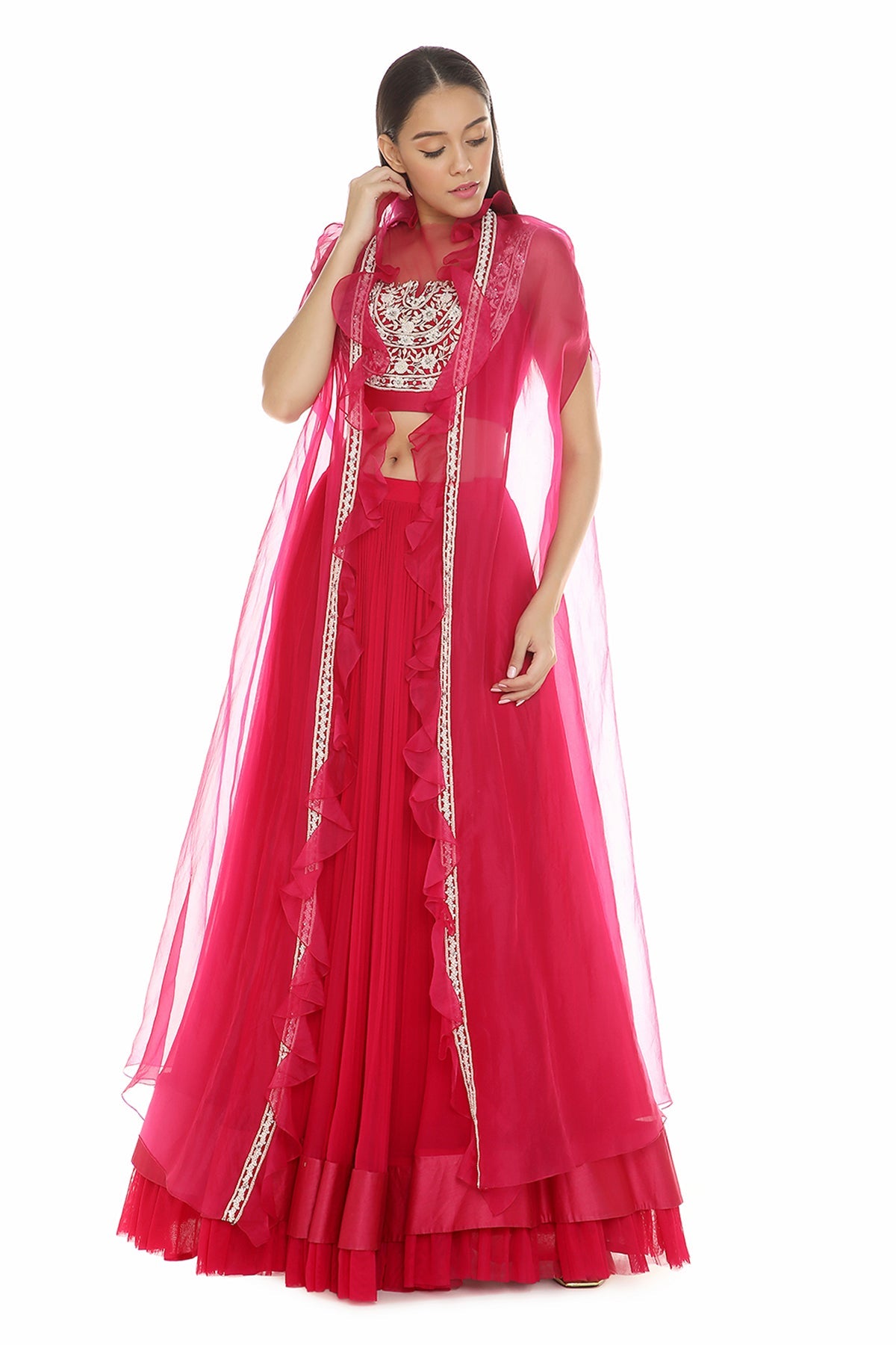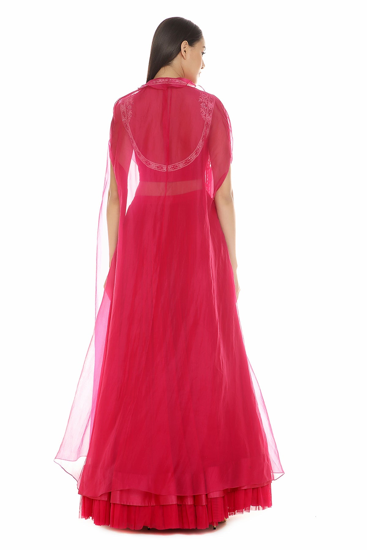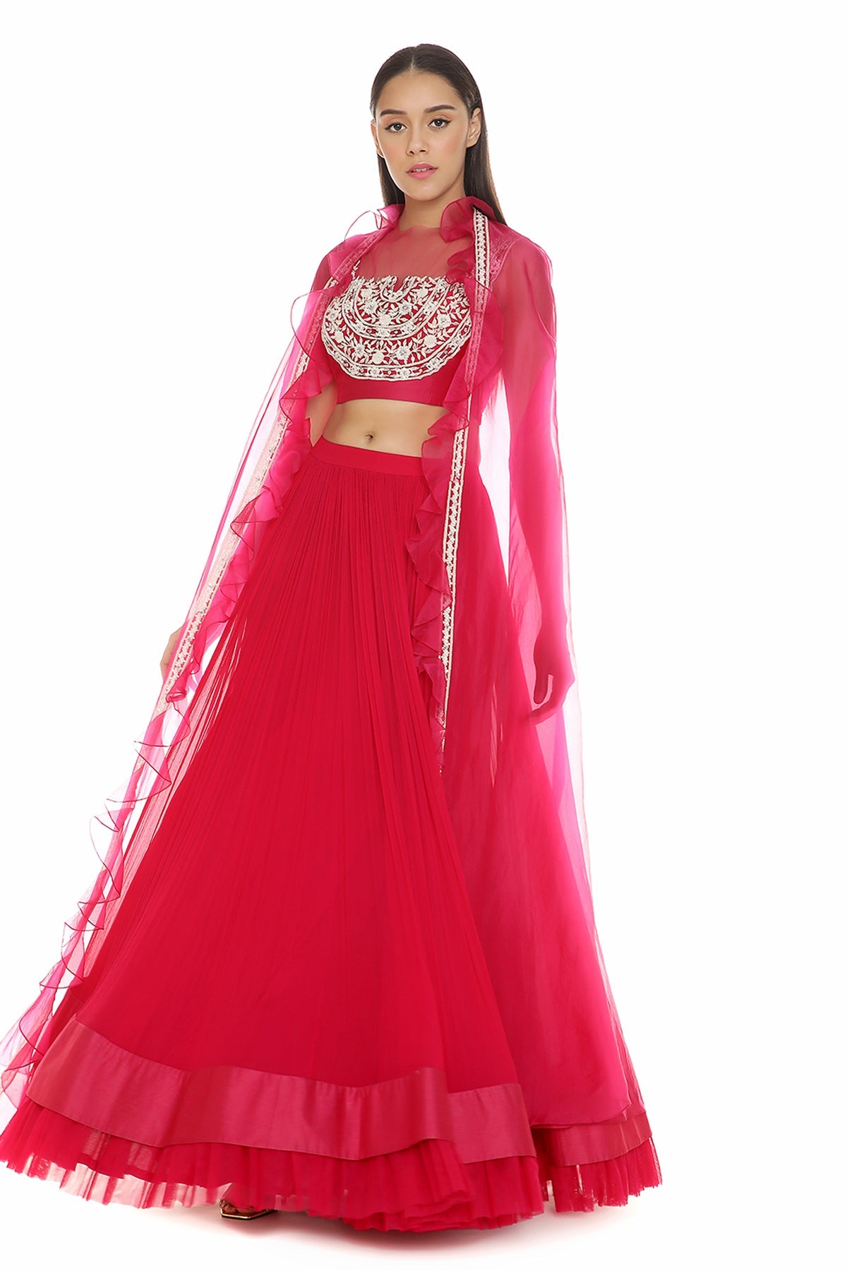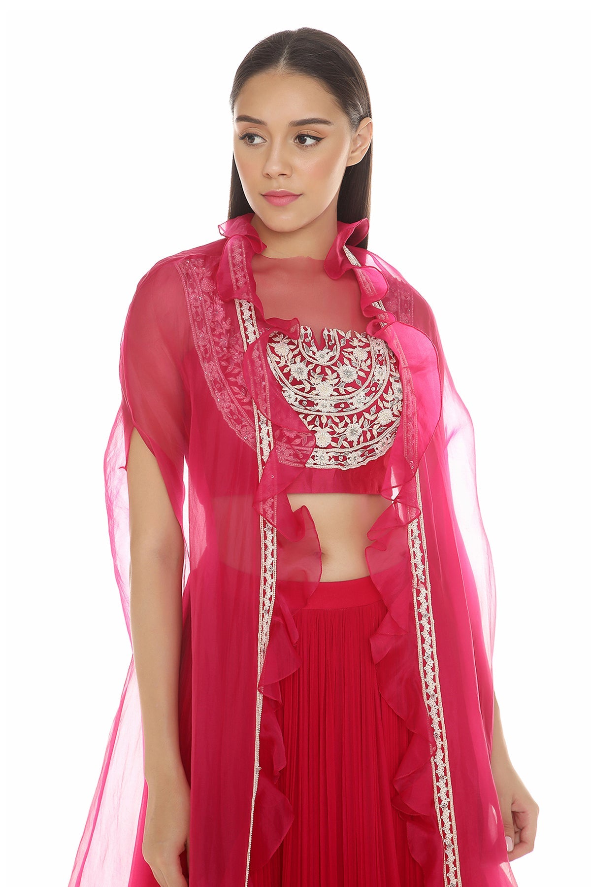 Pearl Embelished blouse with organza ruffled cape and Chiffon Ruched Skirt