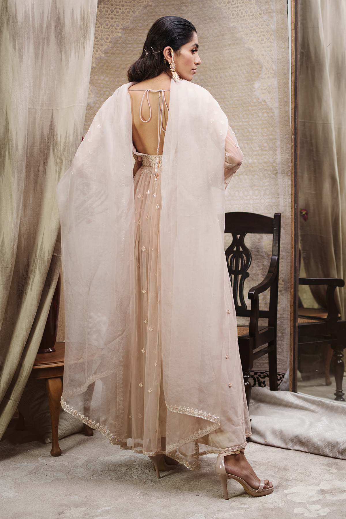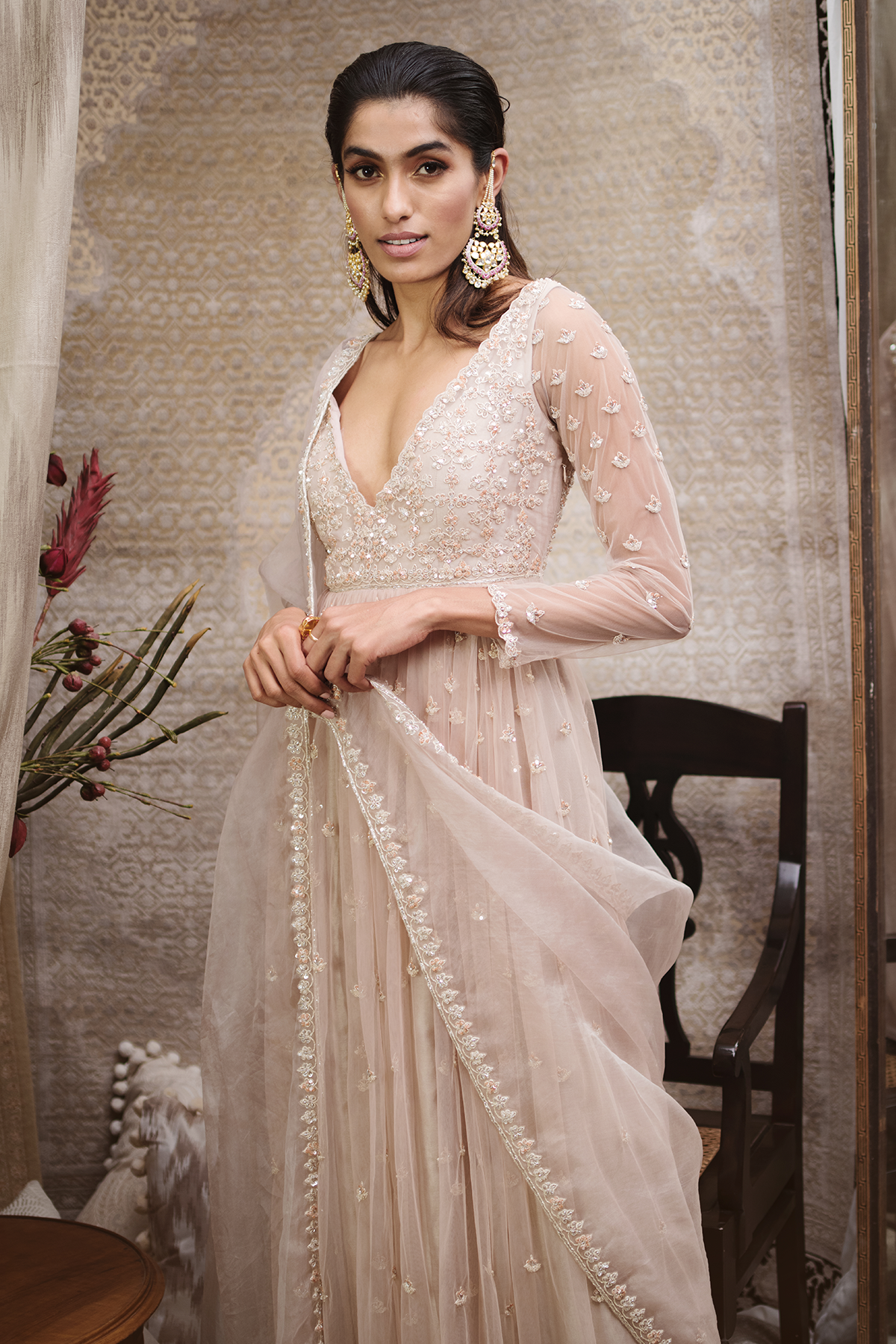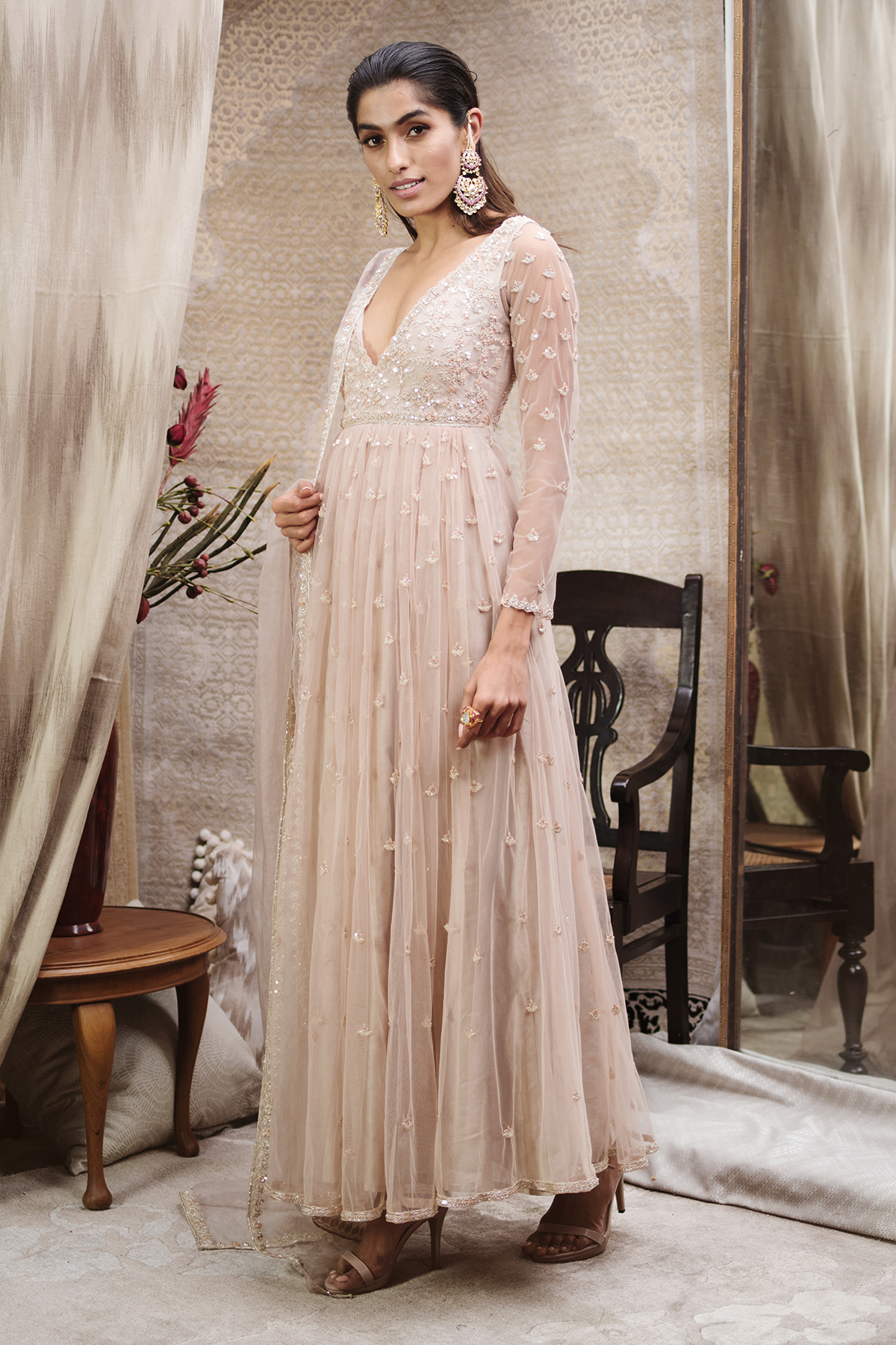 Scalloped V neck Line Net Anarkali with Organza Dupatta and Churidar