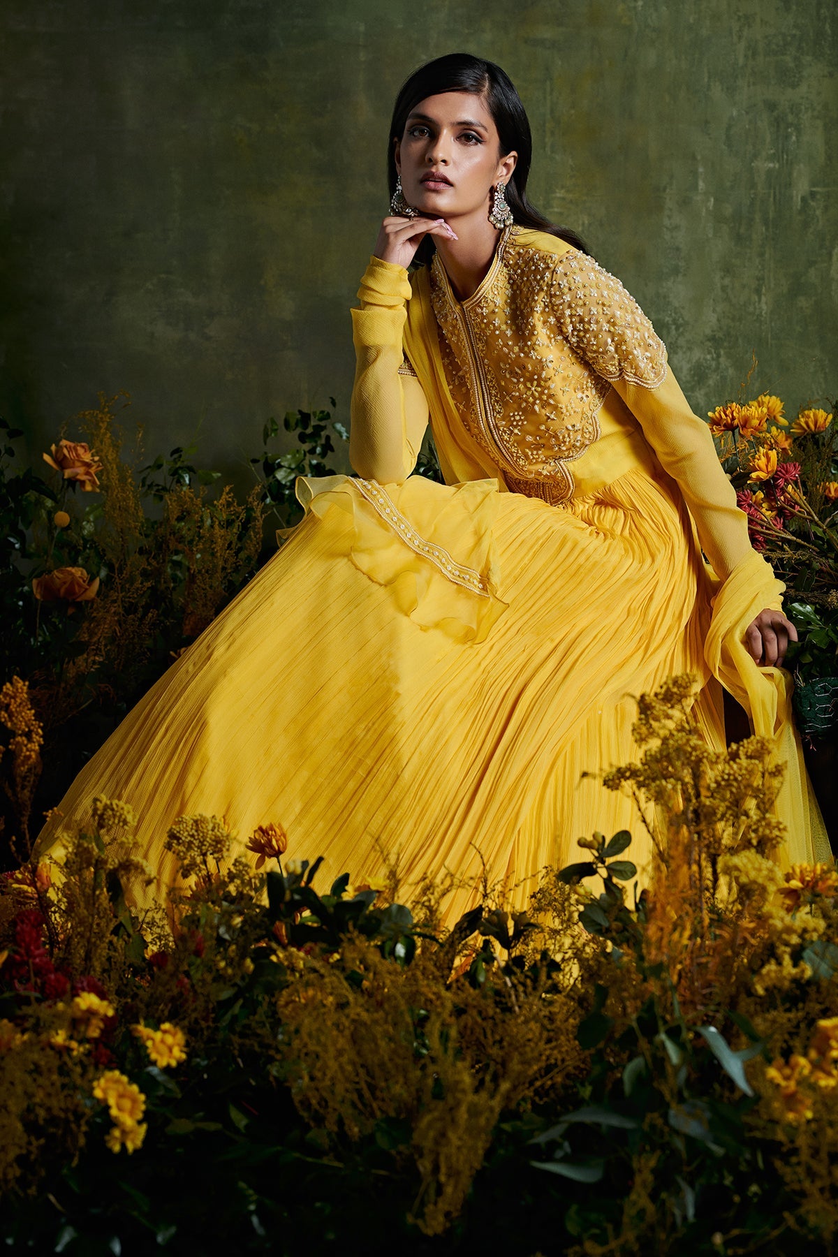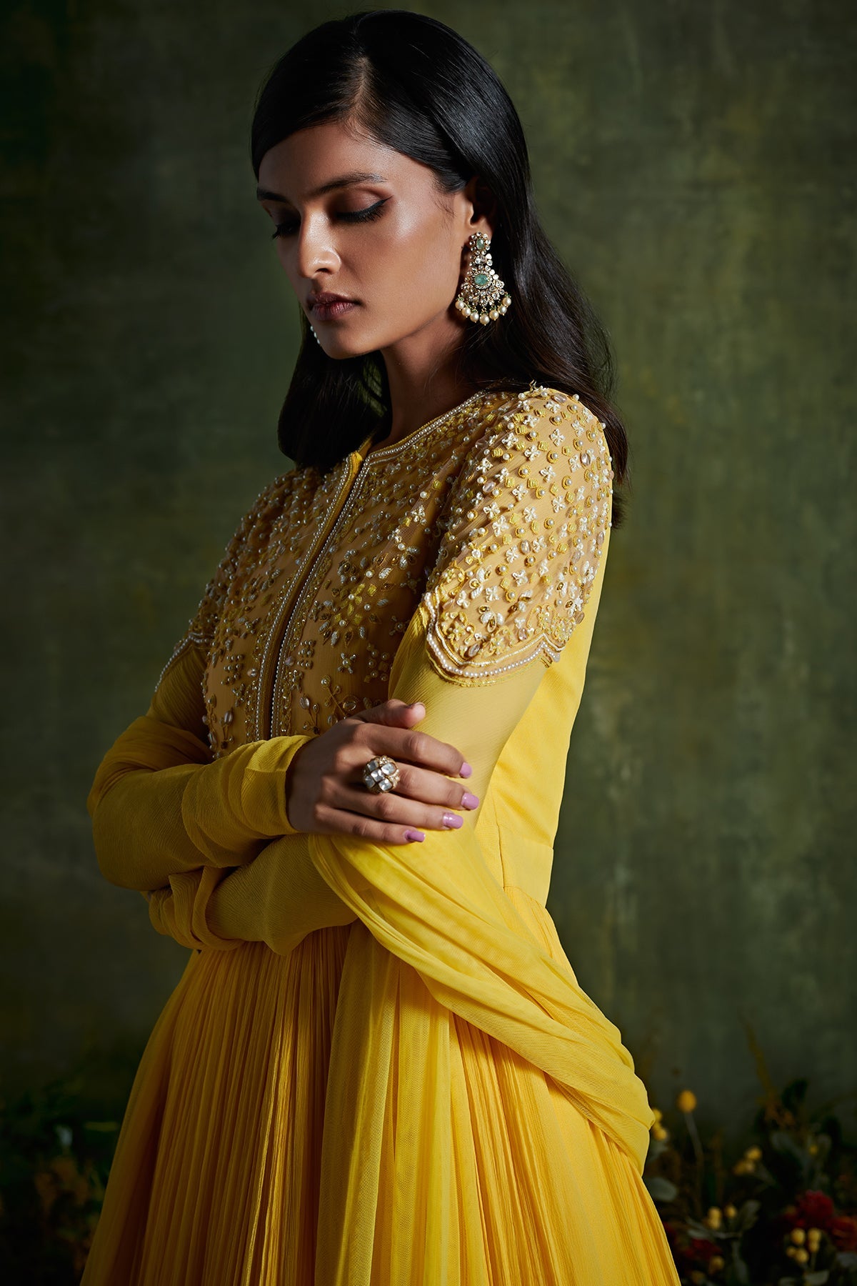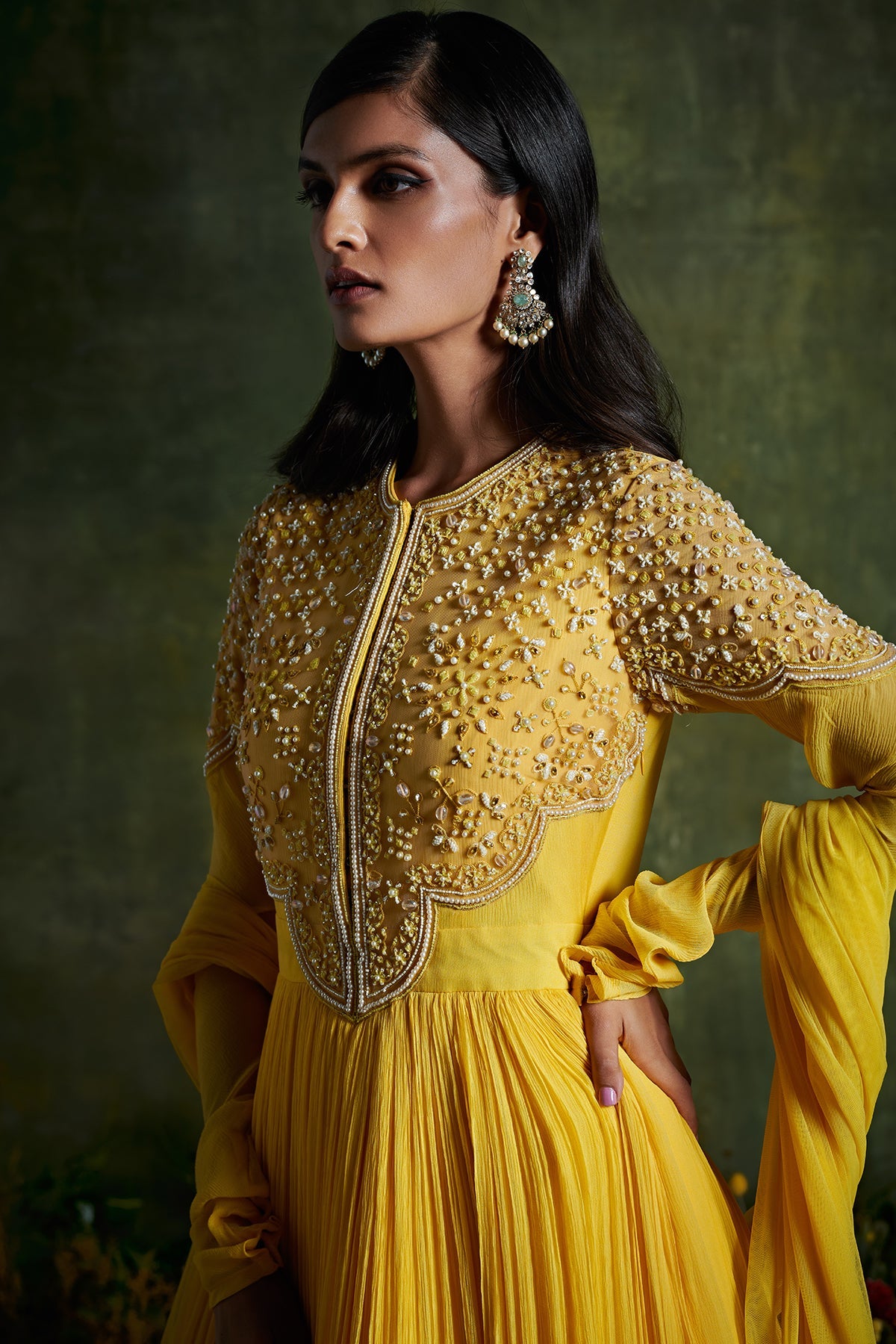 Chiffon rushed anarkali with embroidered torso paired with a ruffled net dupatta.