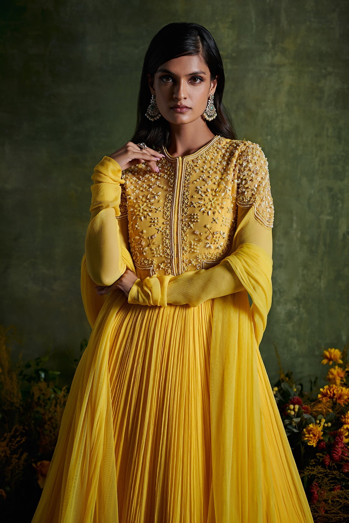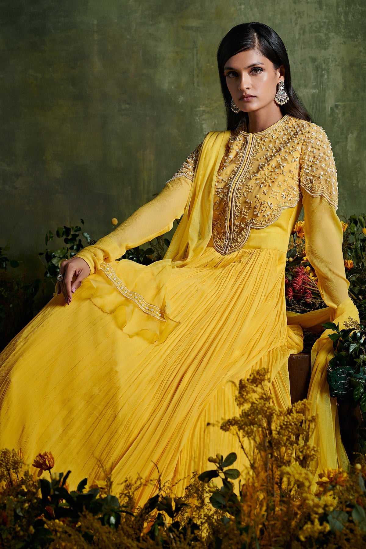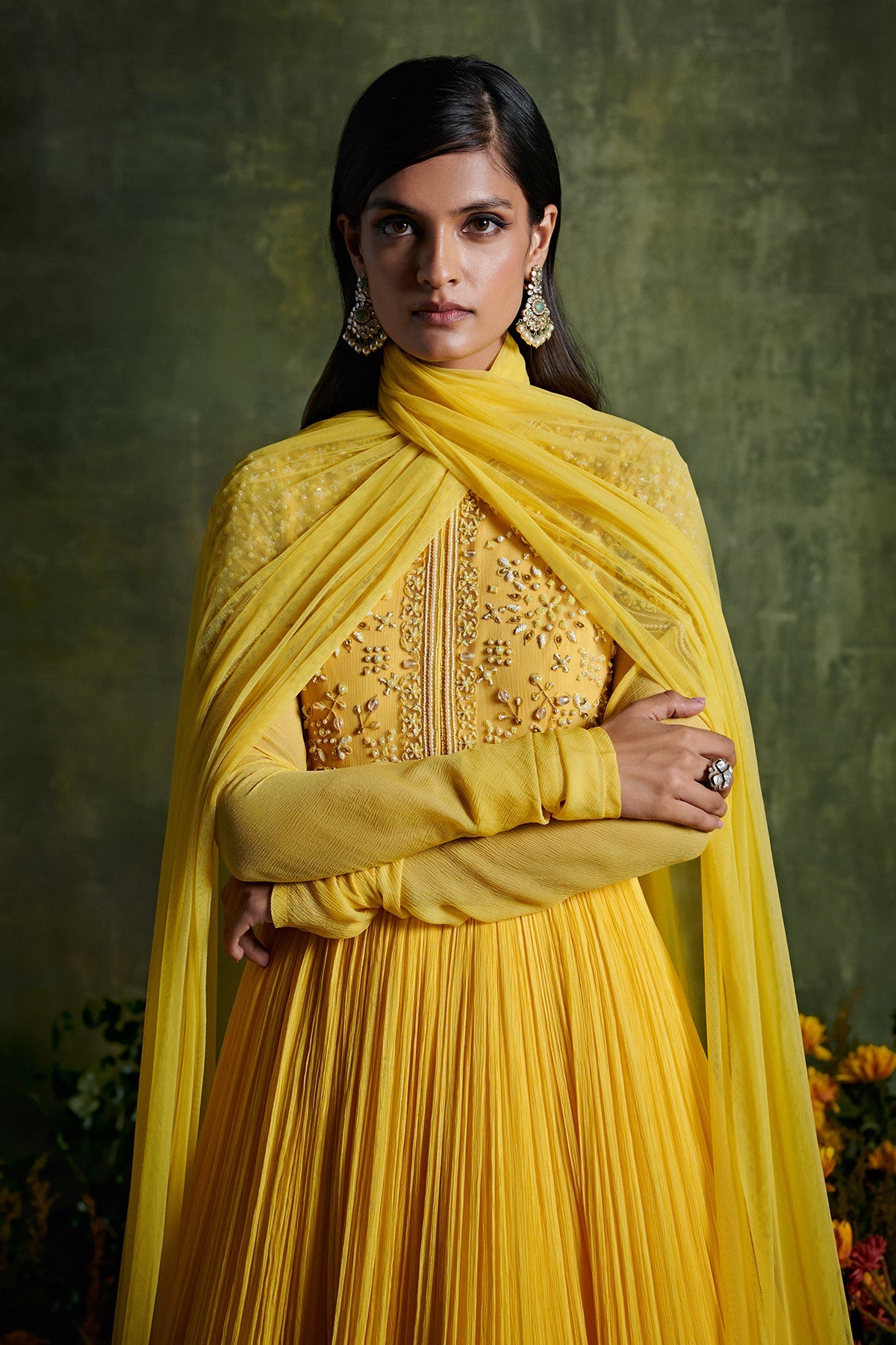 Chiffon rushed anarkali with embroidered torso paired with a ruffled net dupatta.