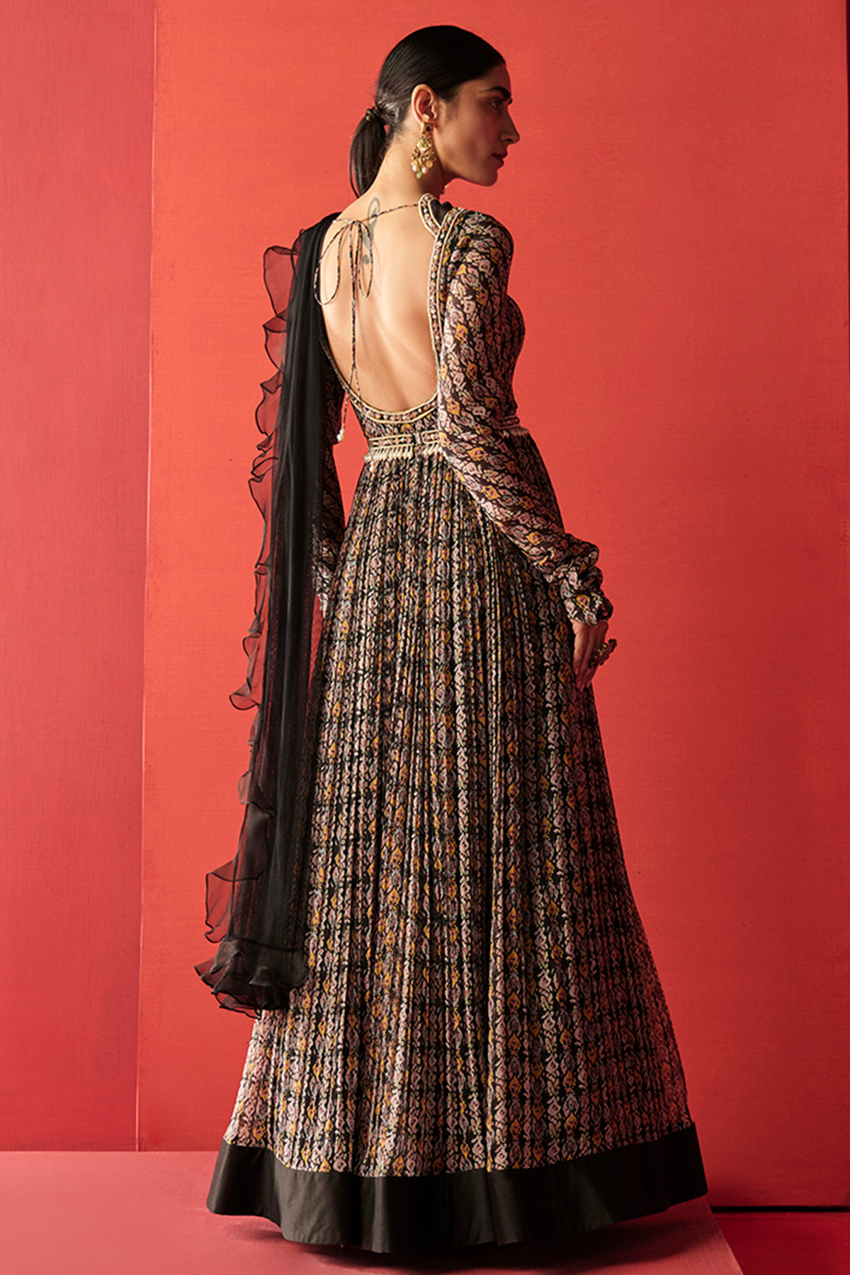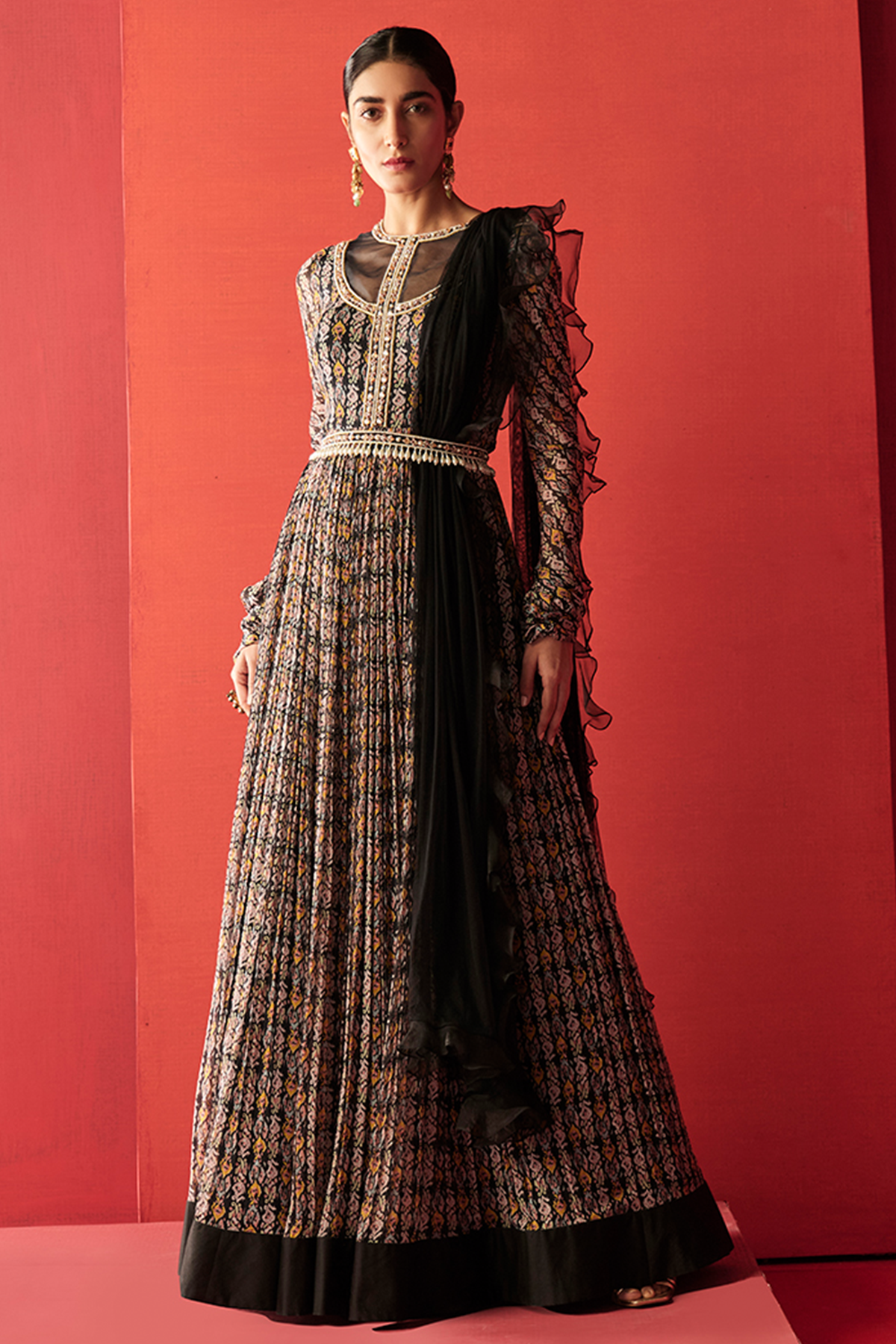 Black Multi Ikat printed and embroidered chiffon Anarkali paired with a net dupatta and an embroidered belt