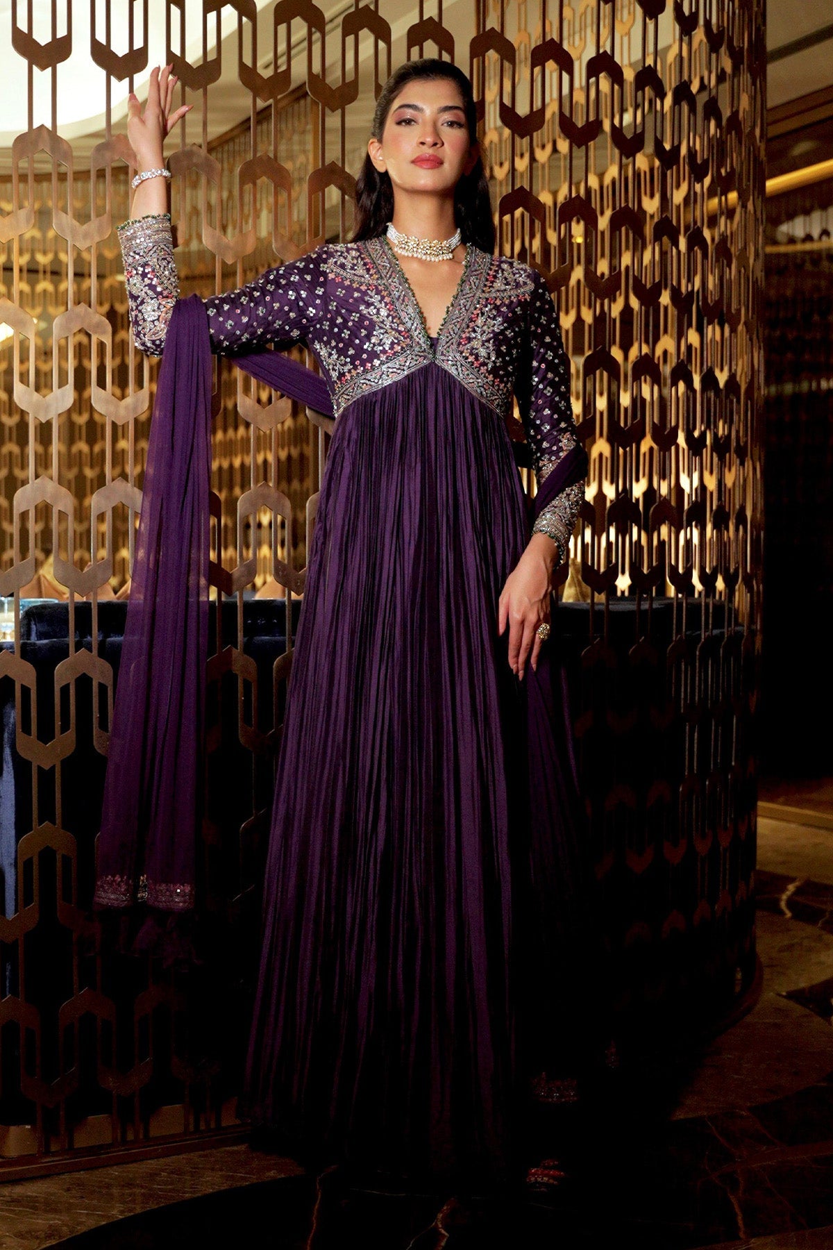 Purple Fine Silk Embroidered Long Anarkali With Net Embroidered Dupatta