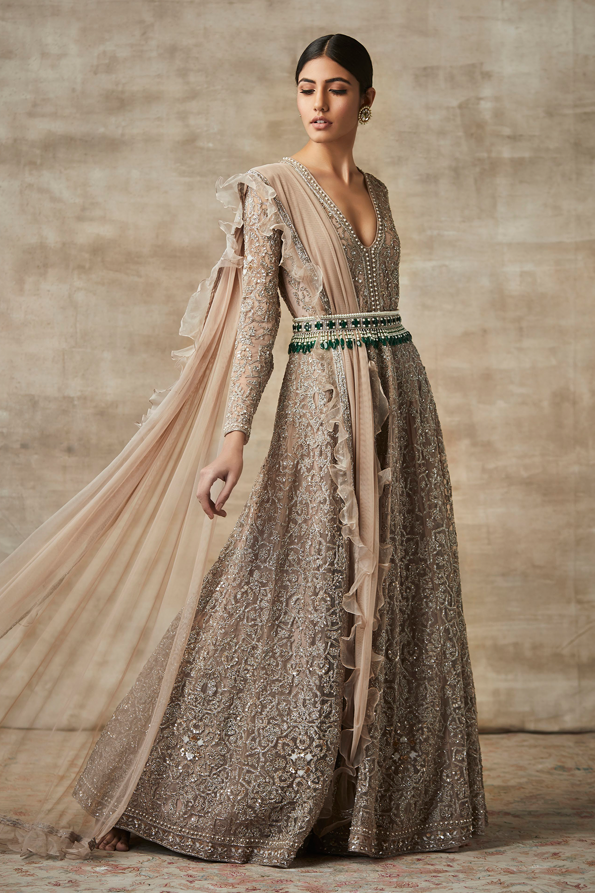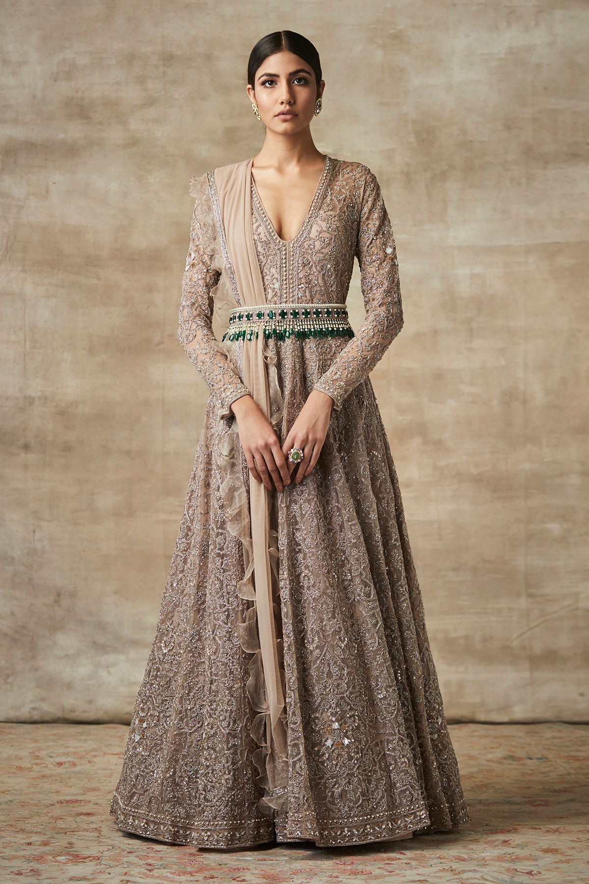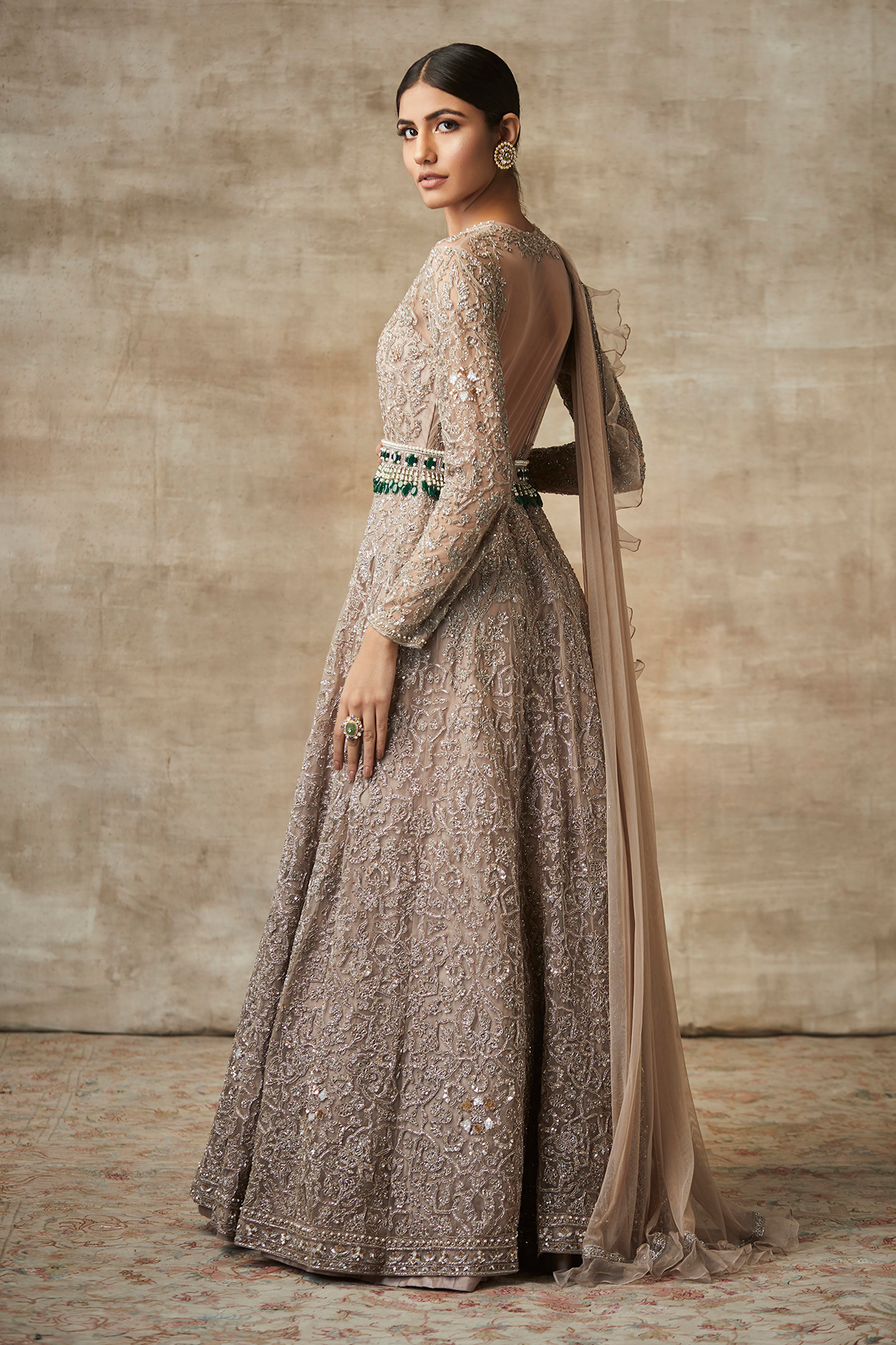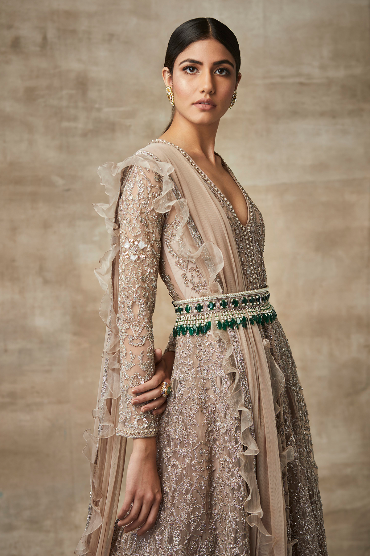 Embellished V-neck Anarkali with attached Dupatta and Jewel Belt.
