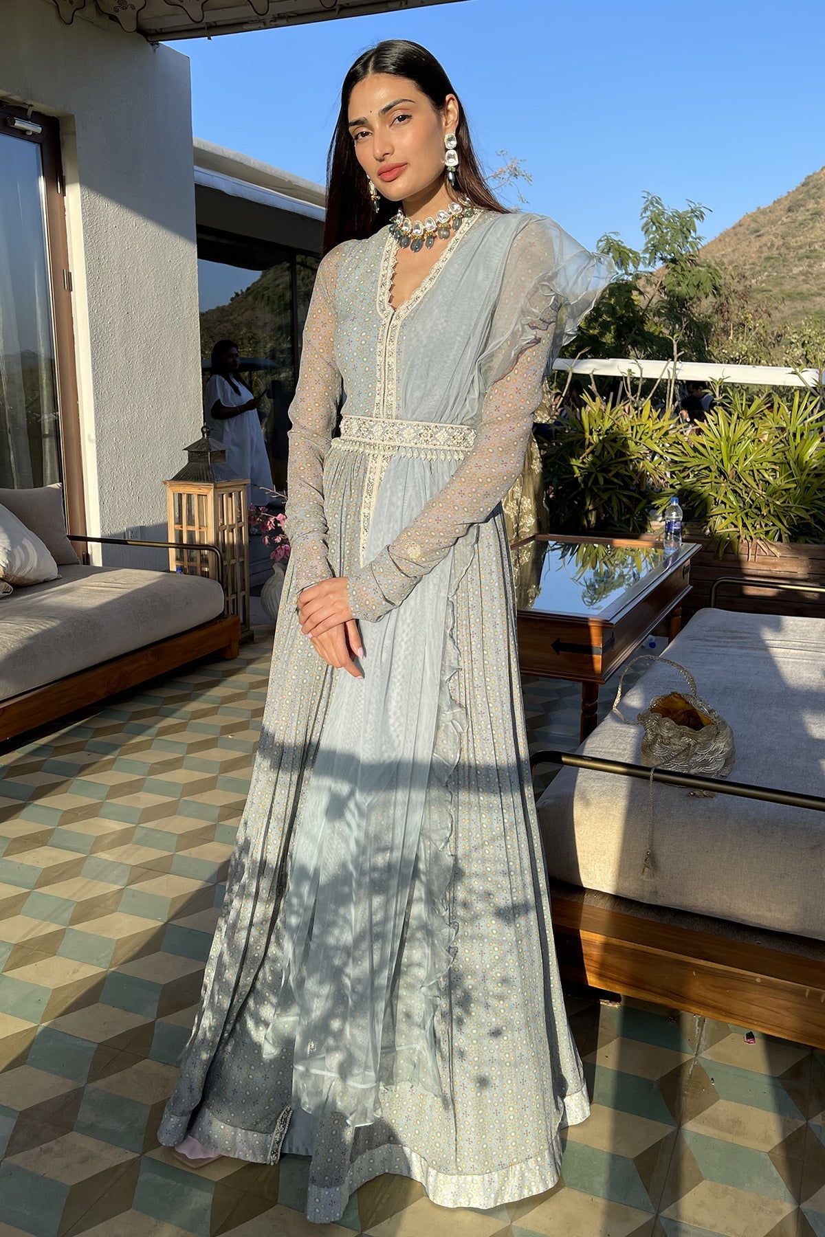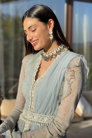 Powder blue folk printed and embroidered anarkali paired with net ruffled dupatta and an embroidered pearl drop belt.