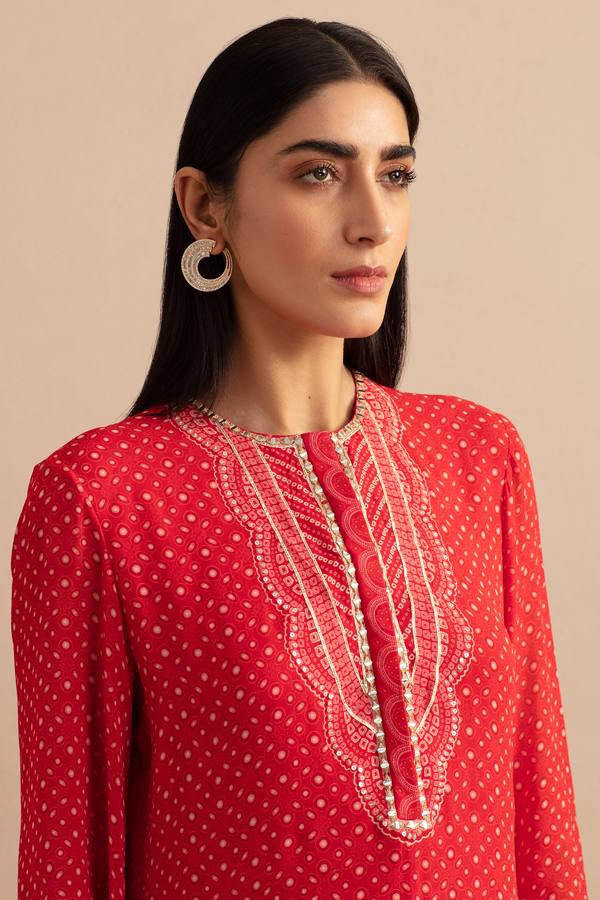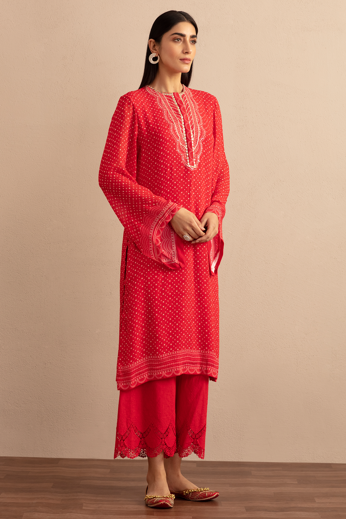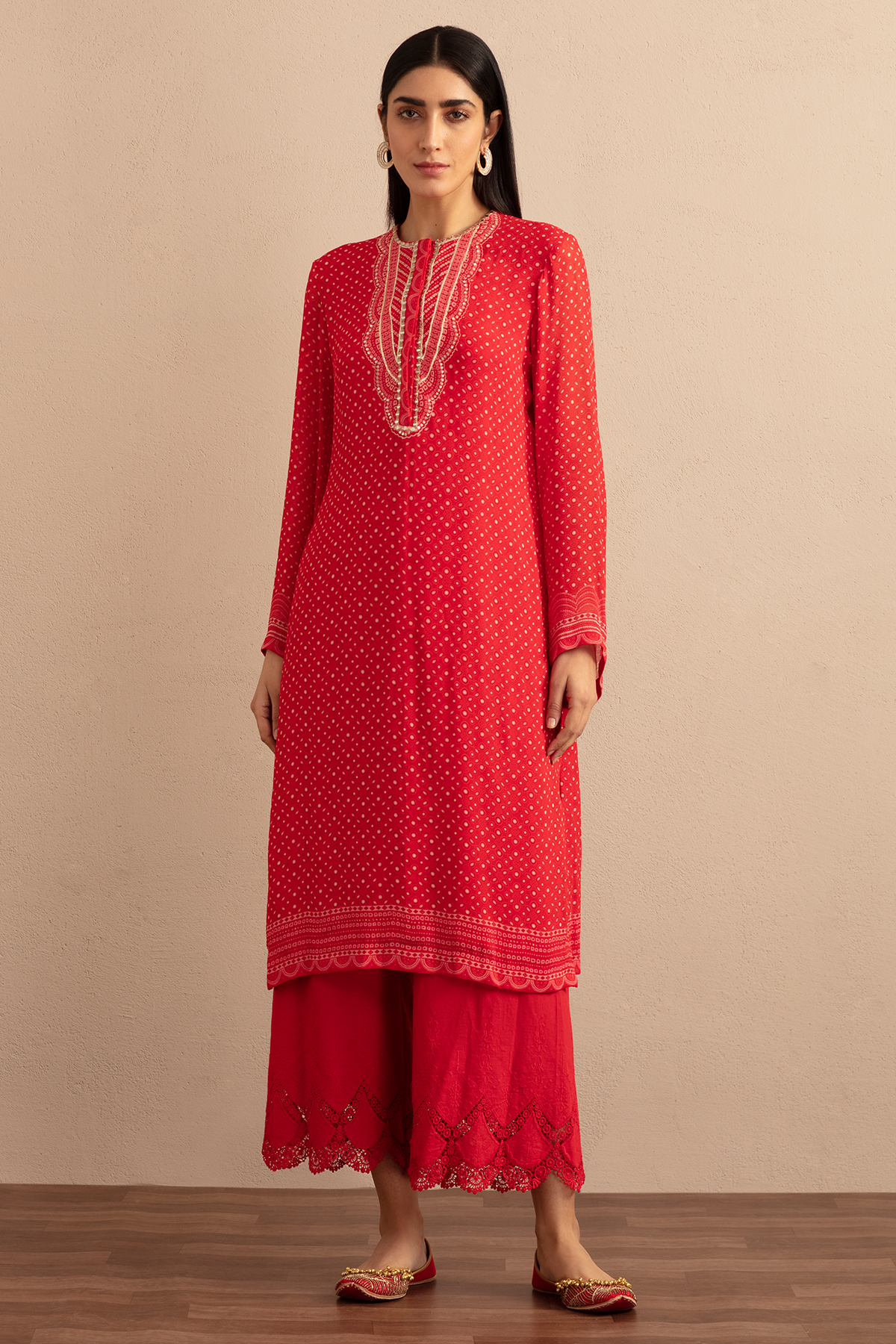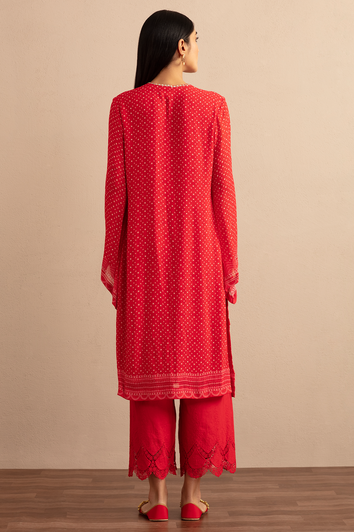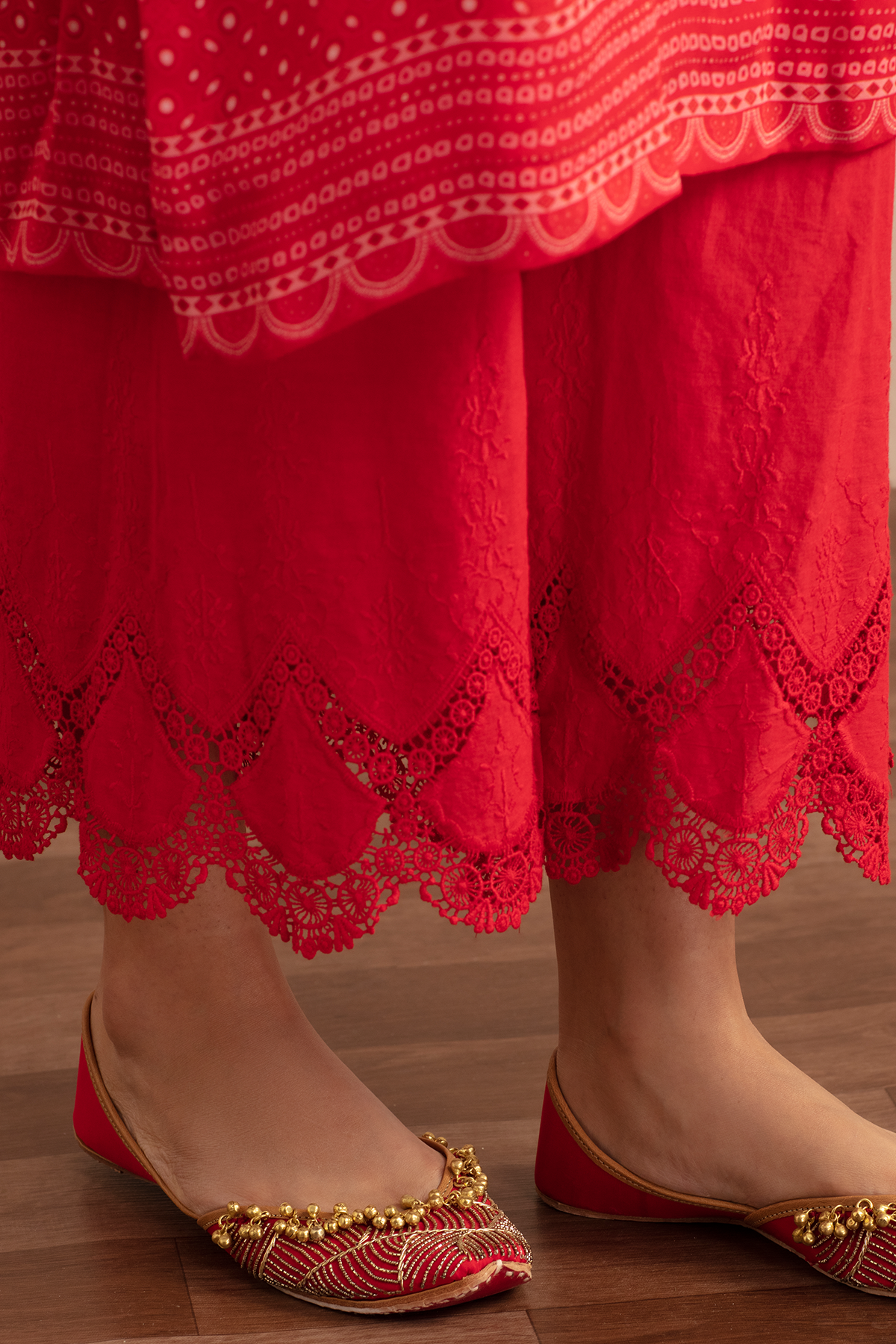 Red folk printed and embroidered georgette kurta. Solid schiffli cotton pants.