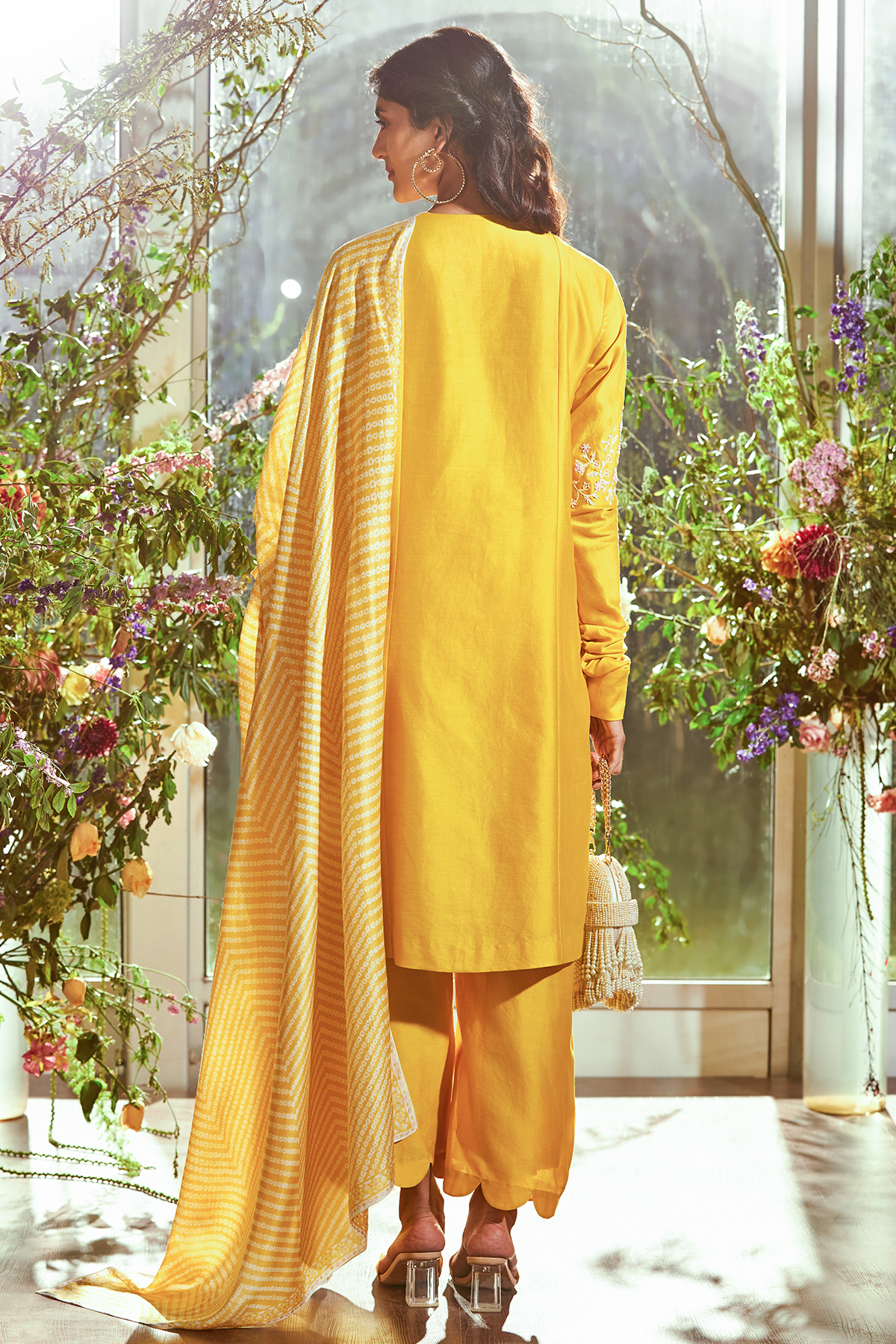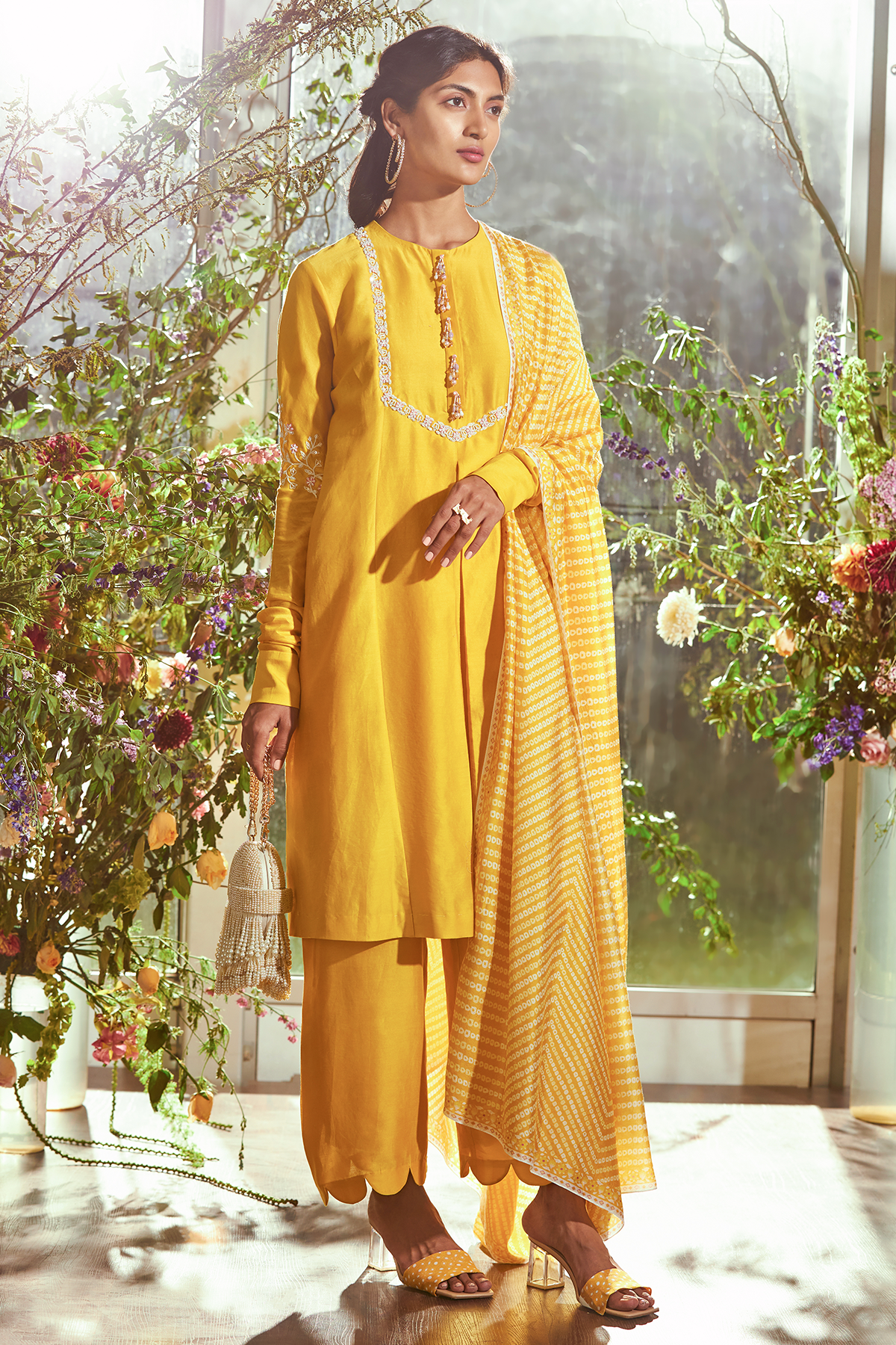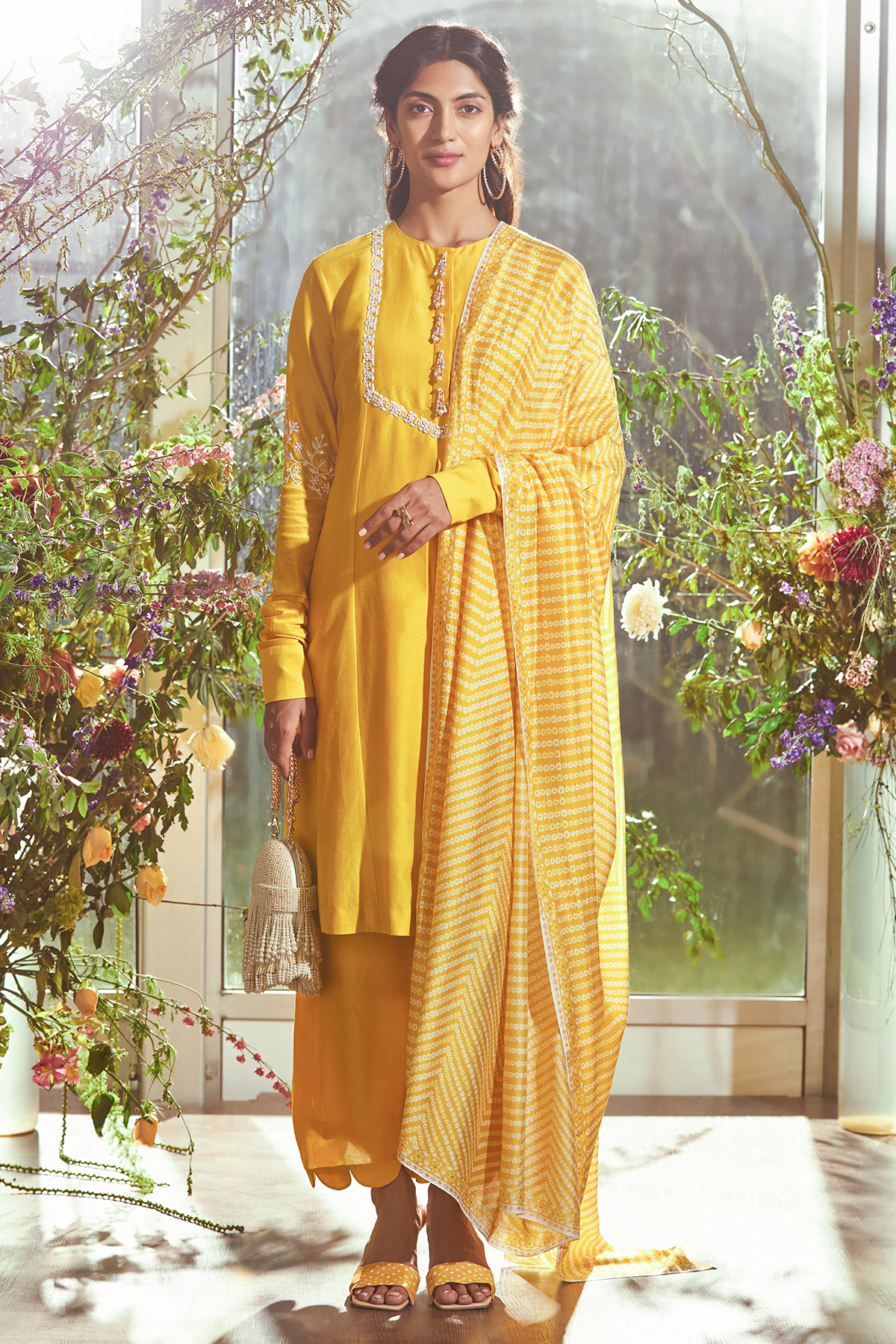 Yellow chanderi embroidered kurta-pants set with Bandhani printed fine silk dupatta.