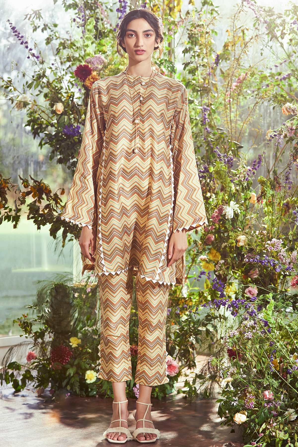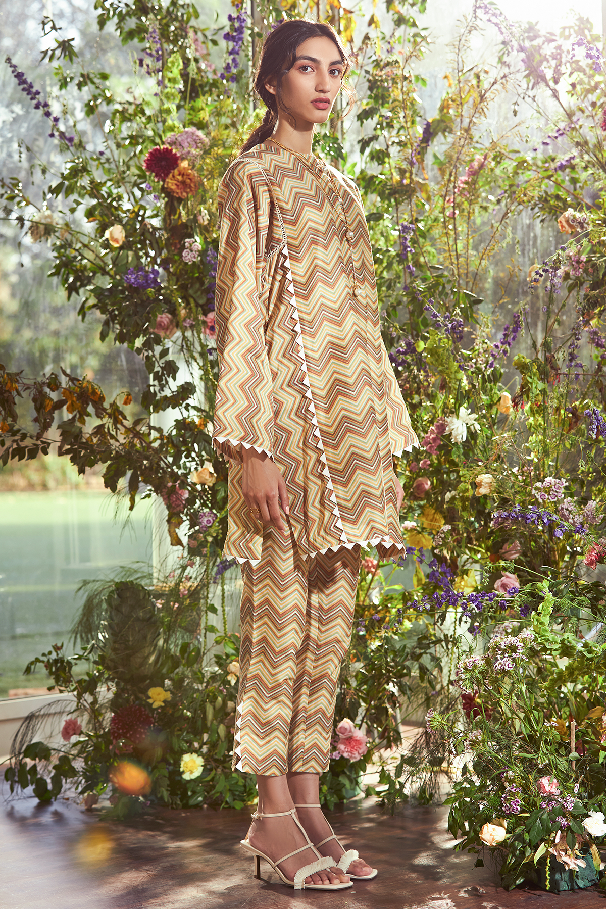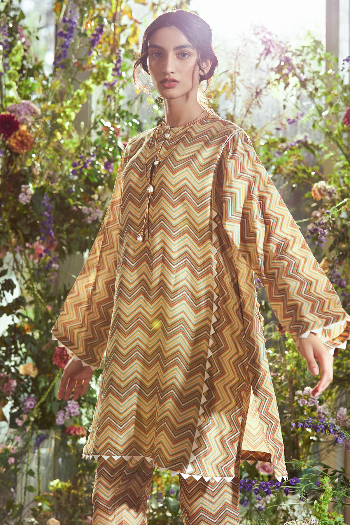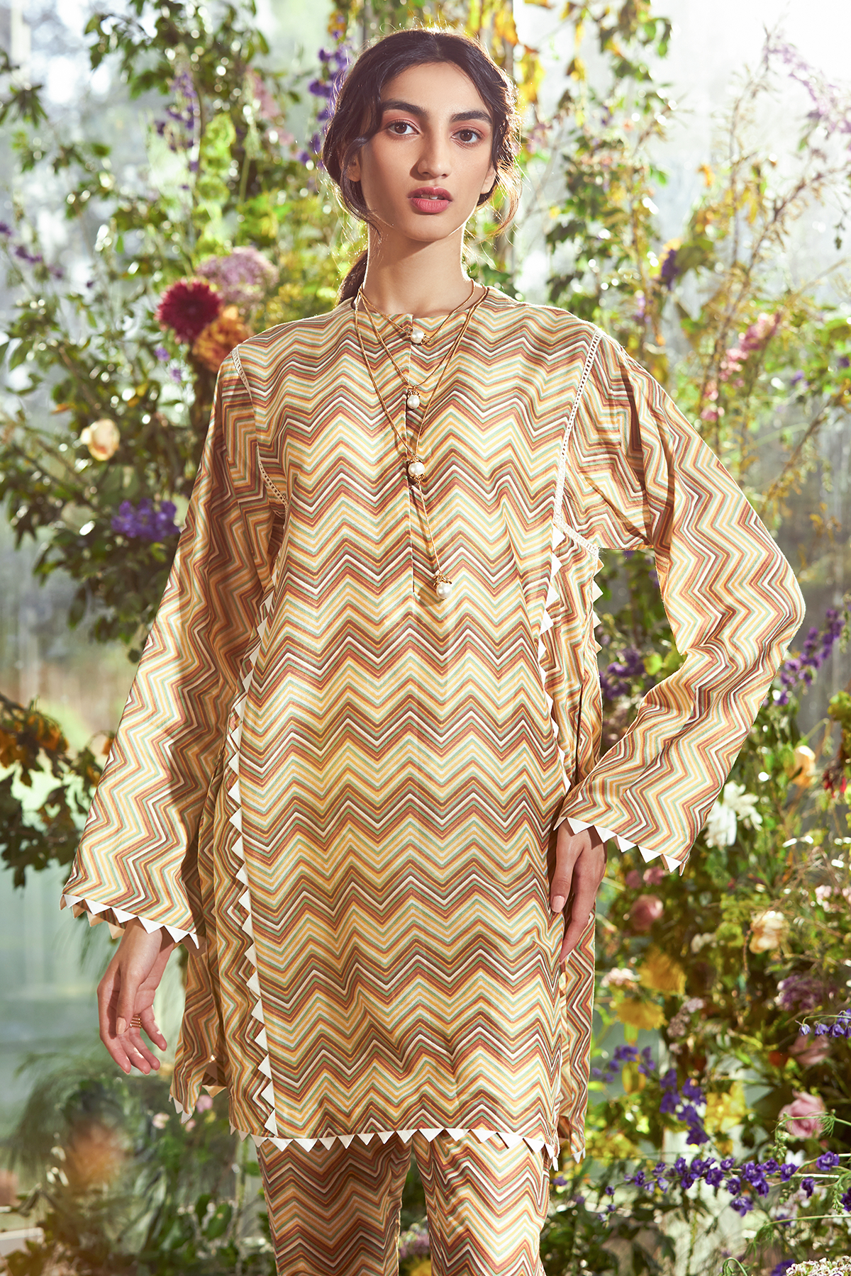 Yellow chevron printed chanderi kurta. Yellow chevron printed pants.