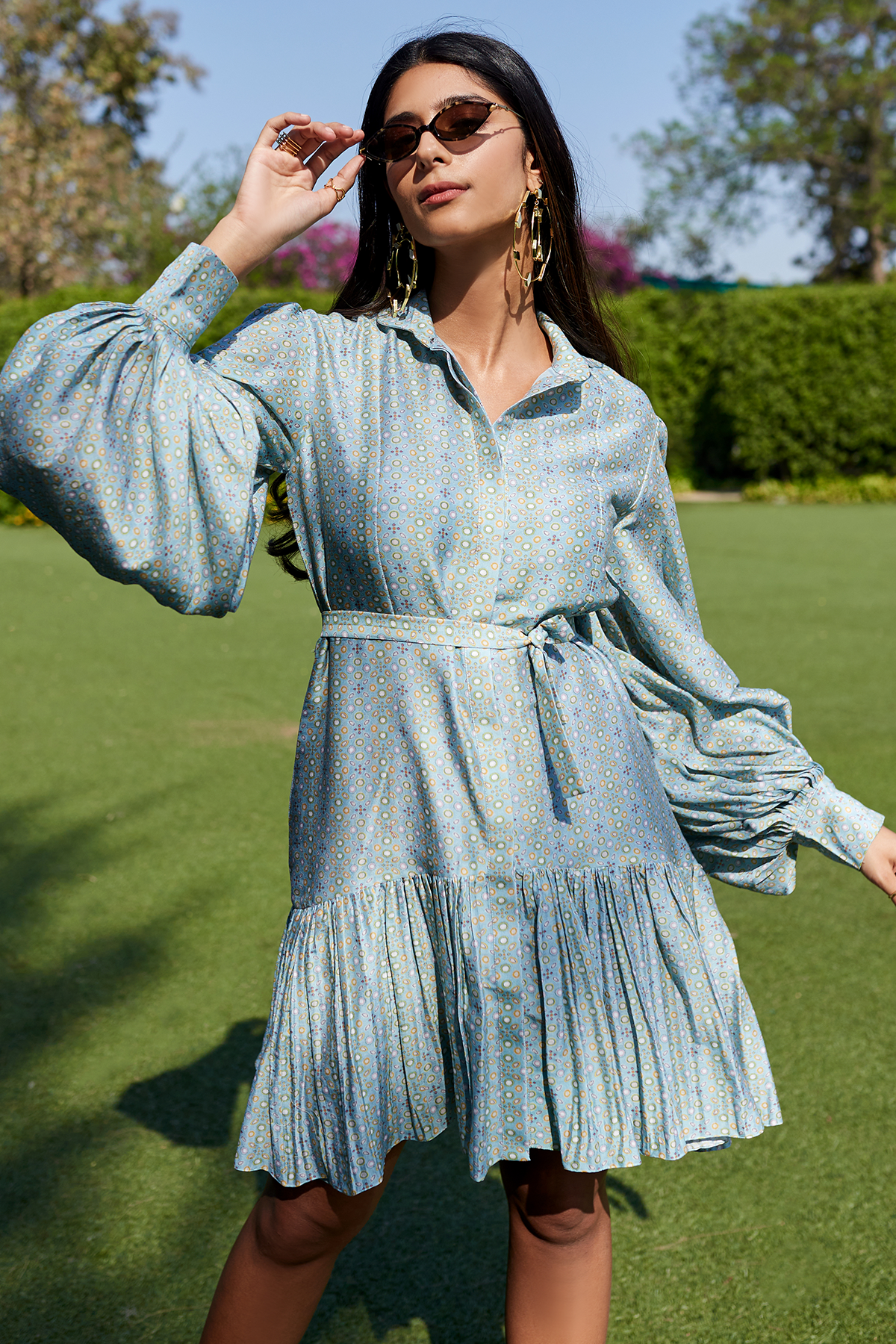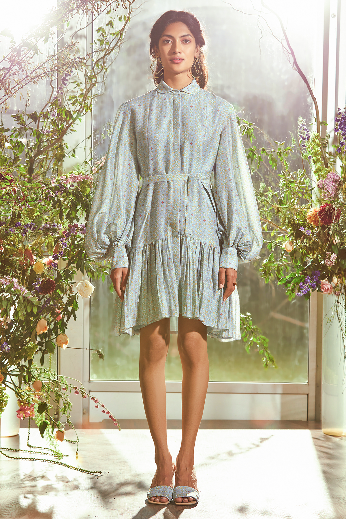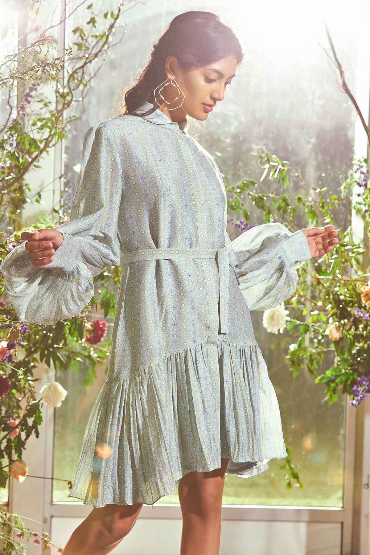 Powder blue folk printed chanderi frill dress with tie up fabric belt.