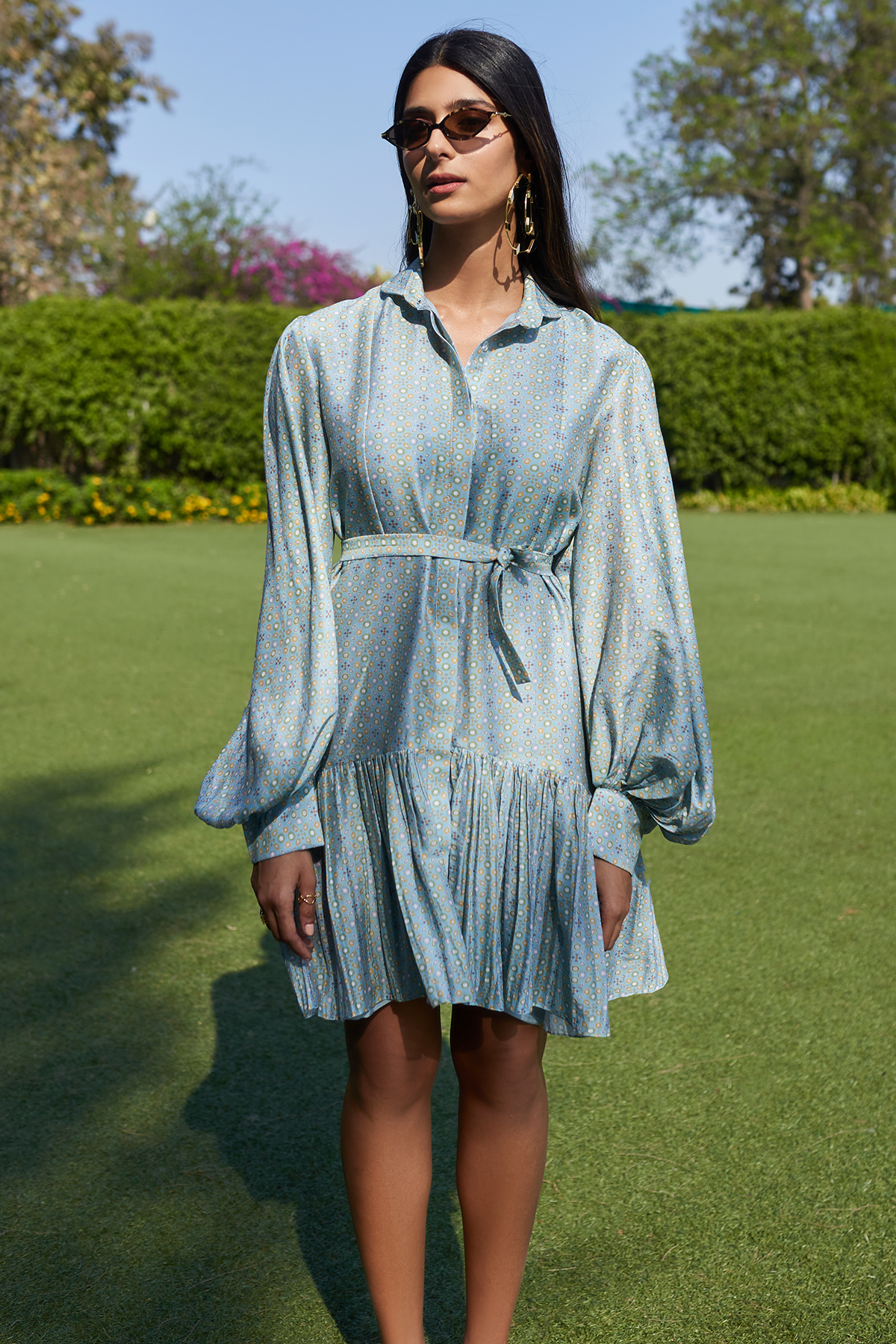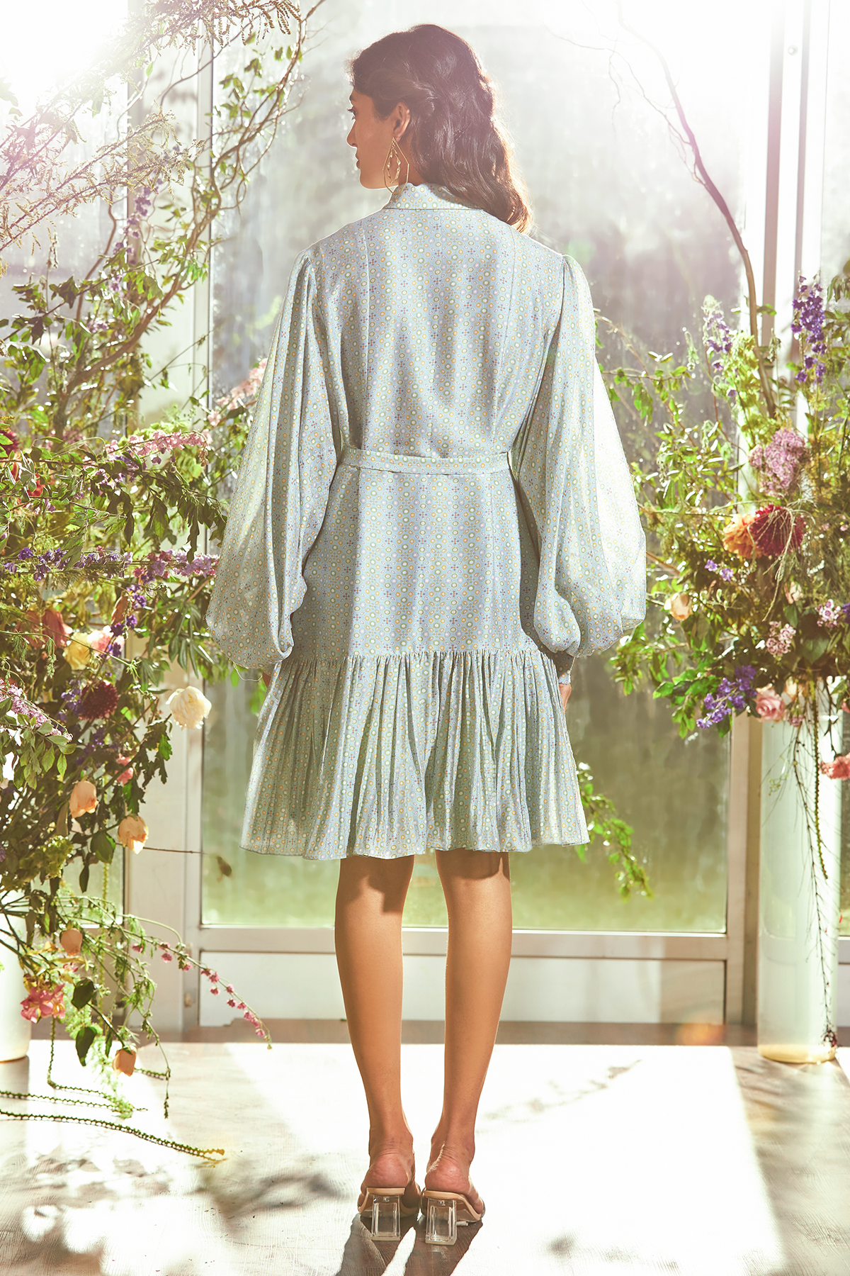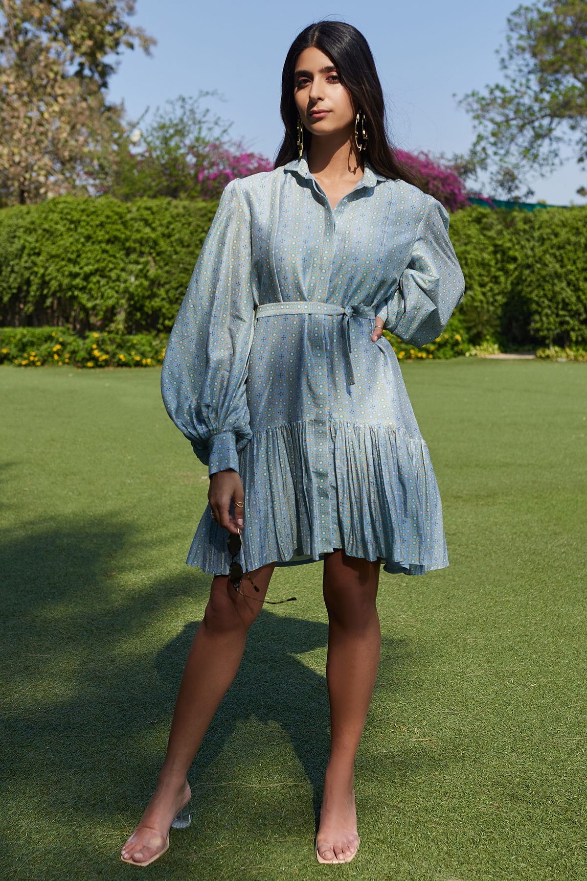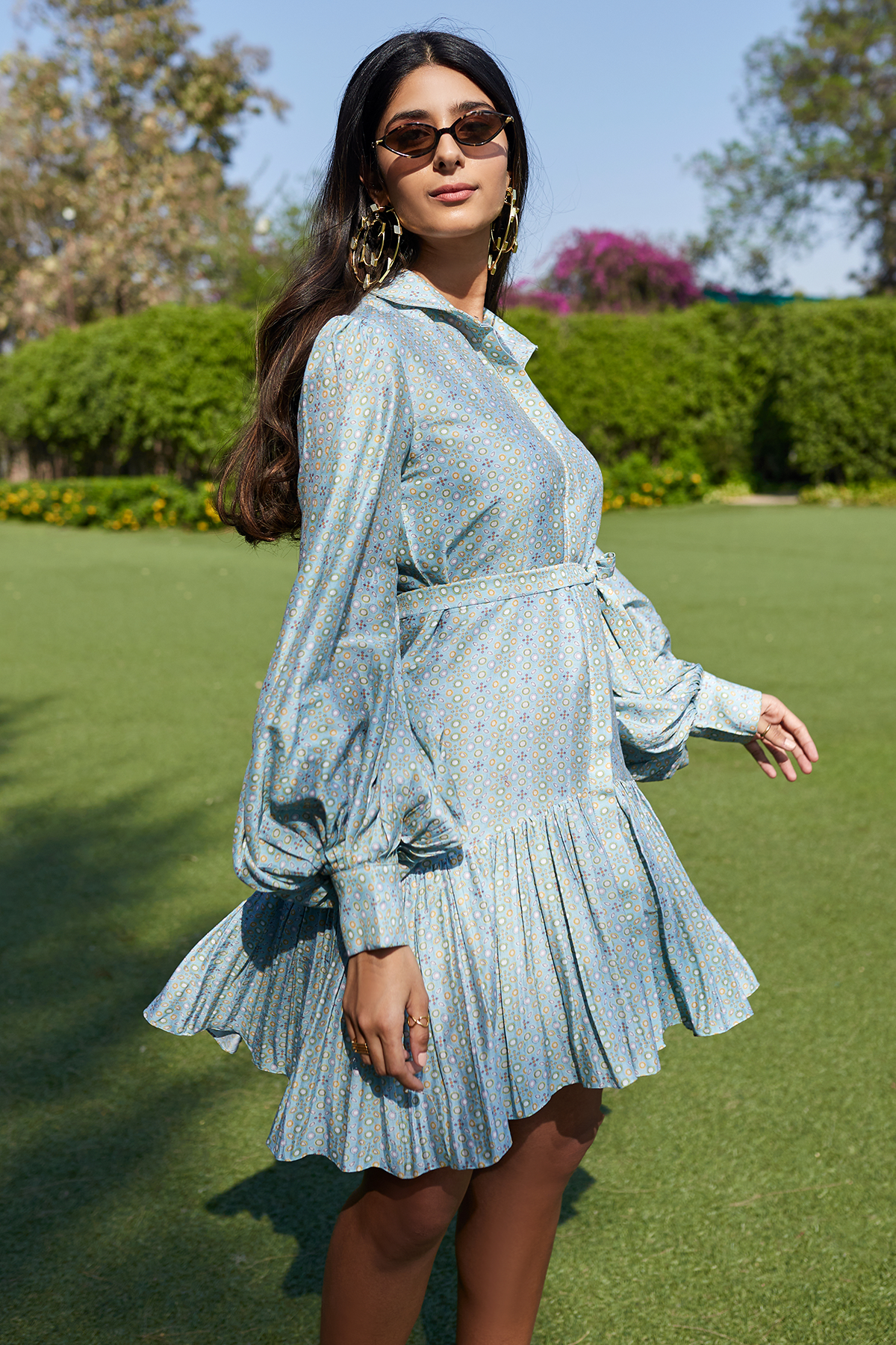 Powder blue folk printed chanderi frill dress with tie up fabric belt.