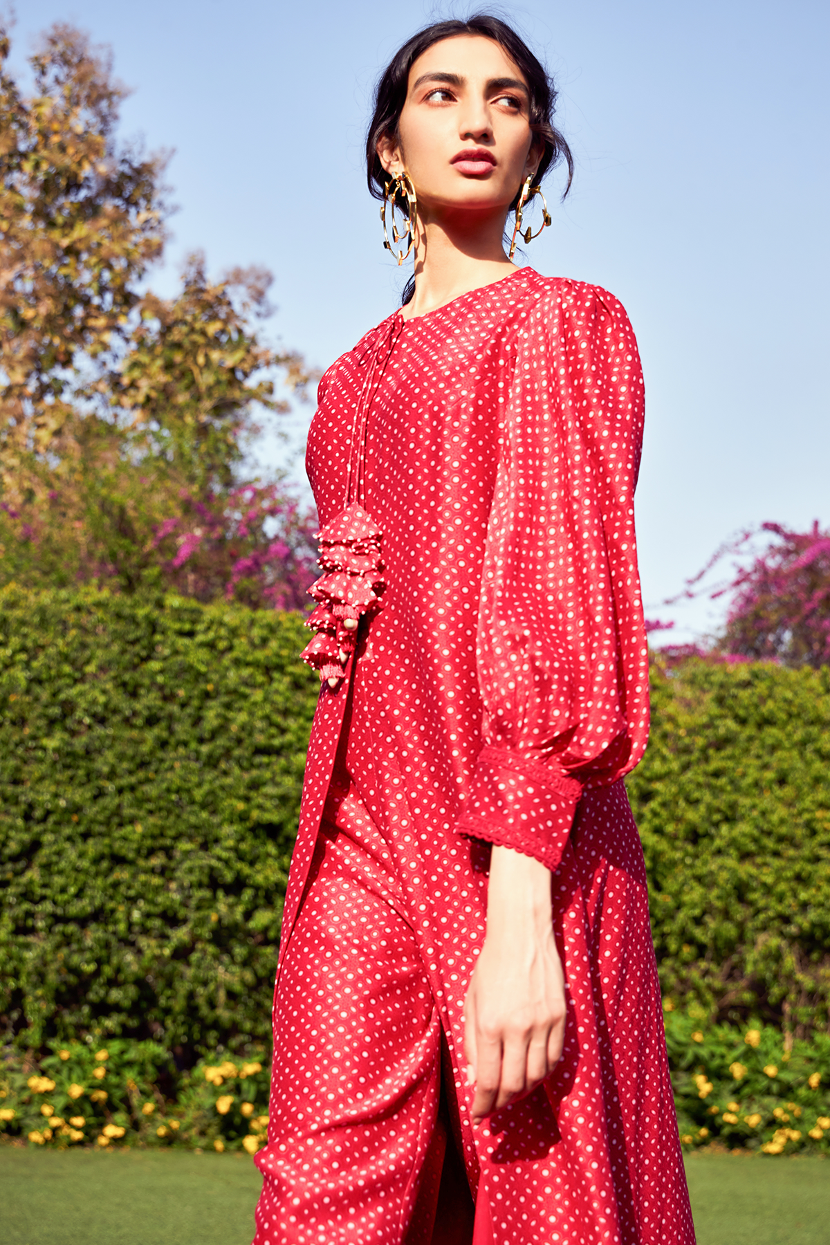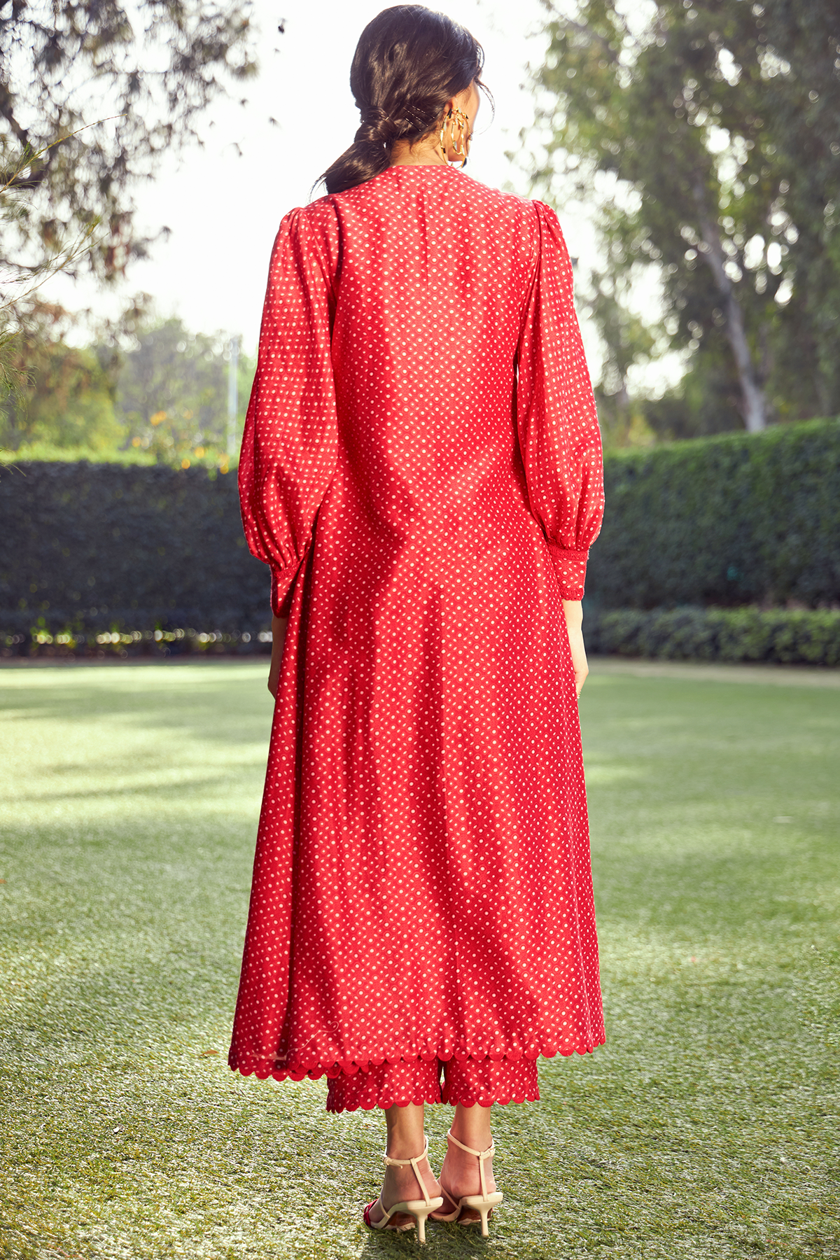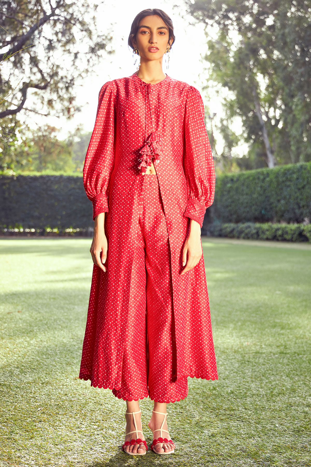 Red folk printed chanderi long front open kurta. Red folk printed chanderi pants.