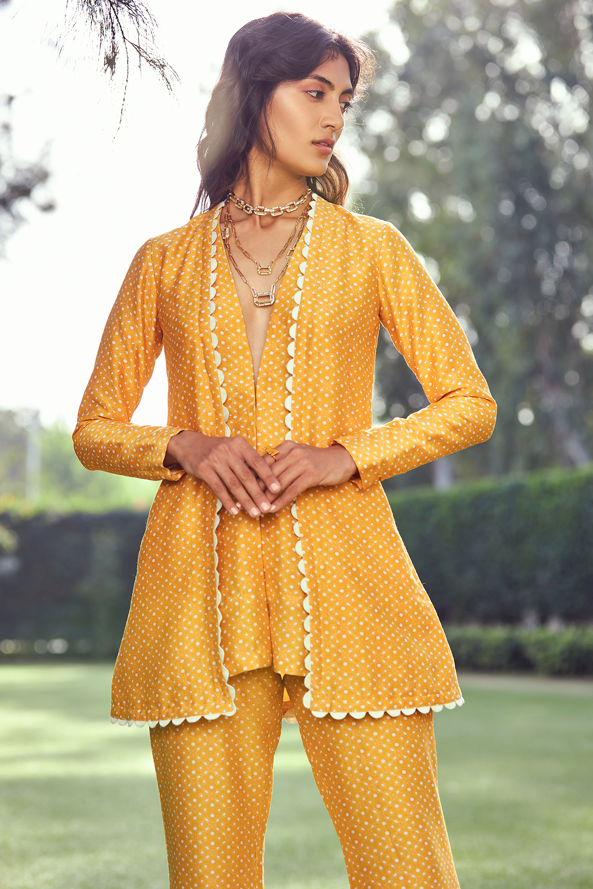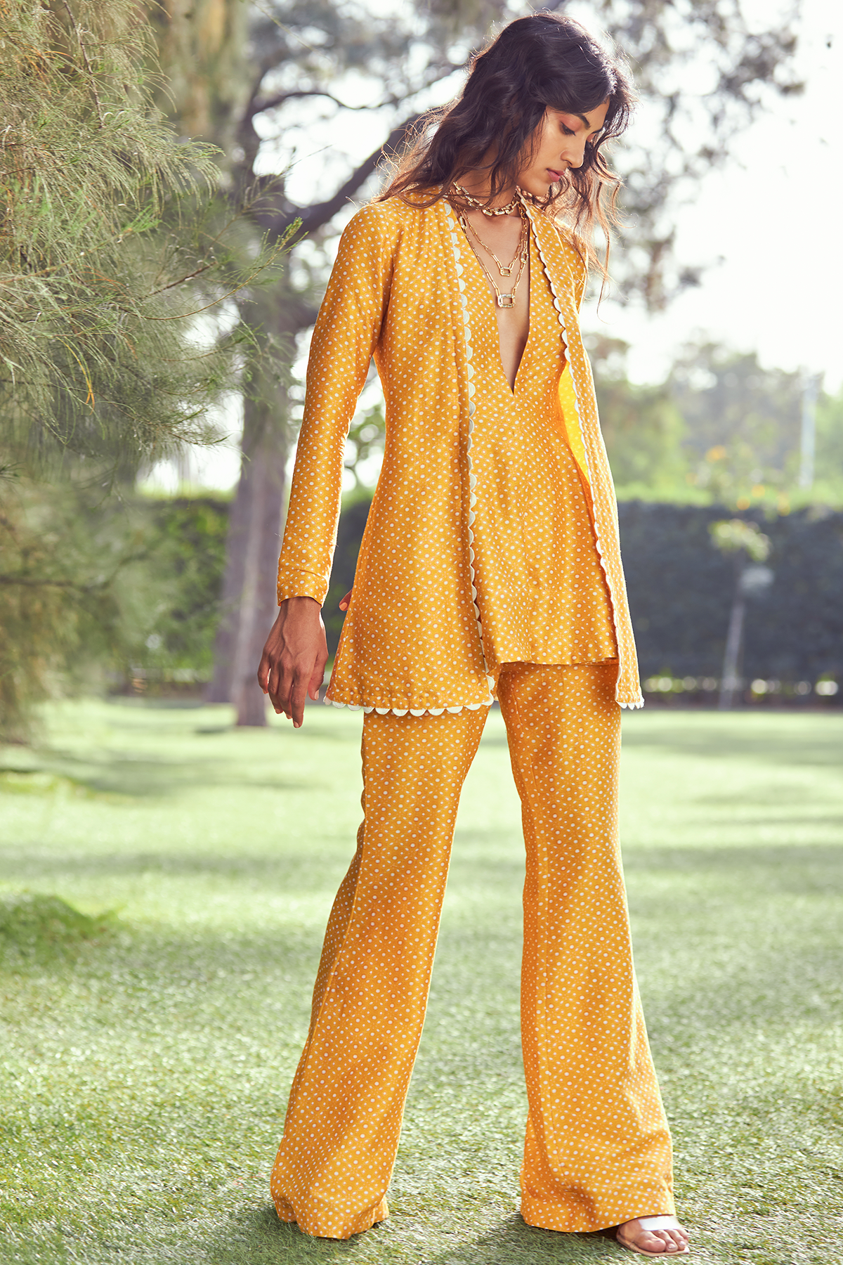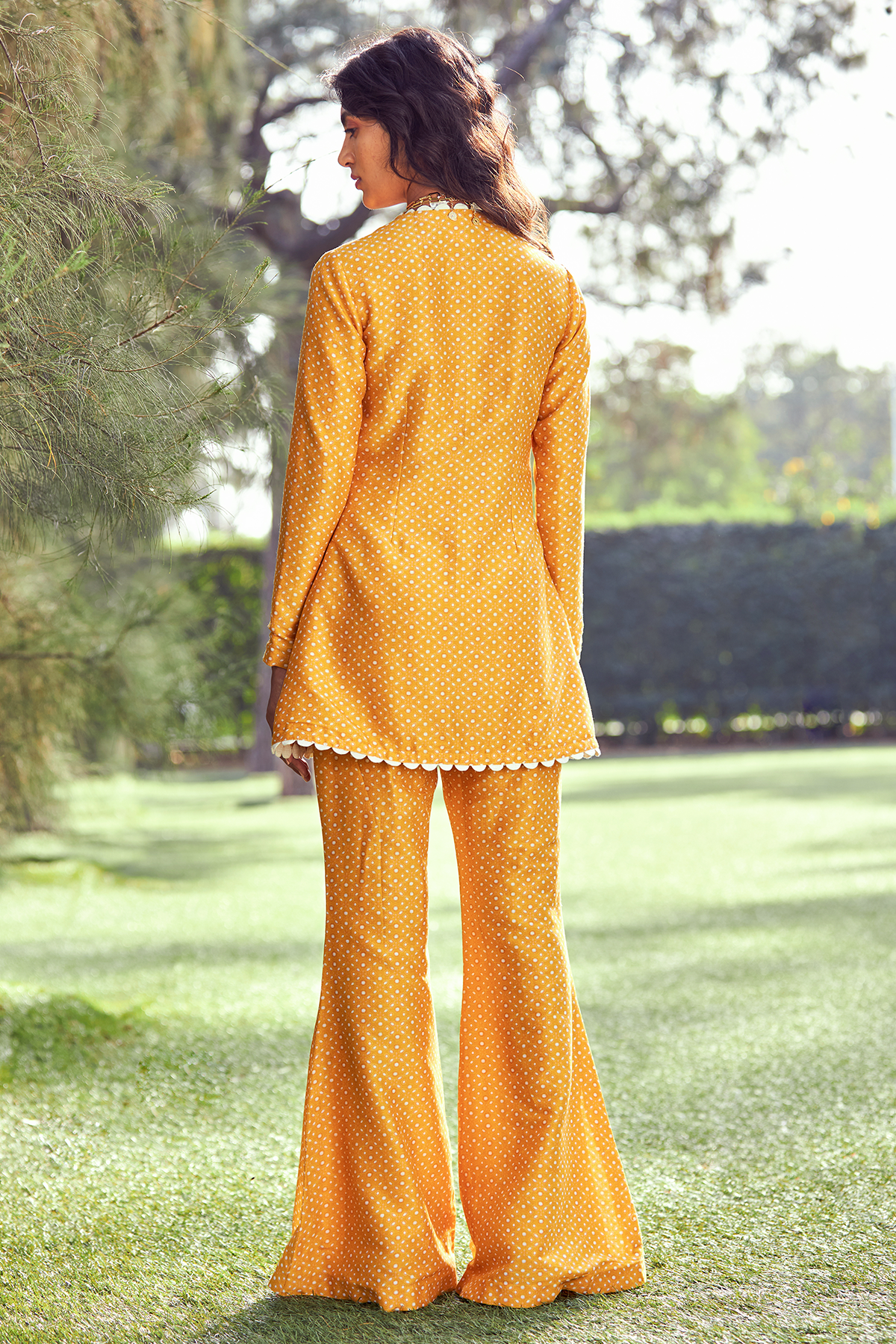 Yellow folk printed chanderi two layered peplum top. Yellow folk printed chanderi flared pants.