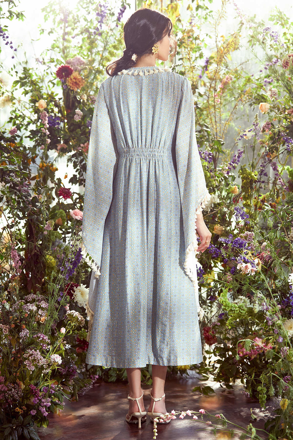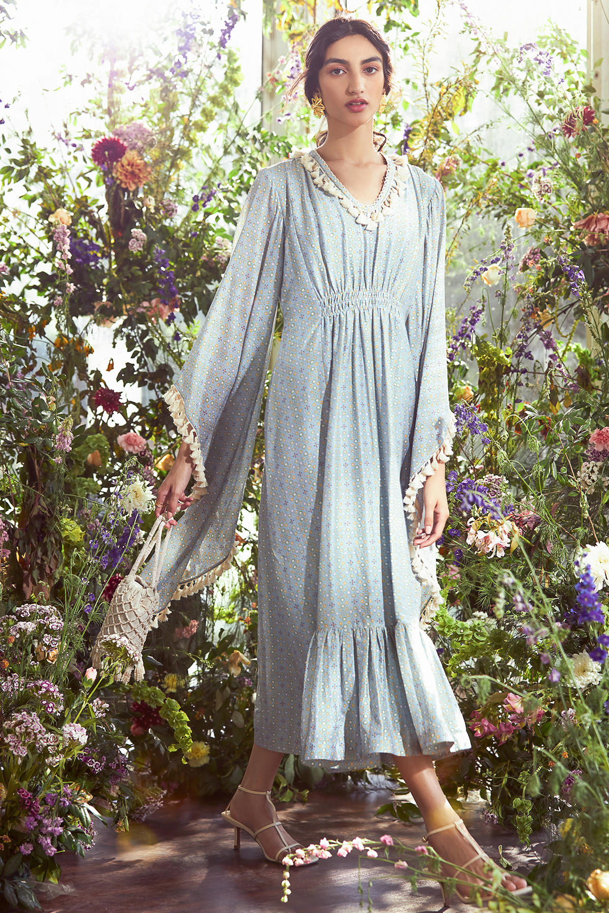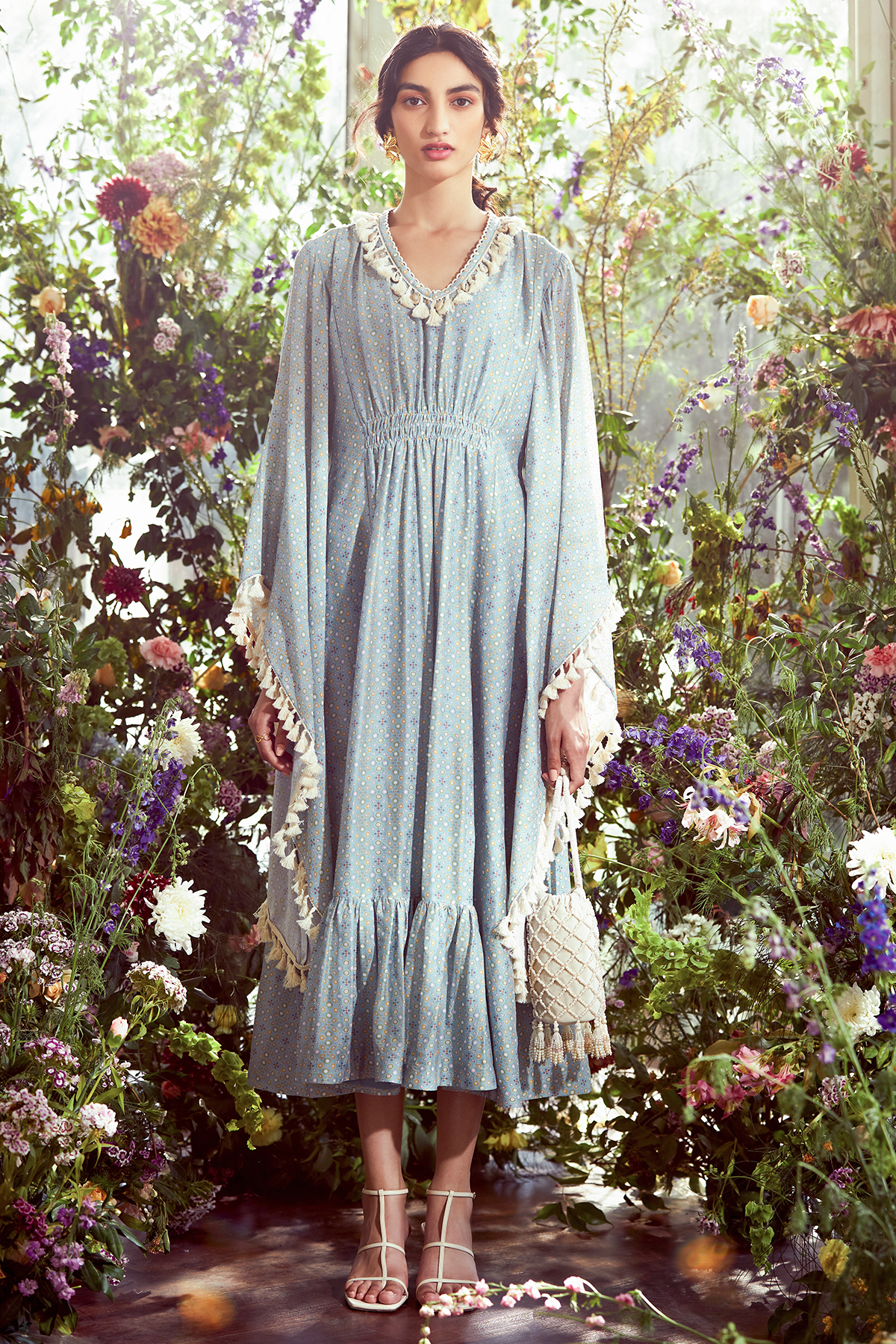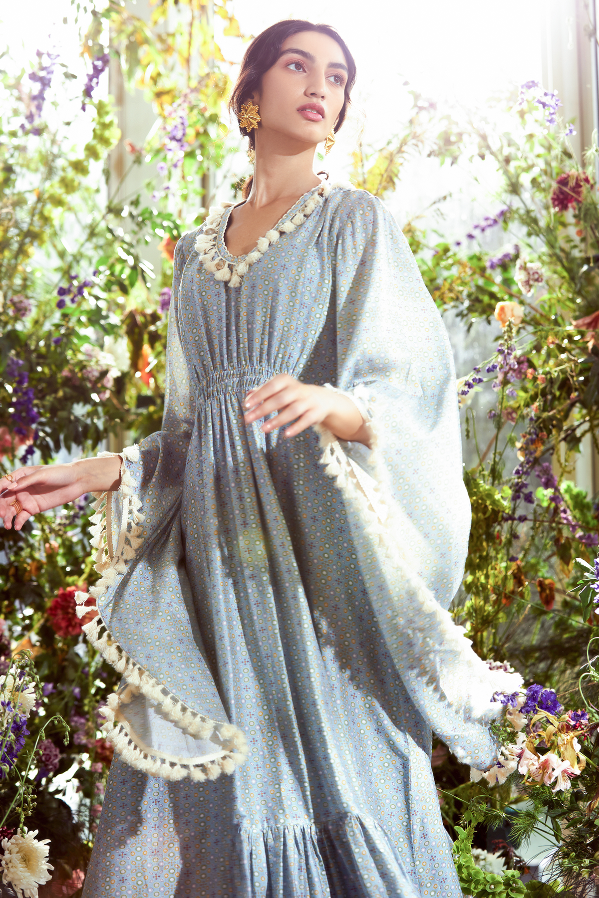 Powder blue floral printed chanderi kaftan.