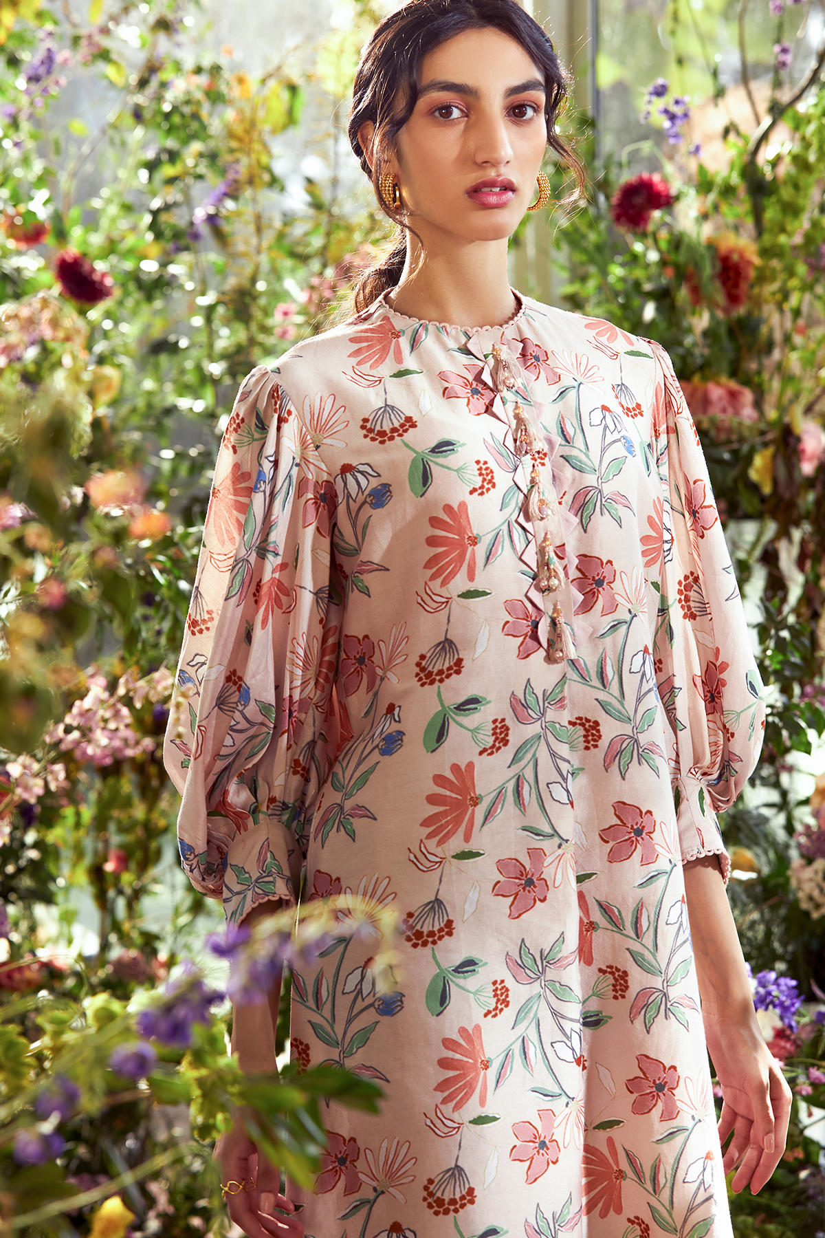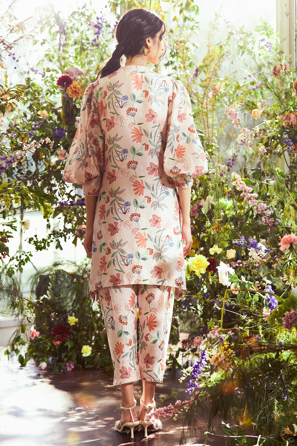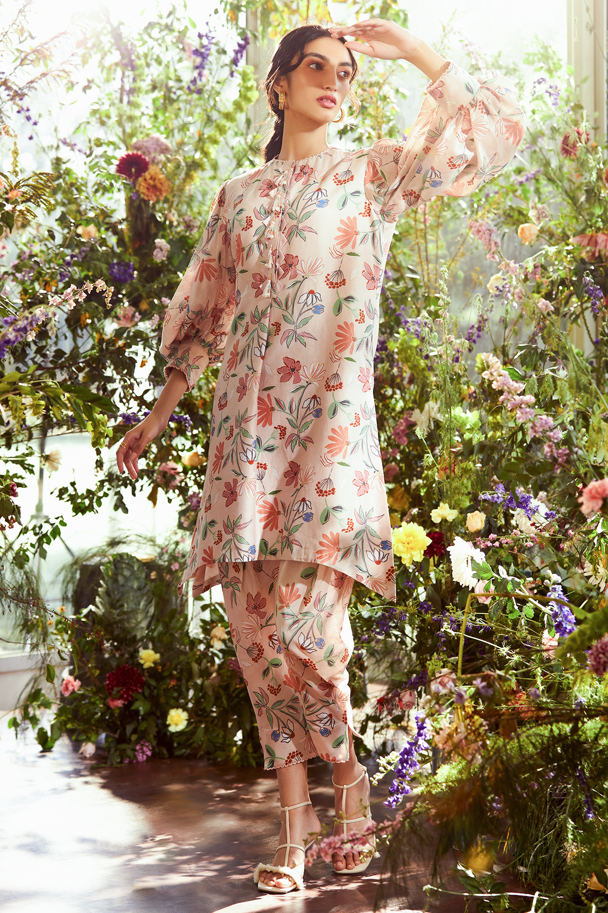 Beige big floral printed chanderi high low kurta. Beige big floral printed chanderi pleated straight fit pants |