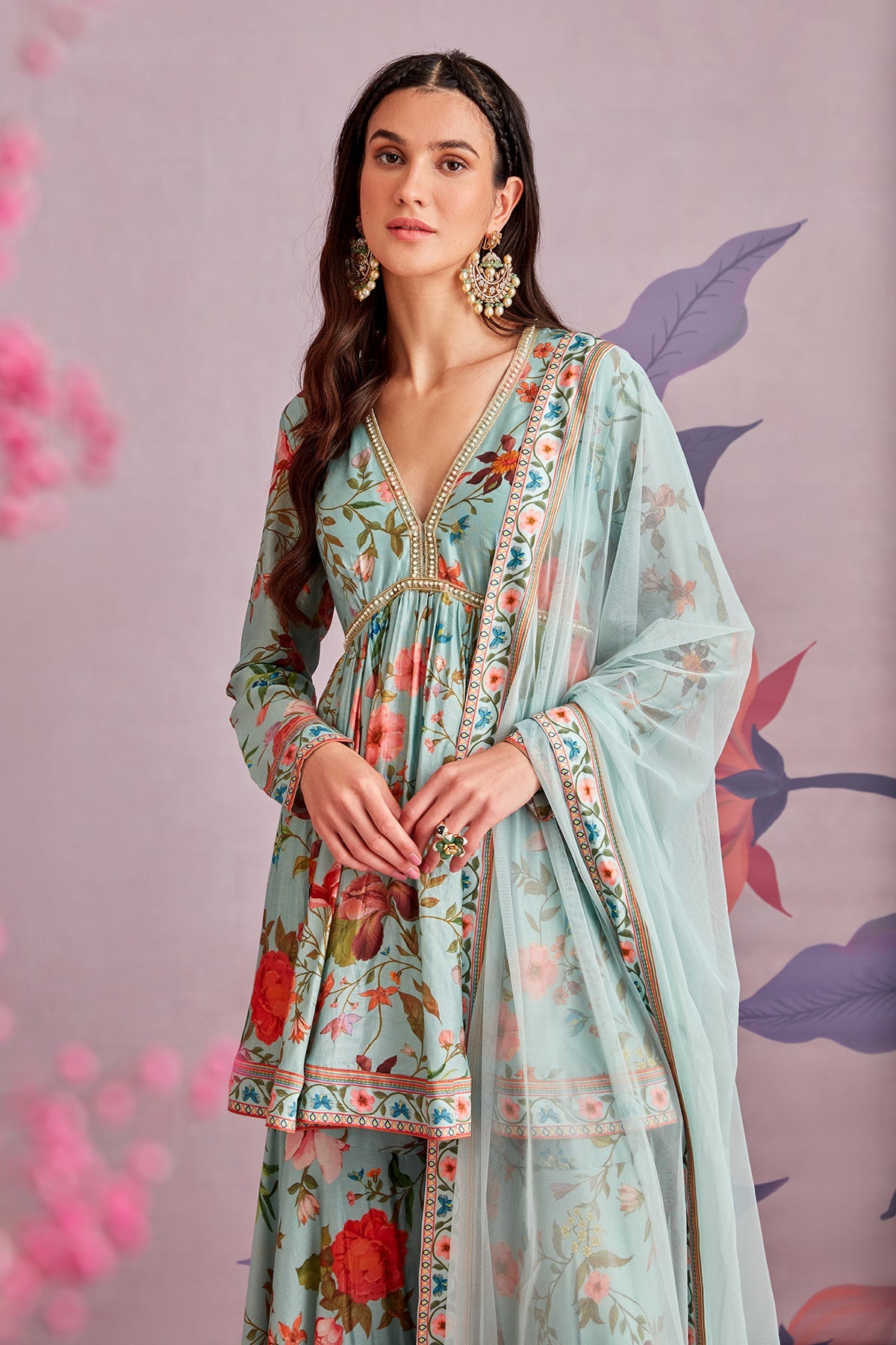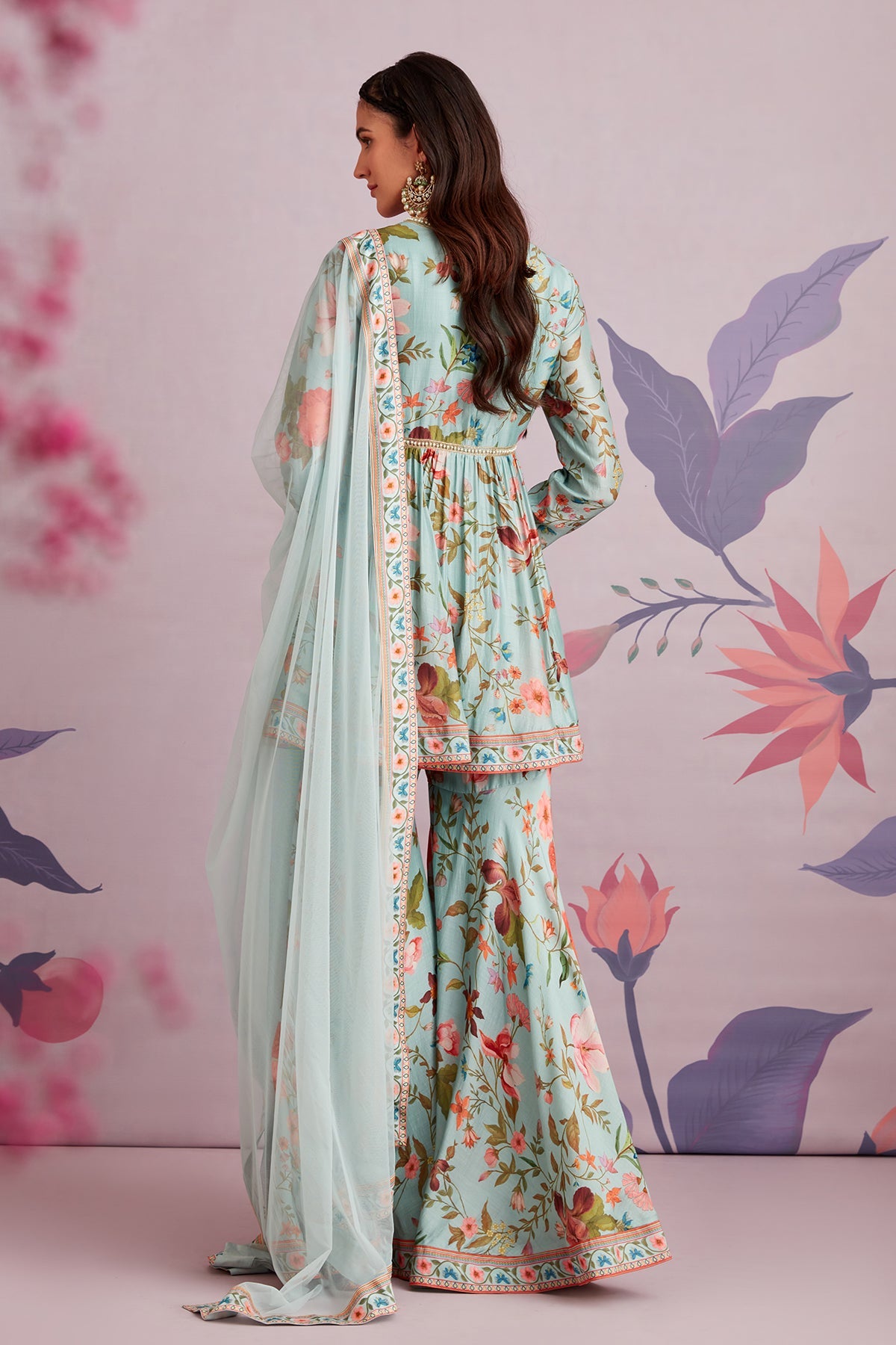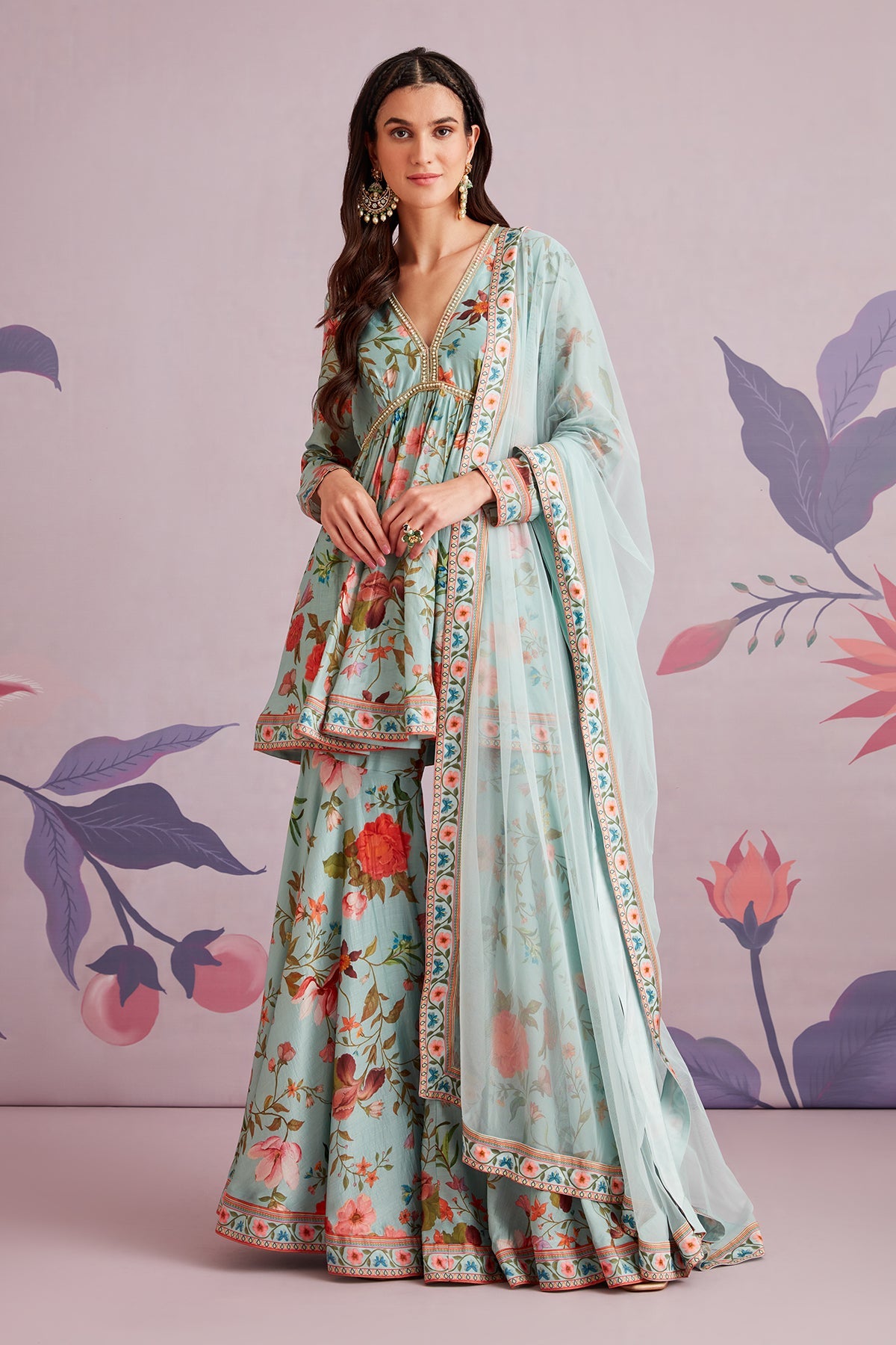 Embroidered printed silk short anarkali and garara paired with net dupatta