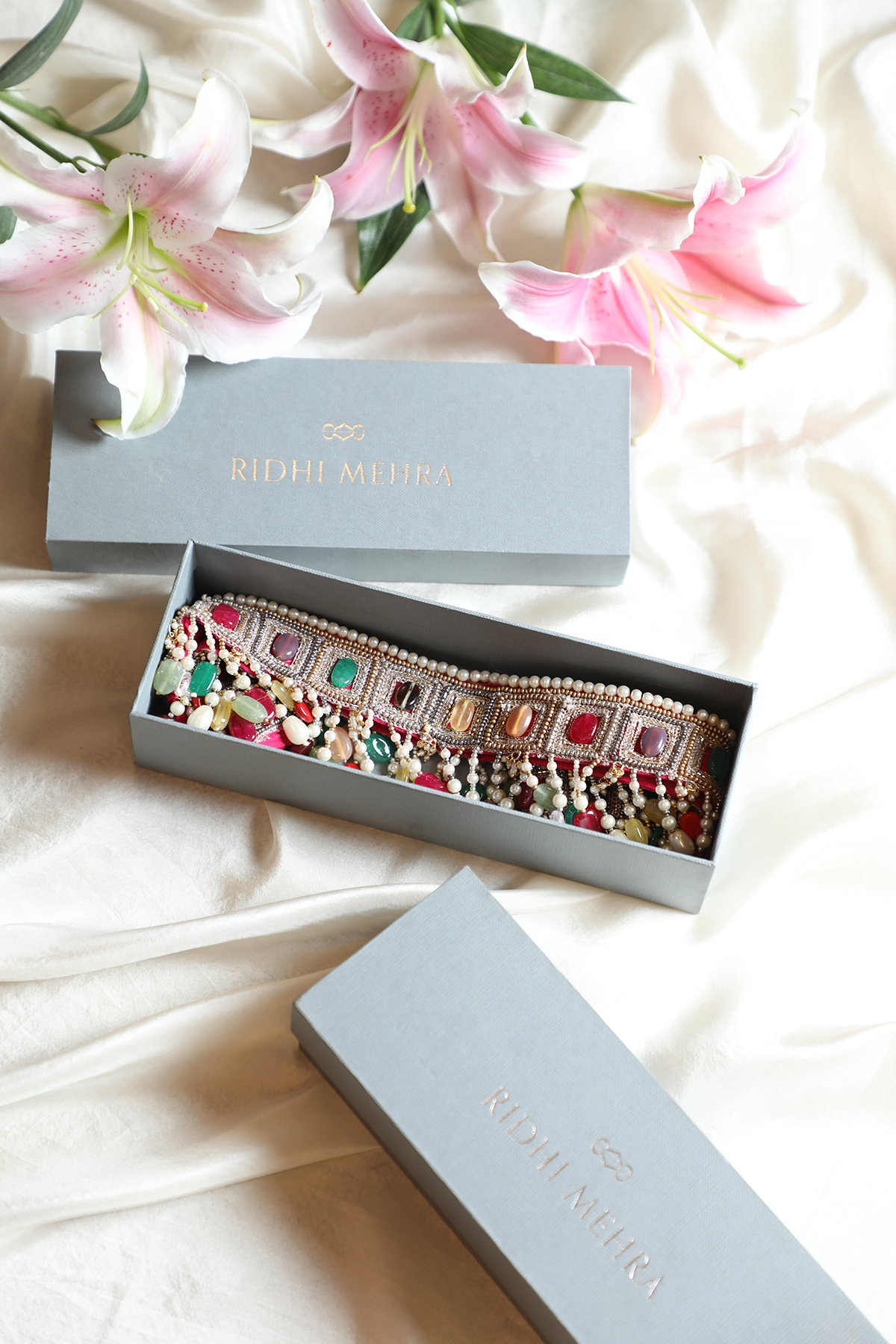 This belt is a perfect blend of tradition and contemporary elegance. handcrafted with precision, it features a captivating array of navratan gemstones, each chosen for its symbolic significance and aesthetic appeal. the addition of lively multi-color bead tassels enhances the belt's visual allure, creating a statement accessory that effortlessly elevates any outfit. the belt has the perfect harmony of cultural richness and modern style with our jewelled navratan belt – an ideal choice for those seeking a unique and eye-catching accessory.