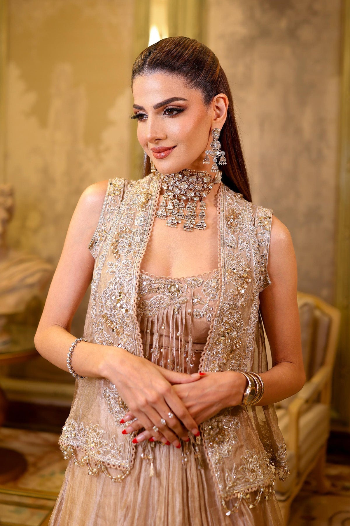 Tissue Embroidered Blouse and Plain Tissue Lehenga Paired with Embroidered Tissue Sleveless Jacket