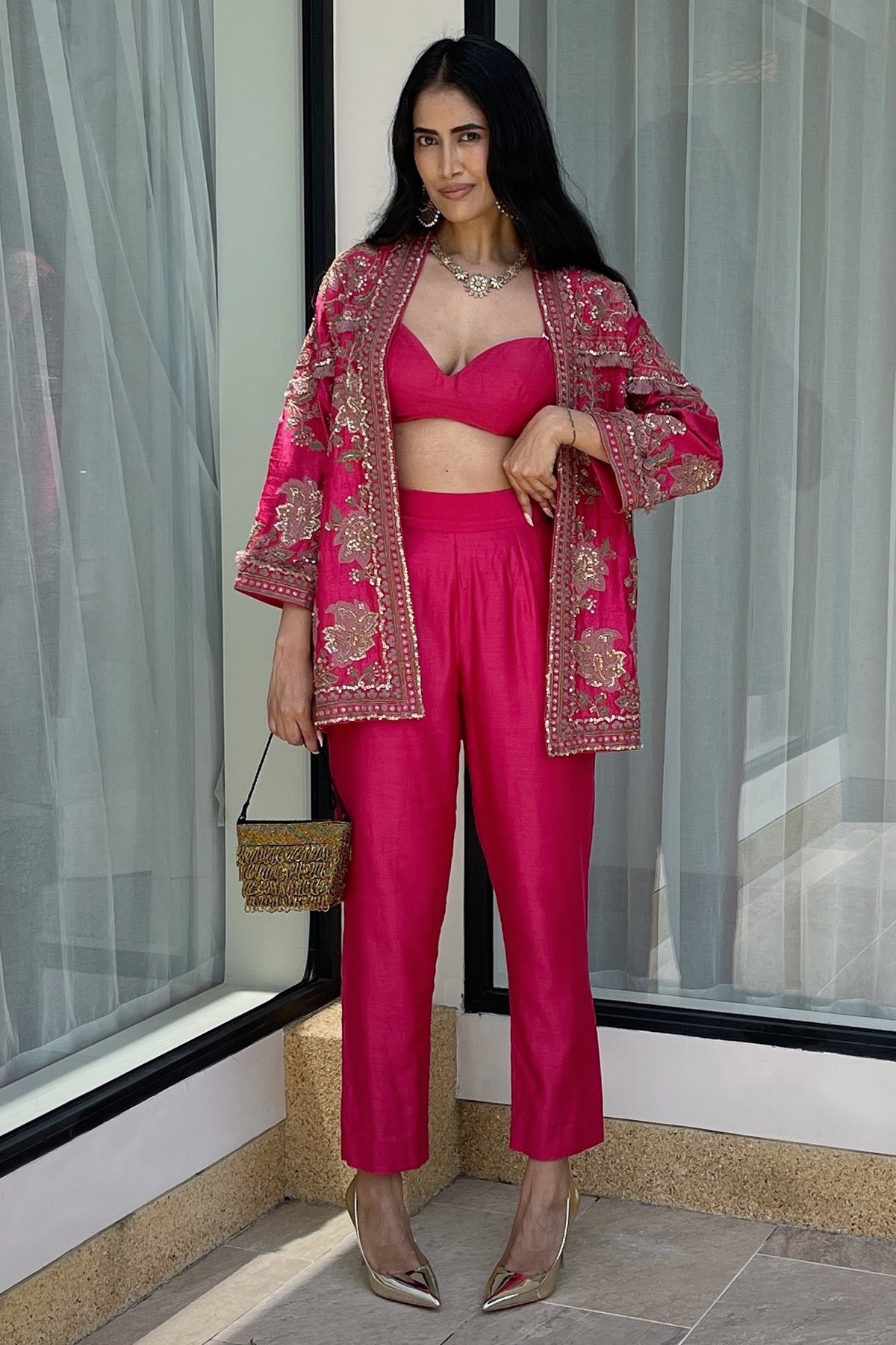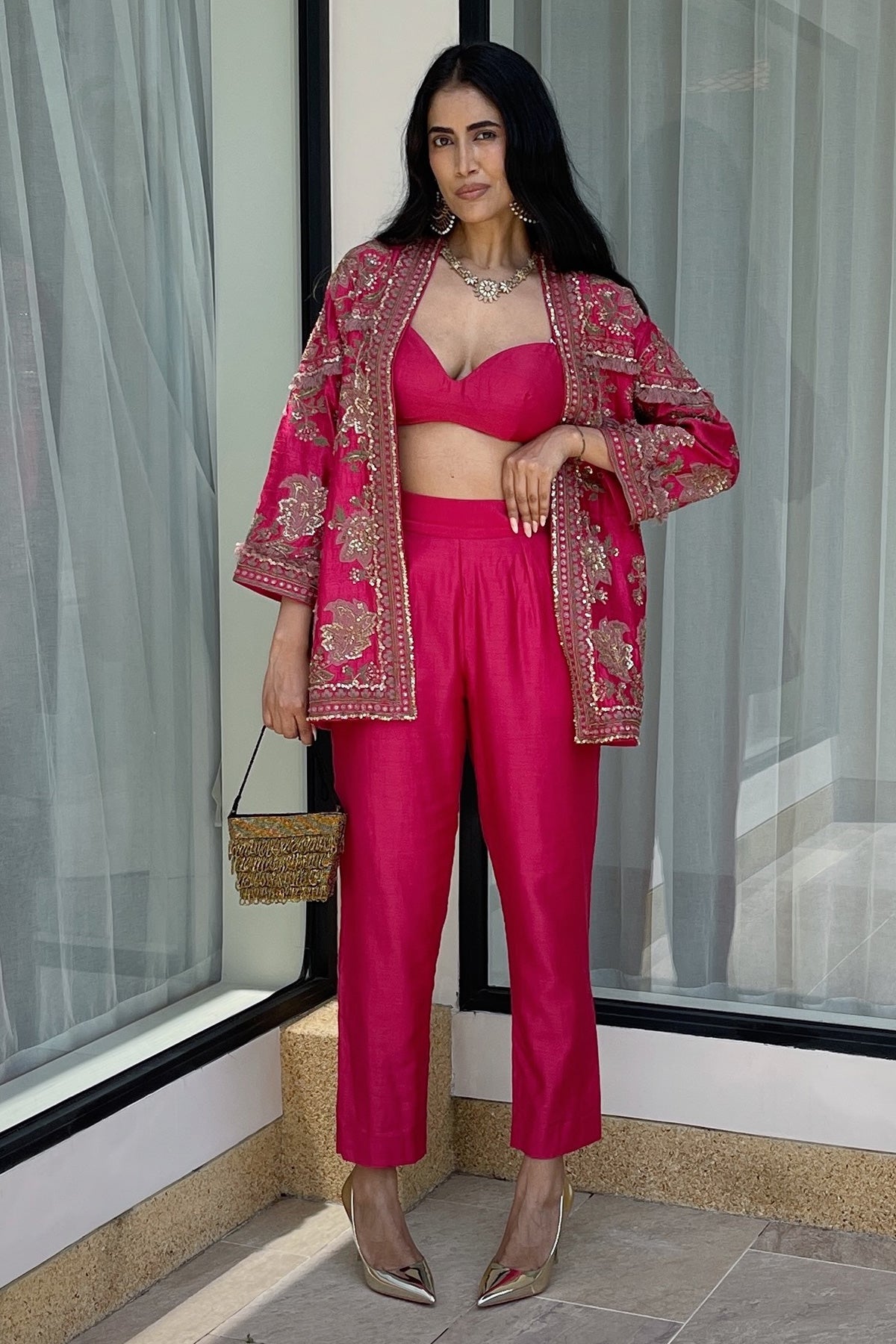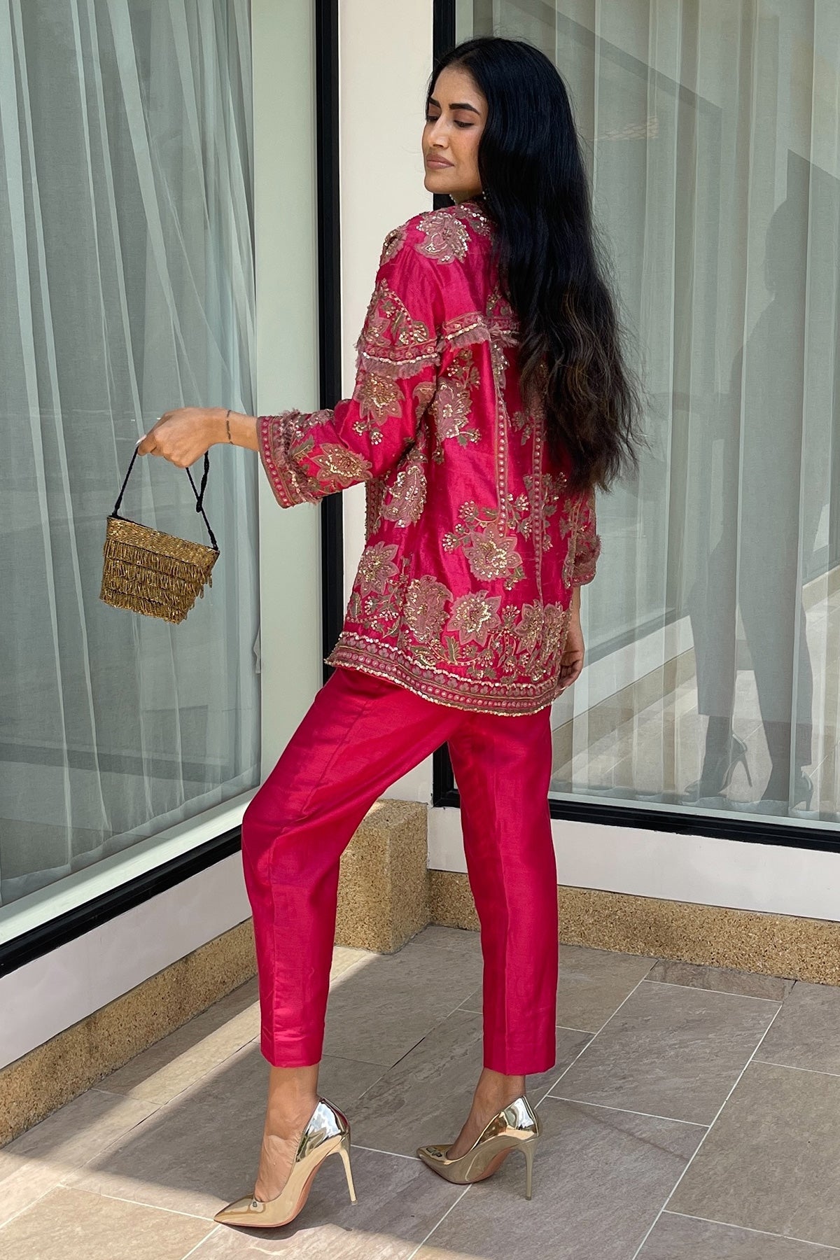cherry red raw silk embroidered jacket and fine silk pants with bustier