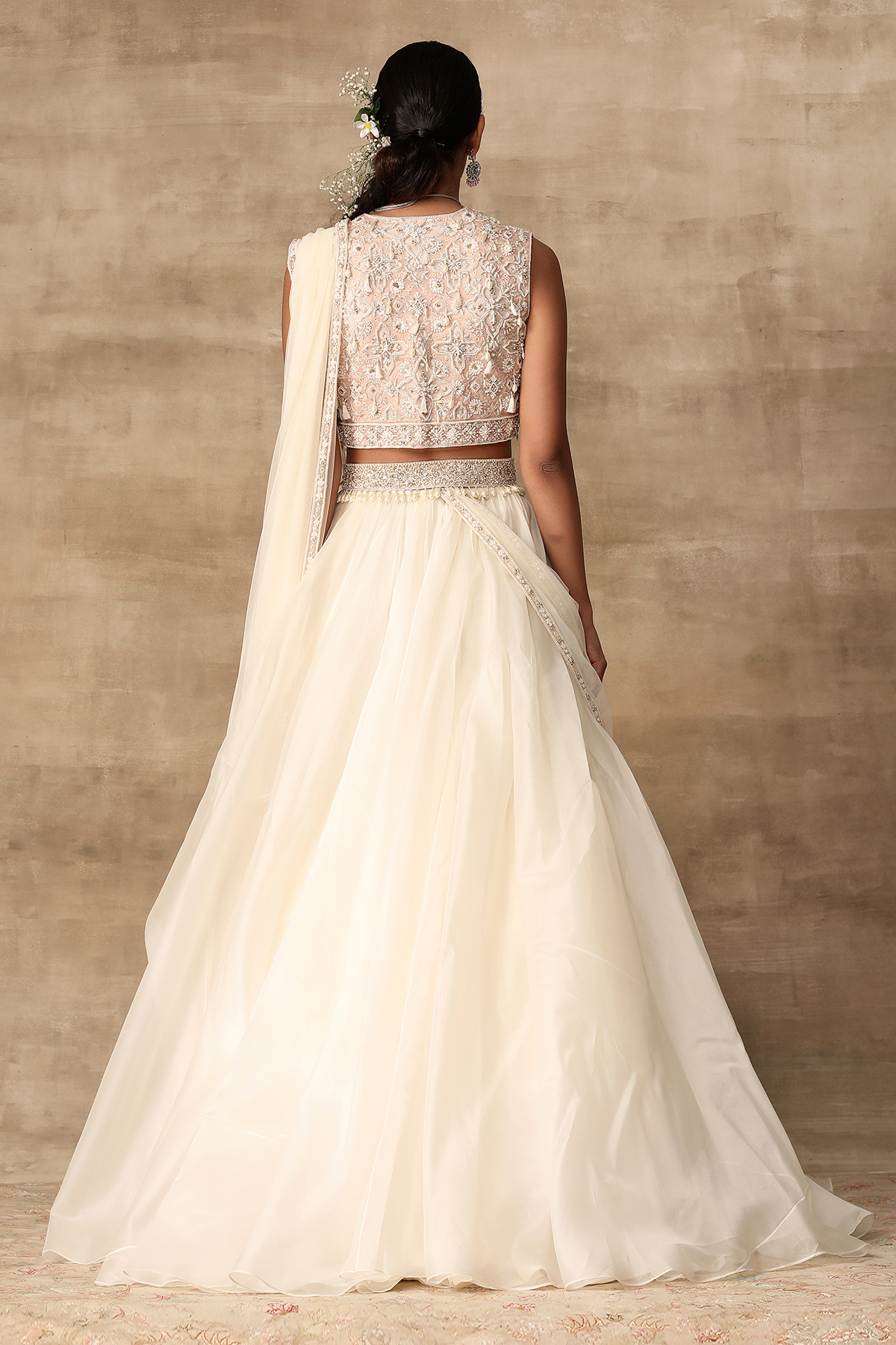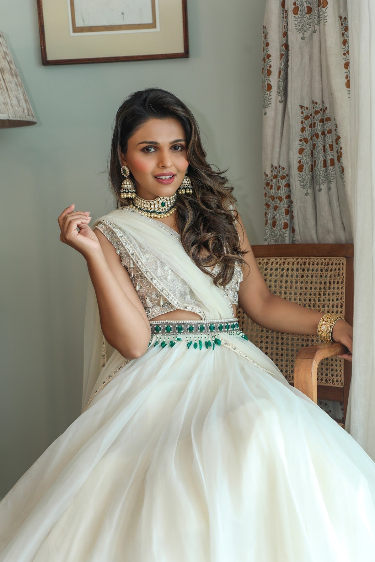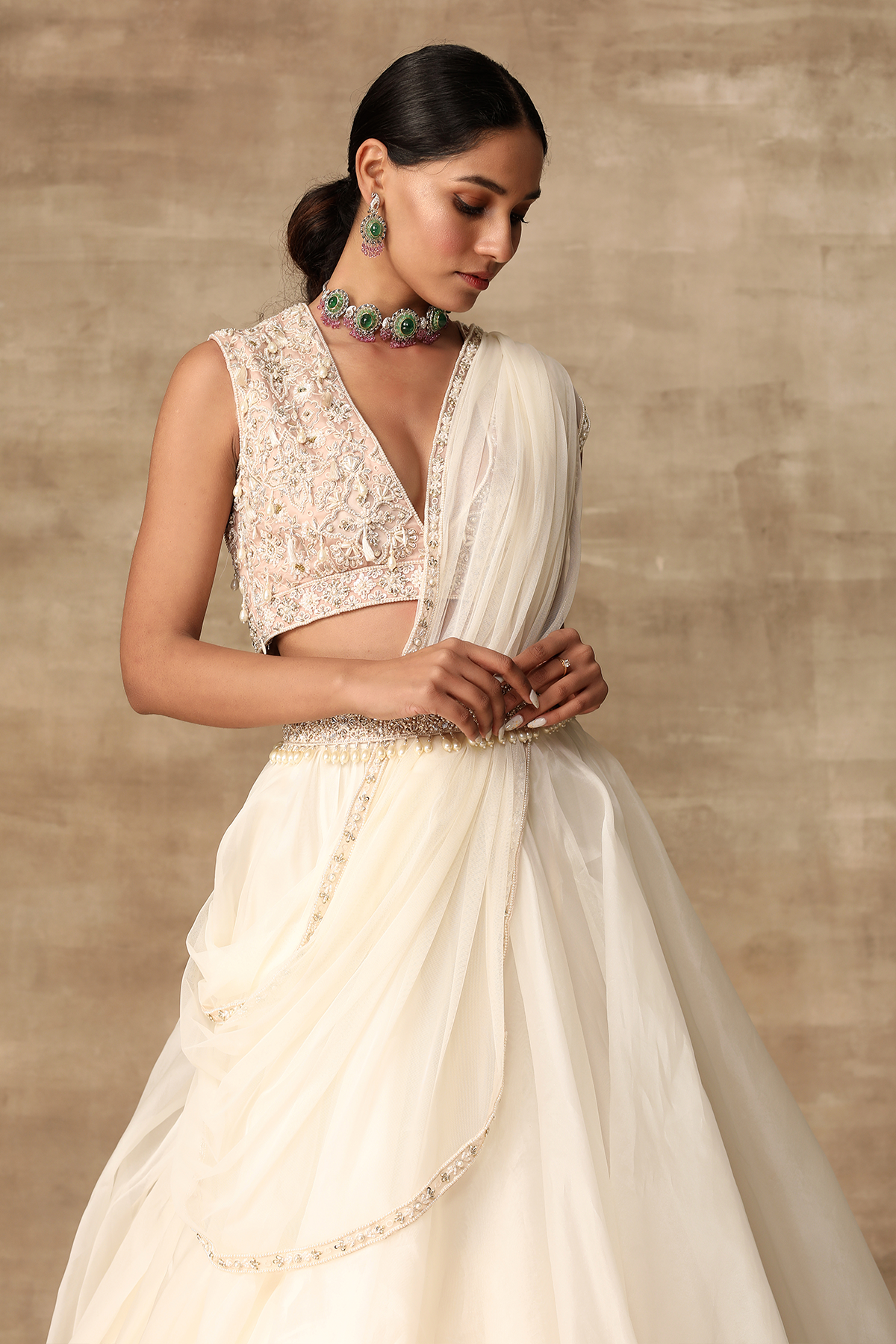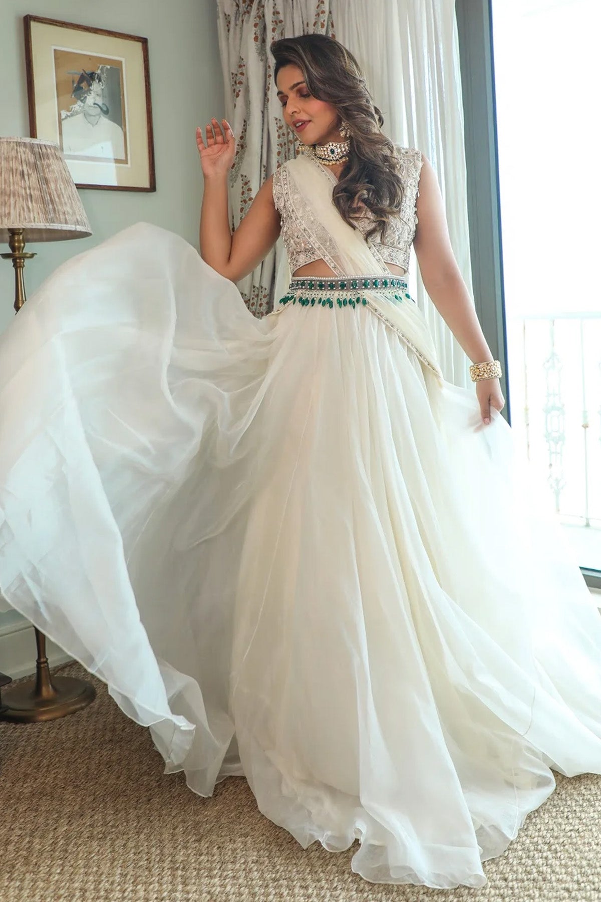 Ivory heavy pearl embroidered organza blouse and ivory flared organza skirt with embroidered net dupatta paired with Emerald Bejewelled belt.