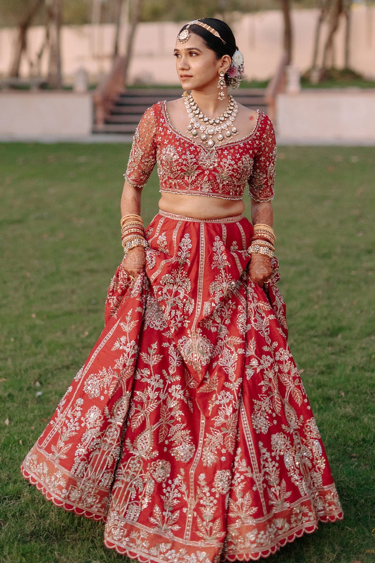 Embark on a journey of love with our Red Lehenga Set, inspired by Persian culture. The intricate tree motifs symbolize the emotions of a bride, elegantly crafted on a vibrant red lehenga, paired with a matching blouse and a scalloped-edged dupatta. Red, representing love and new beginnings, adds timeless elegance. Style with traditional accessories and step into your new life with grace, embracing the cultural significance of this enchanting ensemble.