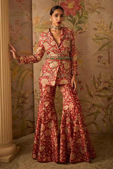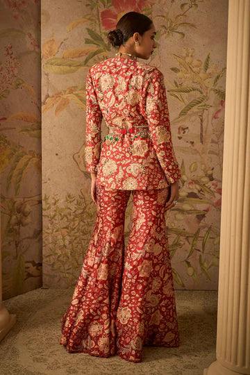 Red Printed Raw Silk Embroidered Jacket and Printed Flared Pants With Embroidered Printed Belt