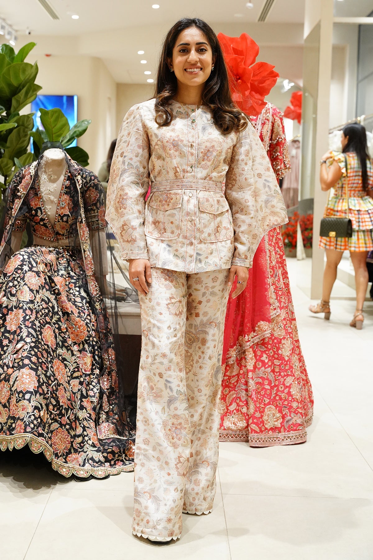 Elevate your style with our Ivory Raw Silk Ensemble – a chic combination of a printed anchor detailed shirt and flared pants, complemented by a matching anchor detailed belt. Crafted from luxurious raw silk, this outfit effortlessly transitions from casual outings to formal occasions. The intricate anchor print adds a touch of sophistication, while the neutral ivory hue ensures easy accessorizing. Designed for comfort and timeless elegance, this ensemble is your go-to choice for making a statement at any event. Shop now and redefine your fashion game with this versatile and impeccably crafted outfit.
