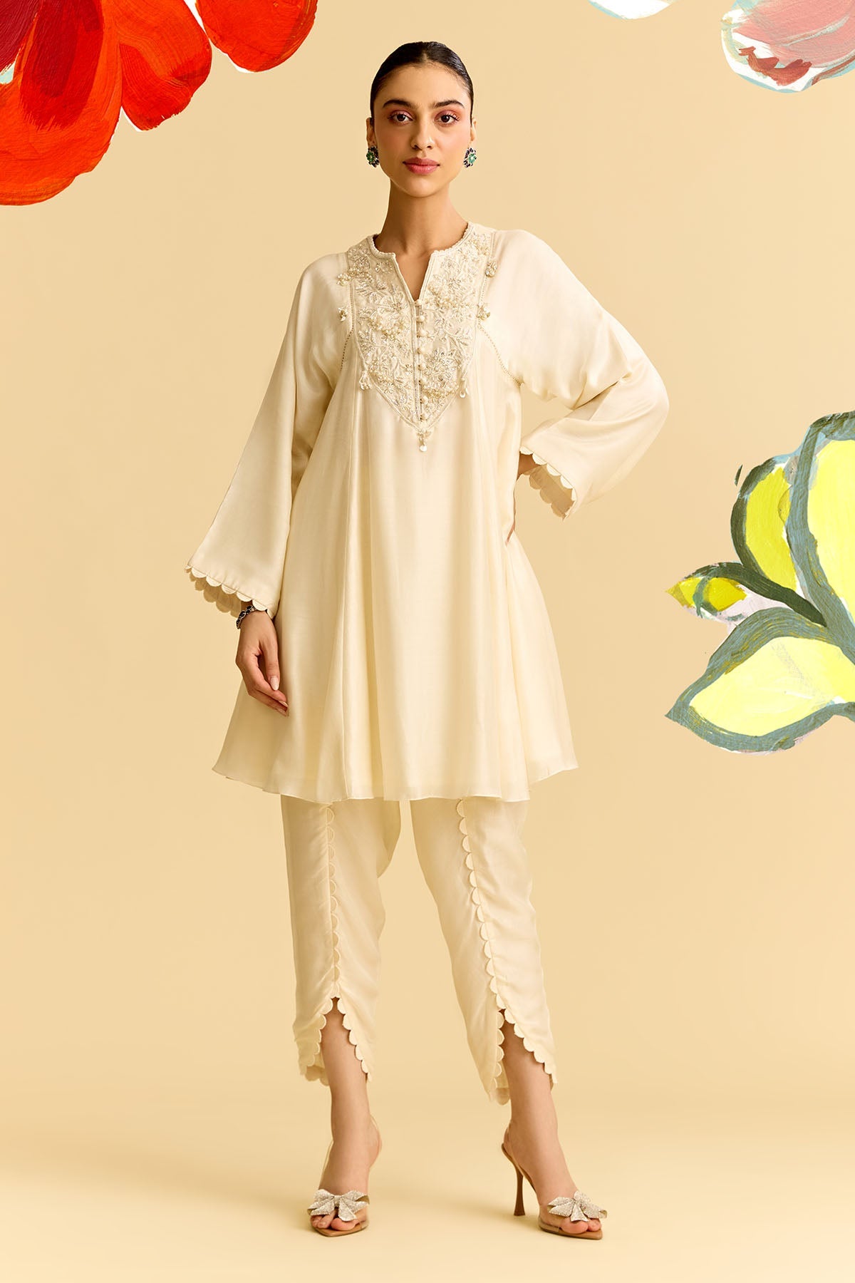 Introducing our exquisite Ivory Silk Flared Short Kurta With Tulip Pants, a perfect blend of elegance and comfort. Crafted from premium silk fabric, this ensemble features delicate tone-on-tone embroidery, intricate threadwork, and sparkling crystals that add a touch of glamour. The flared short kurta offers a flattering silhouette, while the tulip pants enhance the overall charm with their contemporary design. Whether it's a daytime event or an evening gathering, this outfit is versatile and ideal for all occasions. Experience the luxury of fine craftsmanship combined with effortless style, ensuring comfort throughout the day. Elevate your wardrobe with this timeless piece that exudes grace and sophistication.
