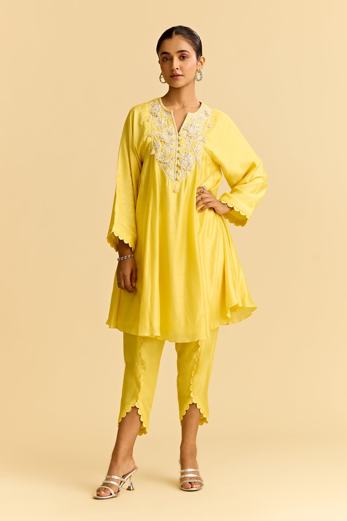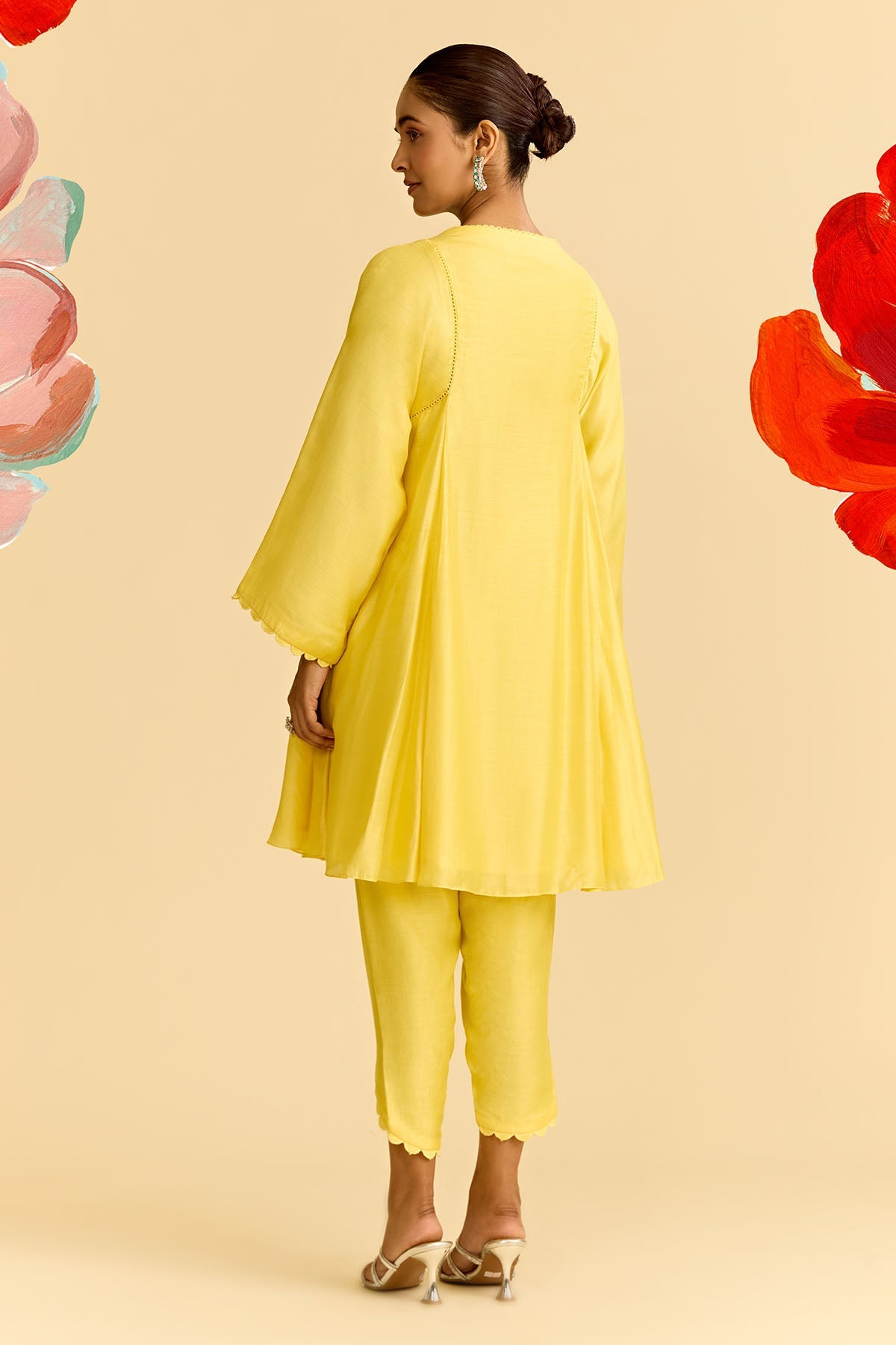 Introducing our exquisite yellow Silk Flared Short Kurta With Tulip Pants, a perfect blend of elegance and comfort. Crafted from premium silk fabric, this ensemble features delicate ivory embroidery, intricate threadwork, and sparkling crystals that add a touch of glamour. The flared short kurta offers a flattering silhouette, while the tulip pants enhance the overall charm with their contemporary design. Whether it's a daytime event or an evening gathering, this outfit is versatile and ideal for all occasions. Experience the luxury of fine craftsmanship combined with effortless style, ensuring comfort throughout the day. Elevate your wardrobe with this timeless piece that exudes grace and sophistication.