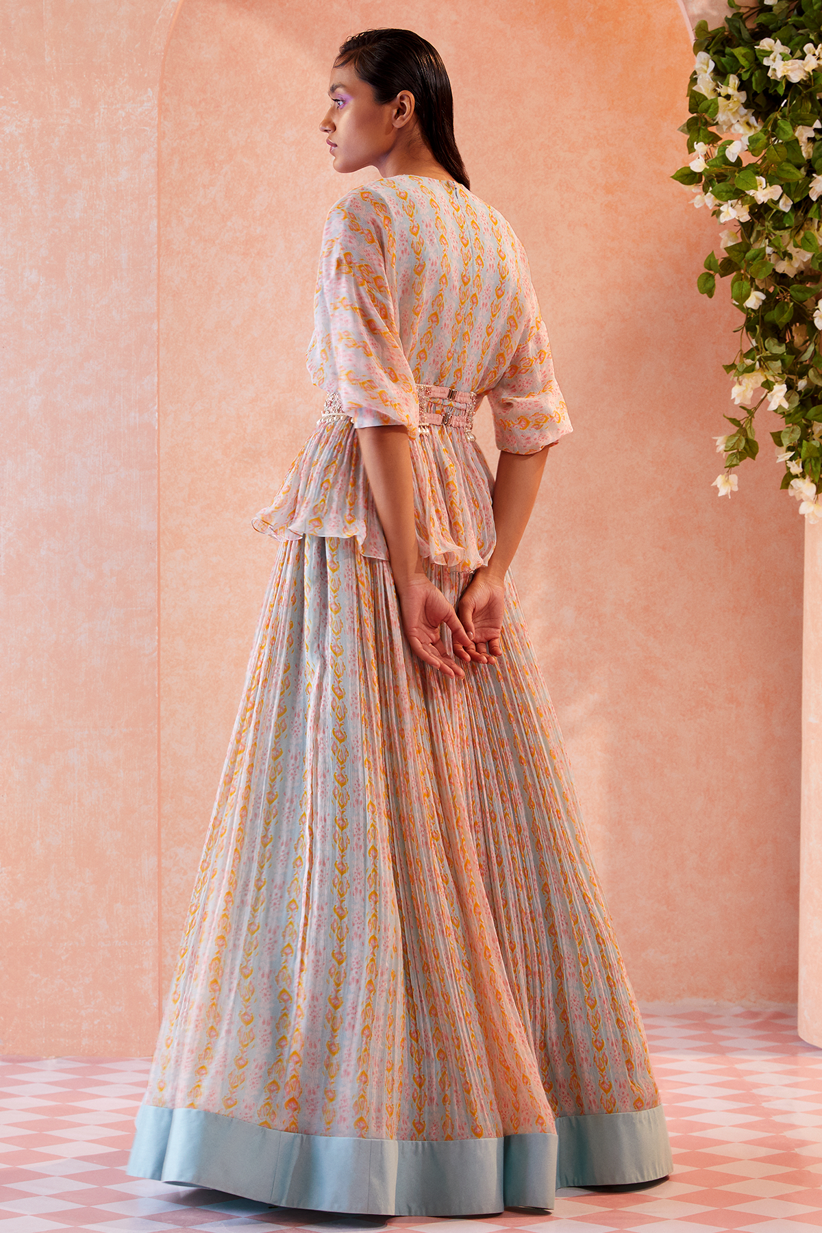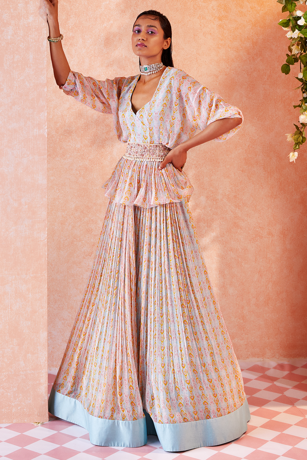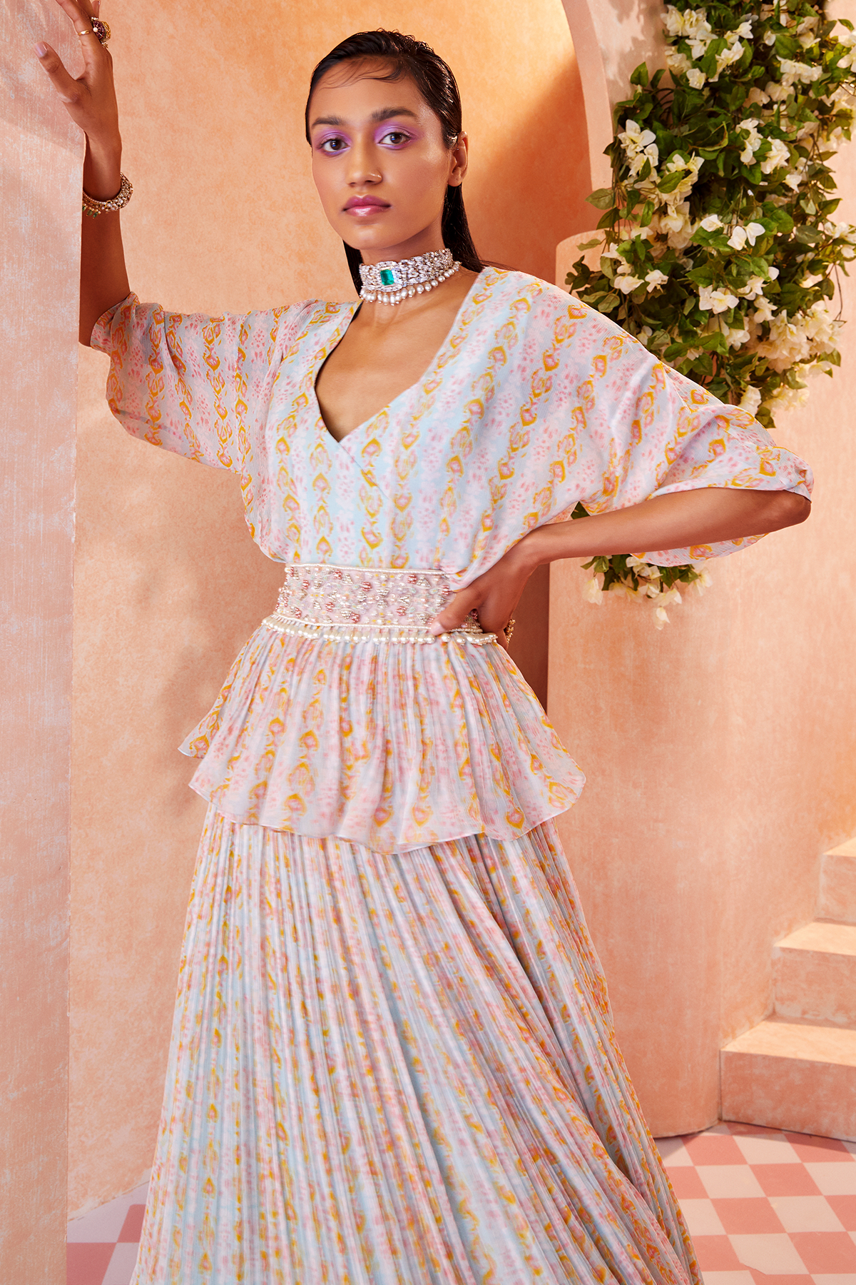 Ice Blue ikat printed kimono style peplum paired with printed ruched skirt and an embroidered pearl drop belt