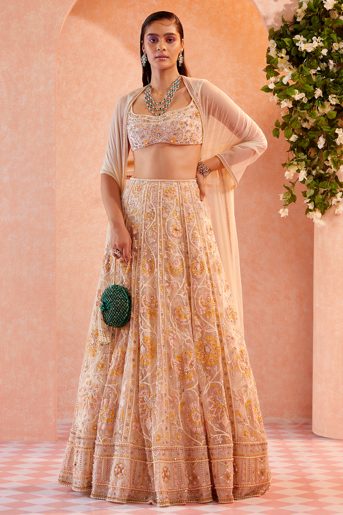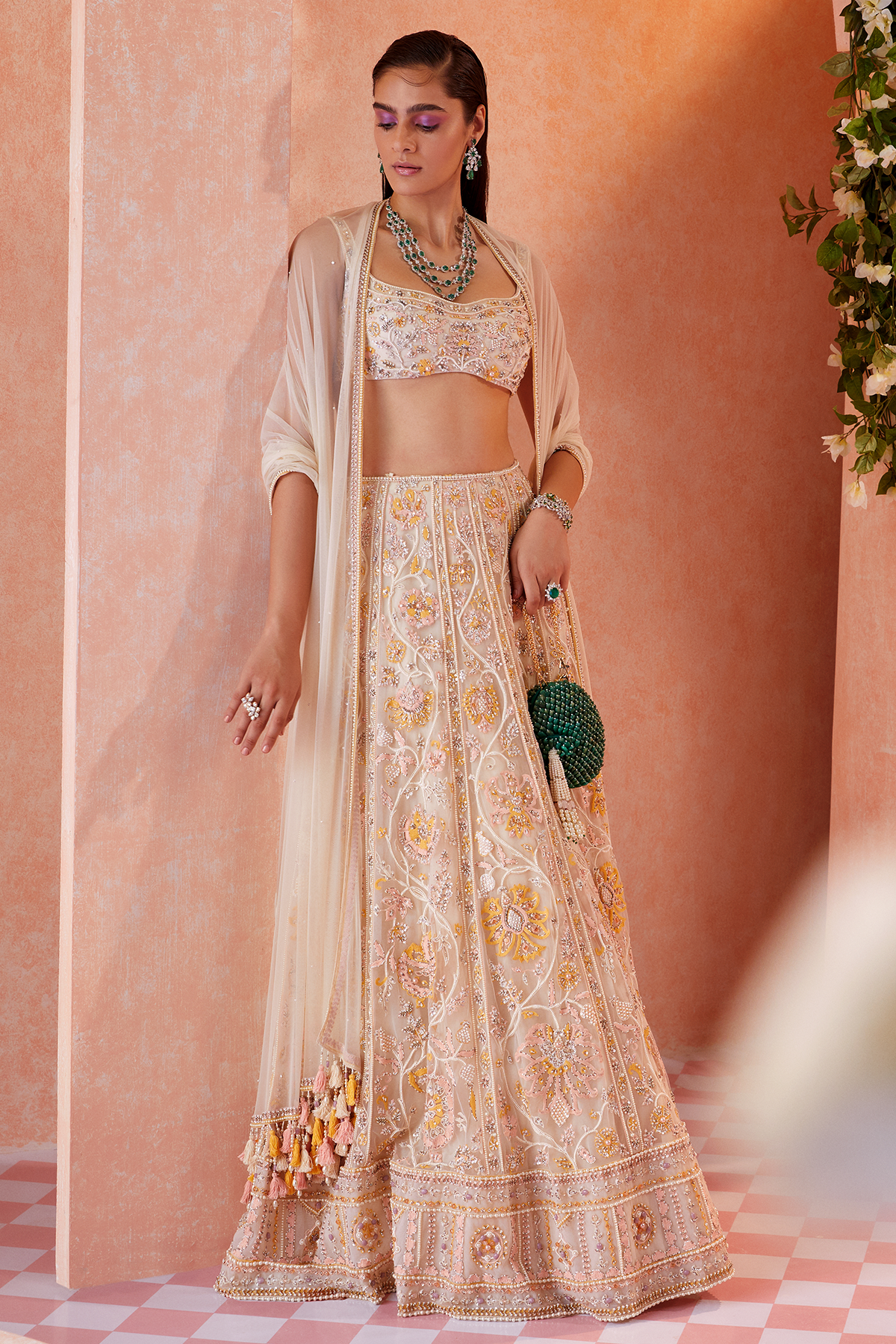 Dirty Ivory net embroidered blouse and lehenga paired with net dupatta