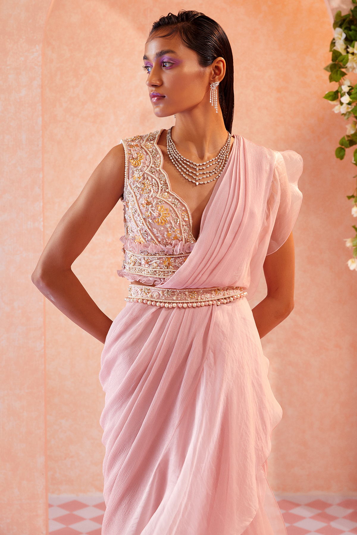 Light pink net embroidered blouse and chiffon-organza draped ruffle saree paired with embroidered belt.