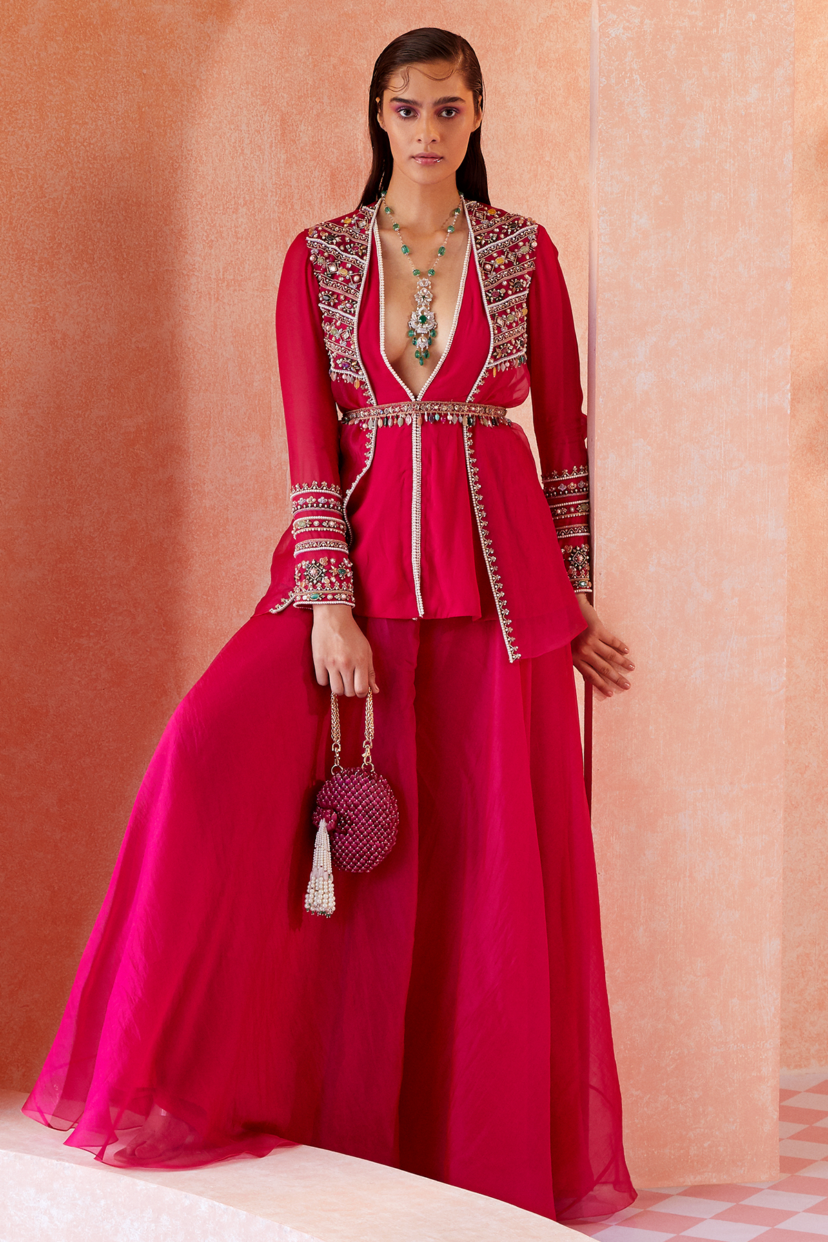 Fuschia Georgette peplum with an organza overlay jacket paired with organza sharara and embellished belt.