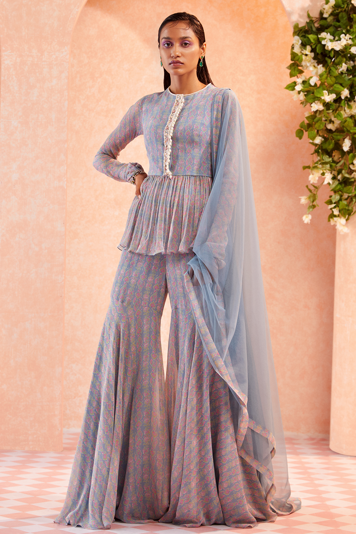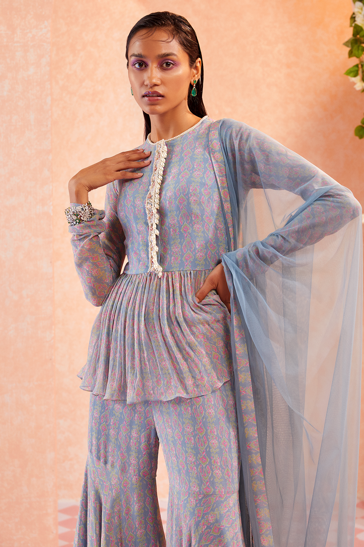 Dusty blue ikat printed chiffon peplum with embellished neckline paired with ikat printed chiffon garara and net dupatta