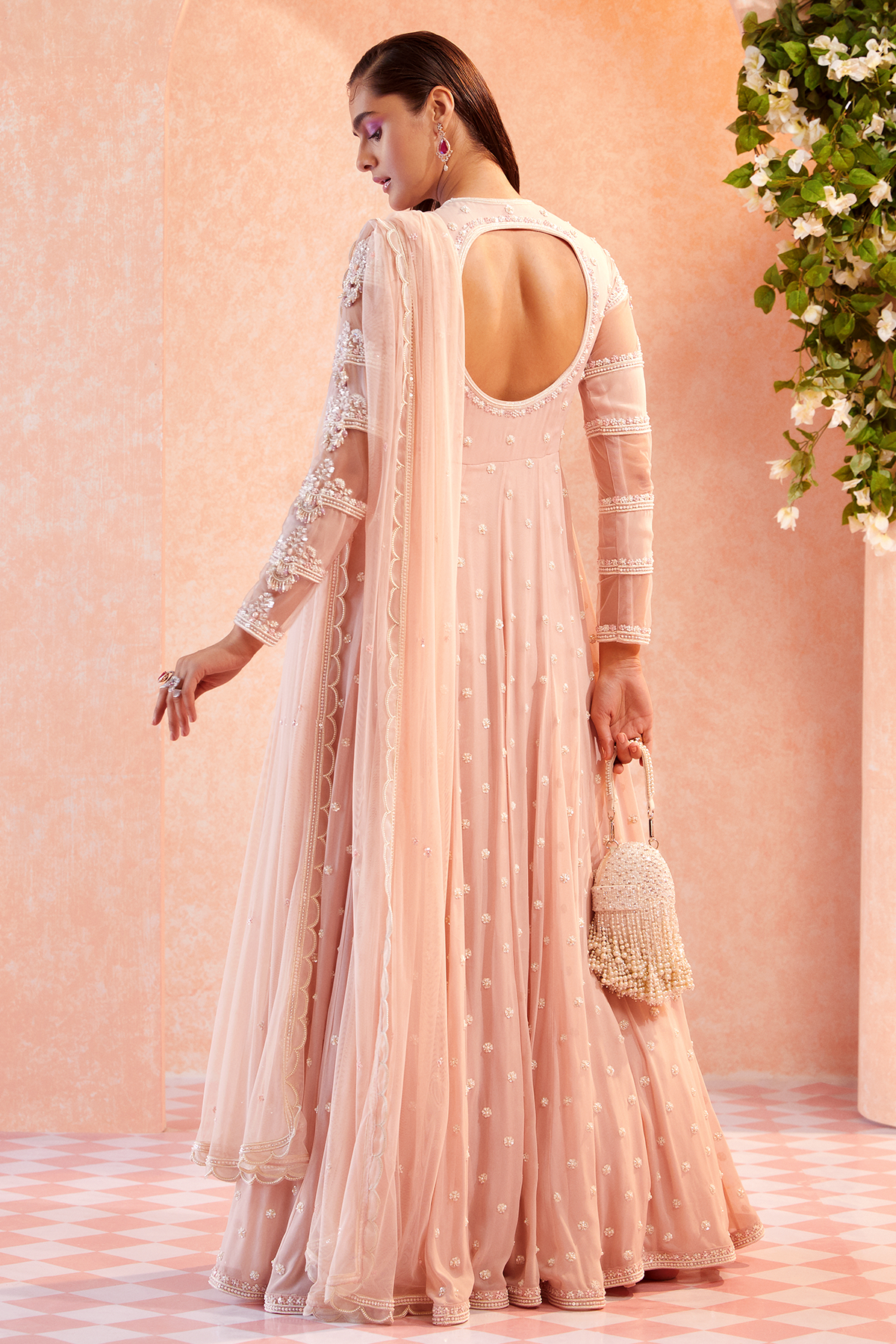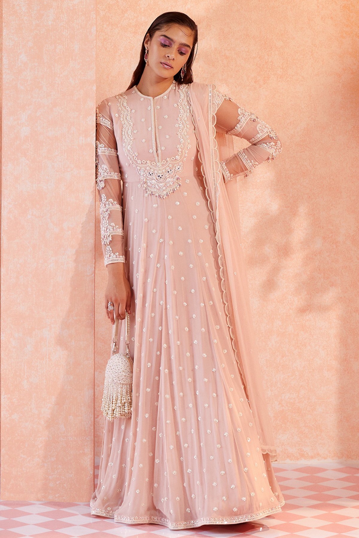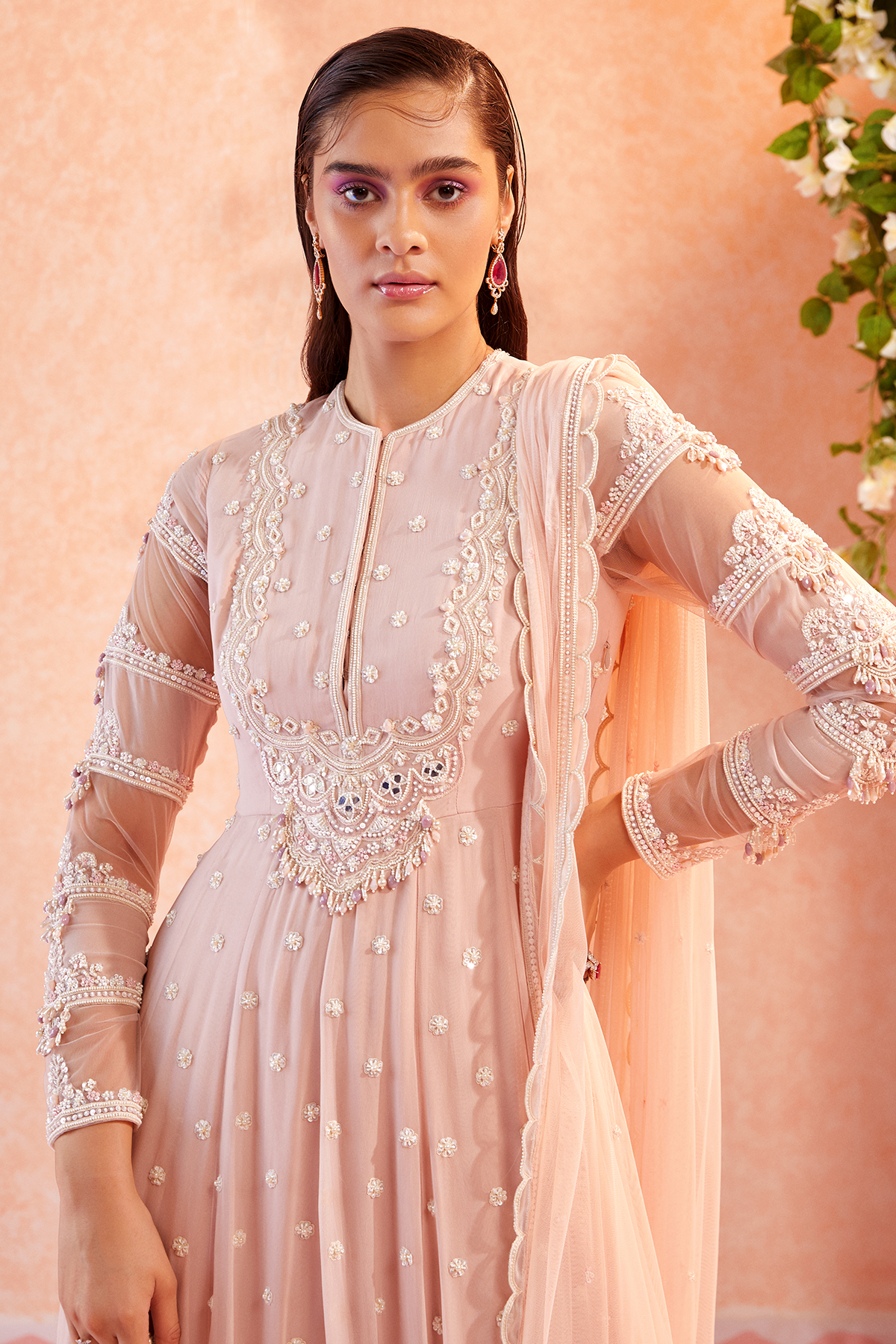 Chalk pink georgette embroidered anarkali with embroidered net dupatta.