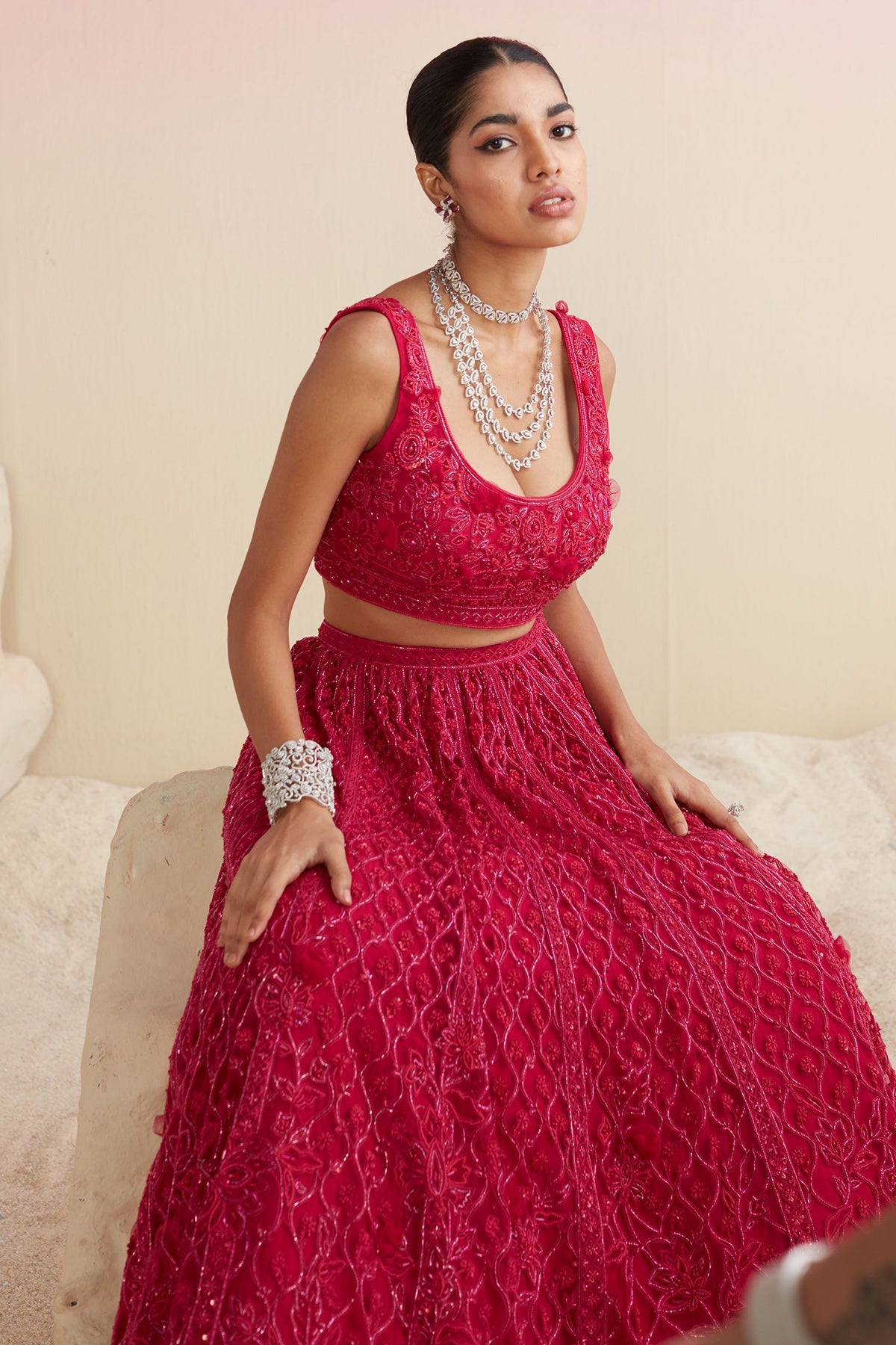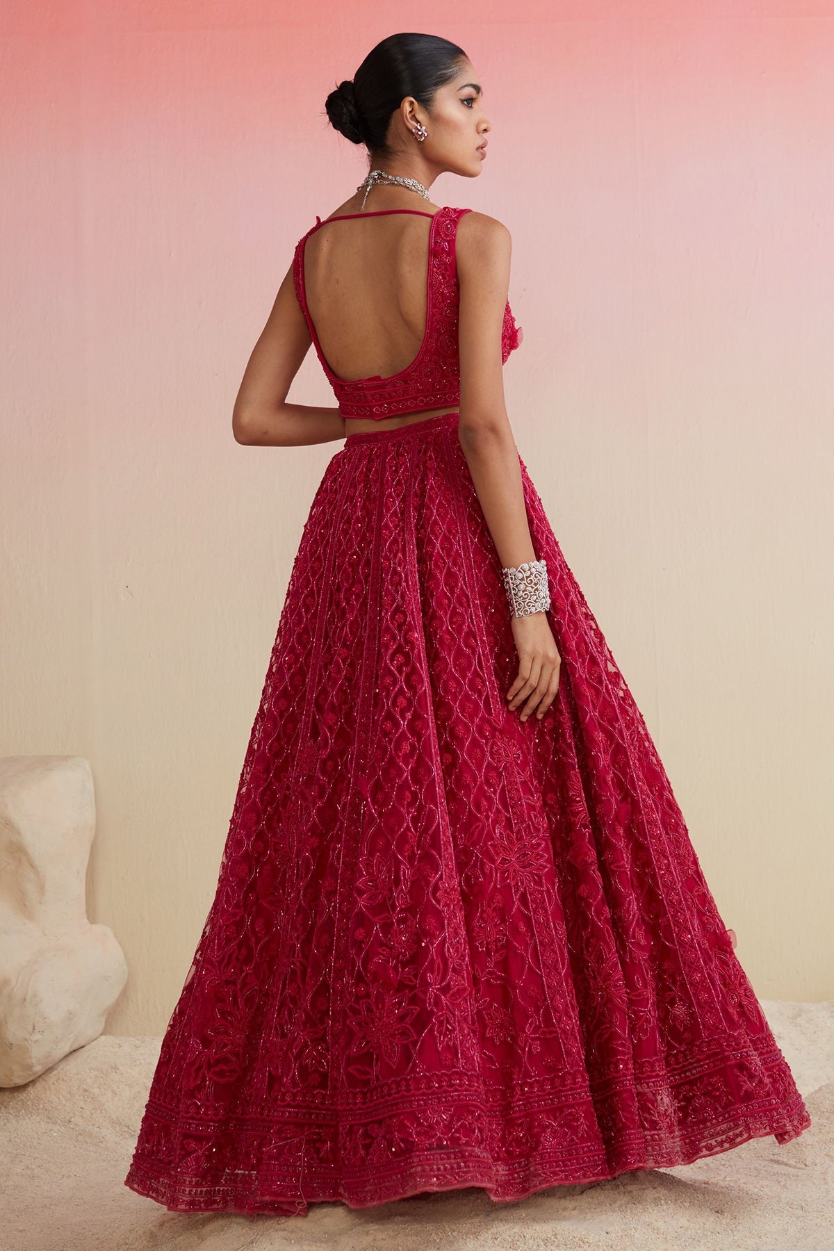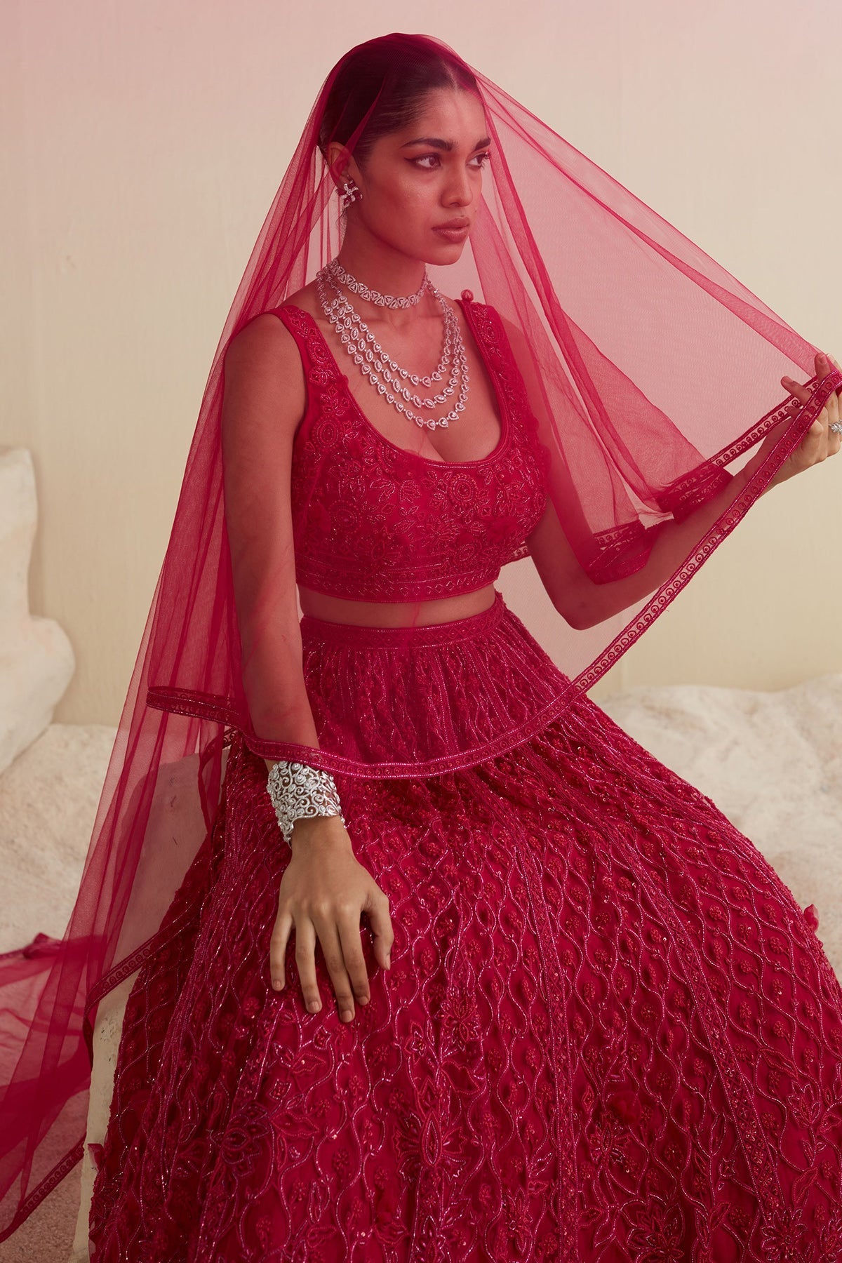 Fuchsia Embroidered Net Blouse paired with heavily embroidered Lehenga and net dupatta