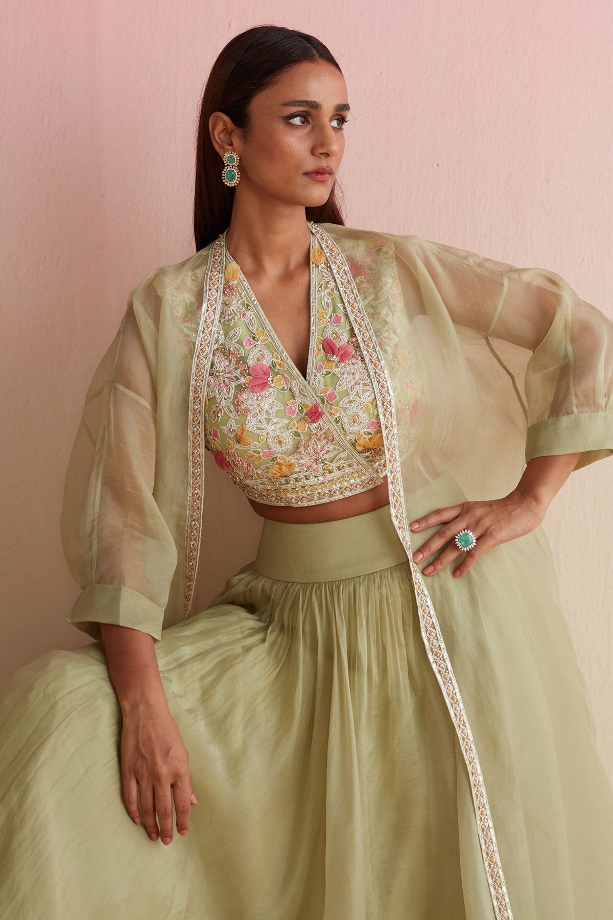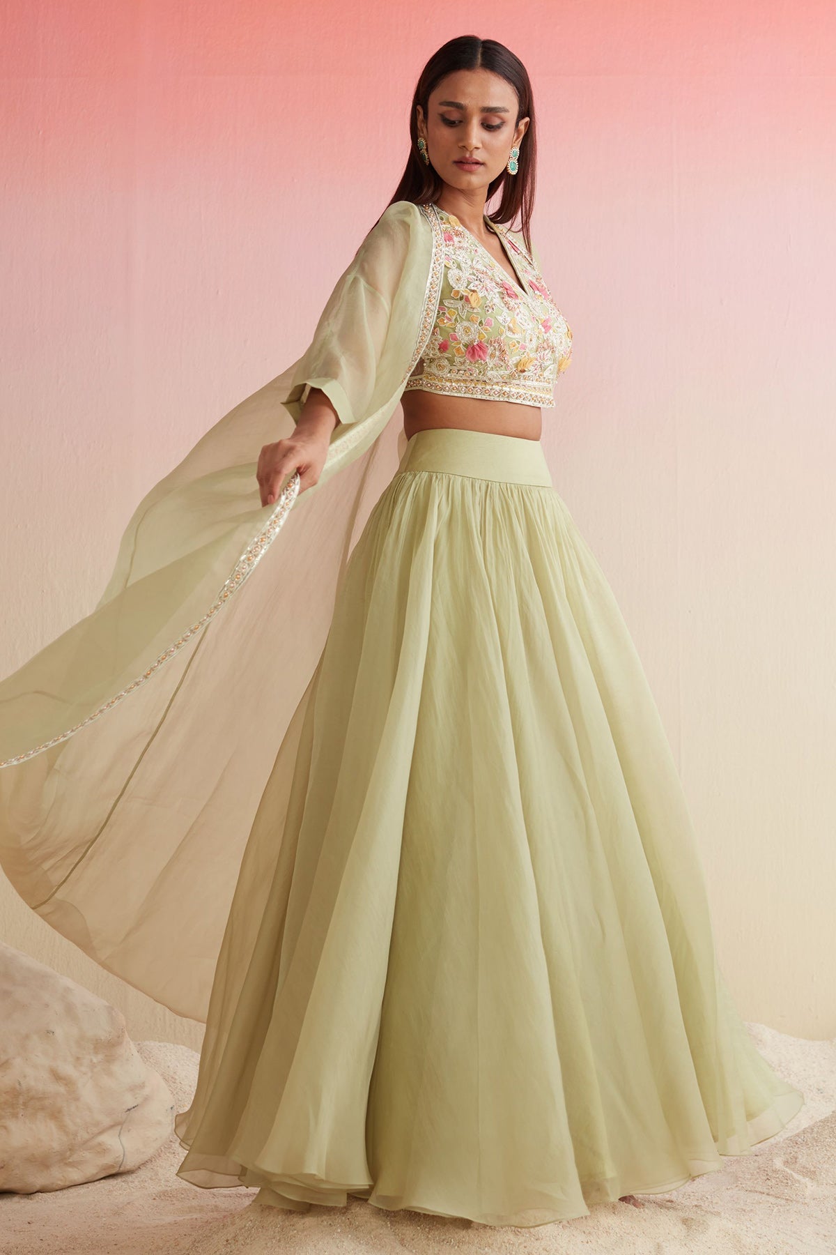 Mint green net embroidered blouse with plain organza skirt and Cape