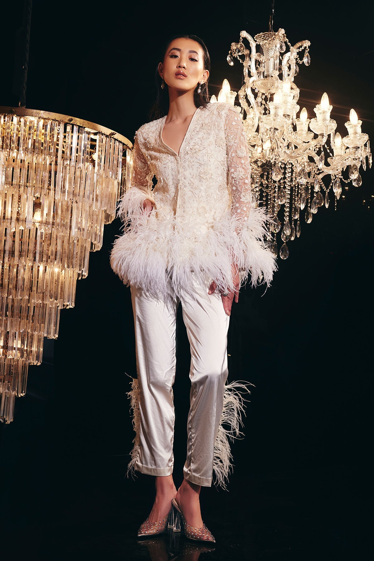 Ivory thread embroidered feathers embellished net jacket with satin pants with feathers   embellishment
