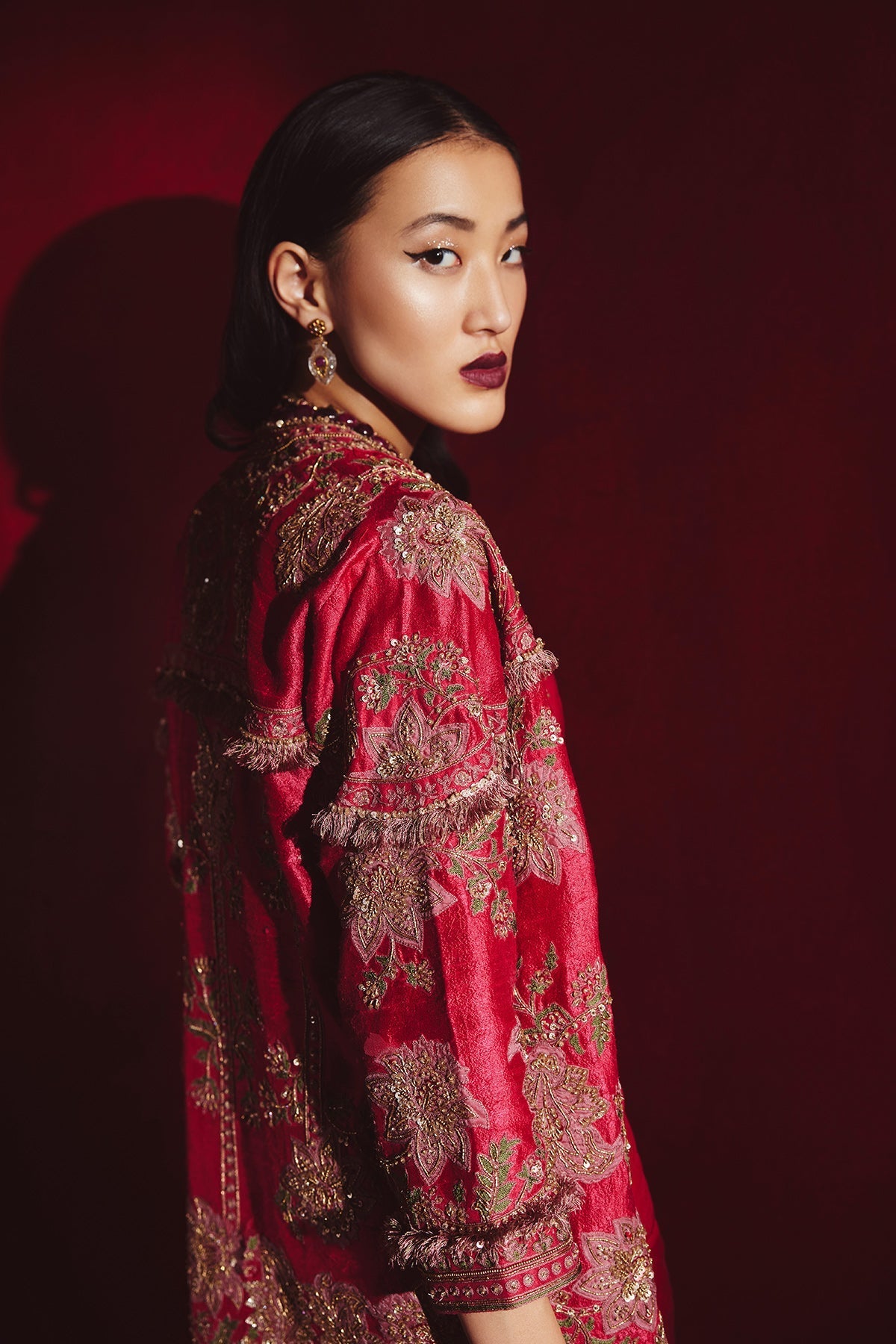 cherry red raw silk embroidered jacket and fine silk pants with bustier