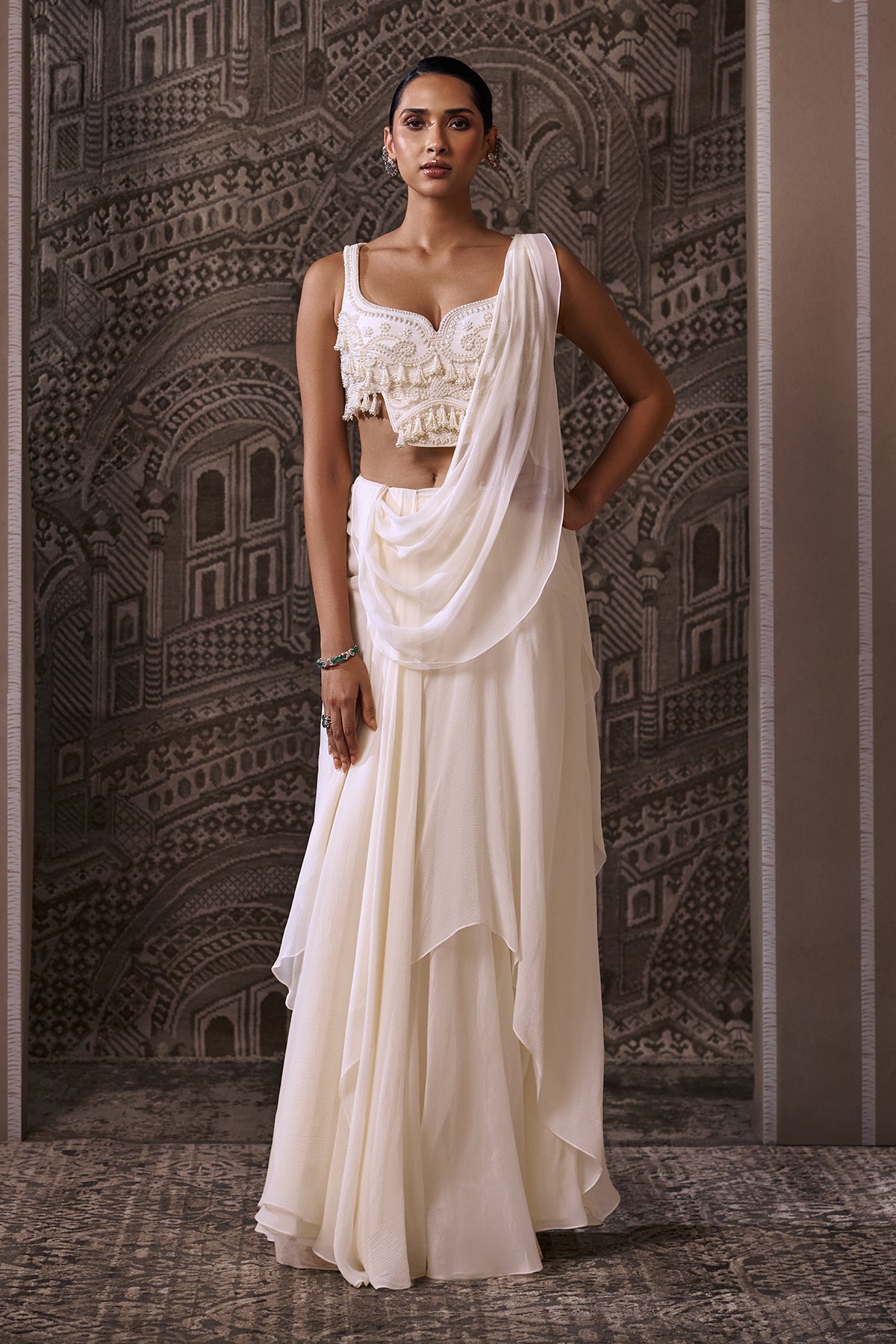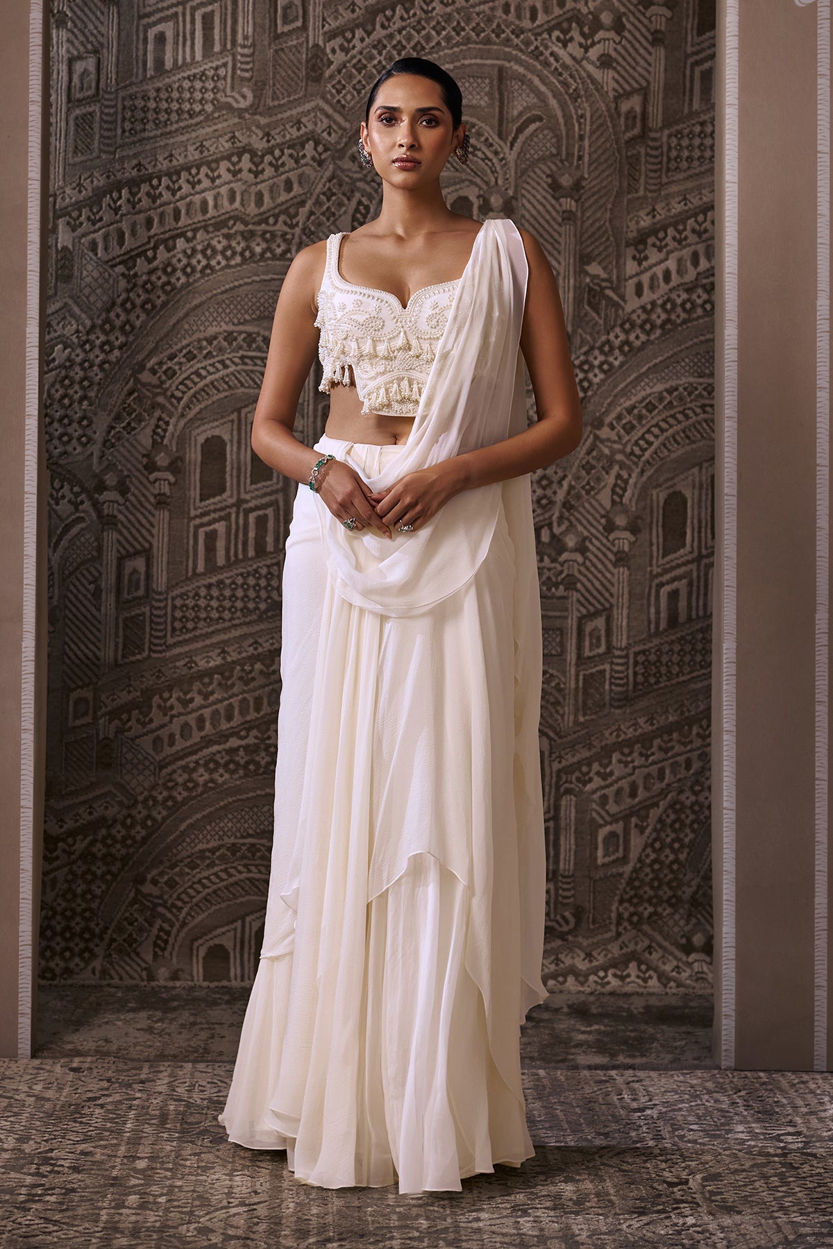 Net Embroidered Tie Up Blouse Paired With Chiffon Double Draped Saree