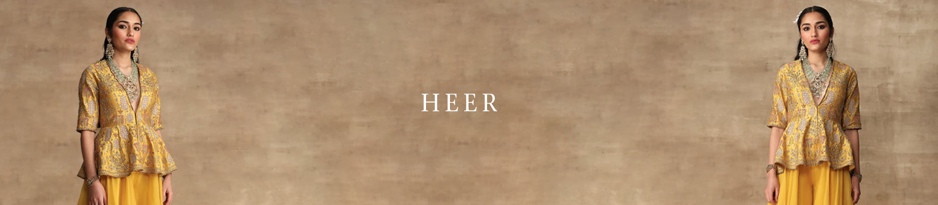 The timeless ensembles in this collection draw reference to the classic Indian weddings but spun with western aesthetics. Giving preference to the maximal ethnic look in these creatives through bright hues like canary yellow, peach, apple green, ivory and gold, there is a shift of the concept of ‘voluminous silhouettes’ to lighter fabrics like chiffon, organza, net and silk. The designer has defined the new-age bride who experiments yet stands as the glory of Indian fabrics through golden zari threads, cutdana and floral motifs.