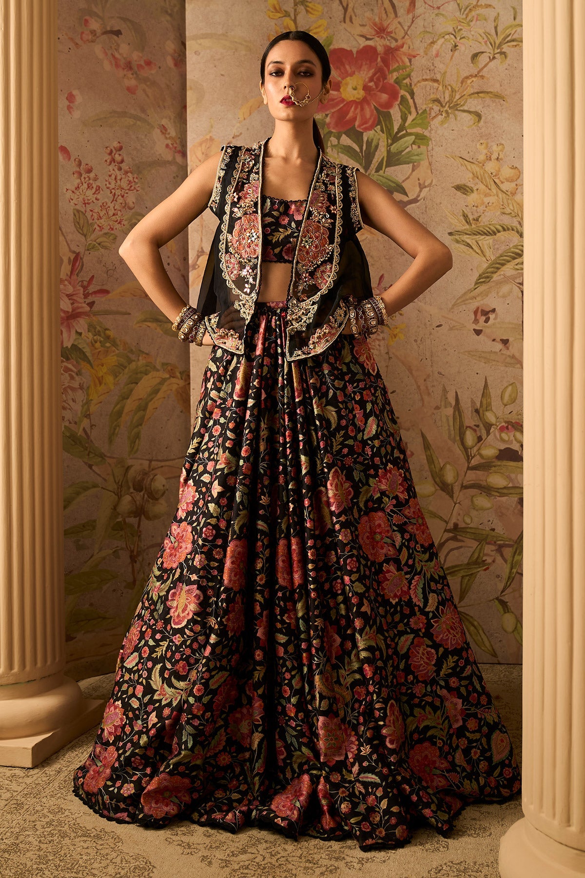 Black Raw Silk Sleeveless Blouse Paired With Solid Organza Applique Embroidered Jacket and Printed Raw Silk Lehenga