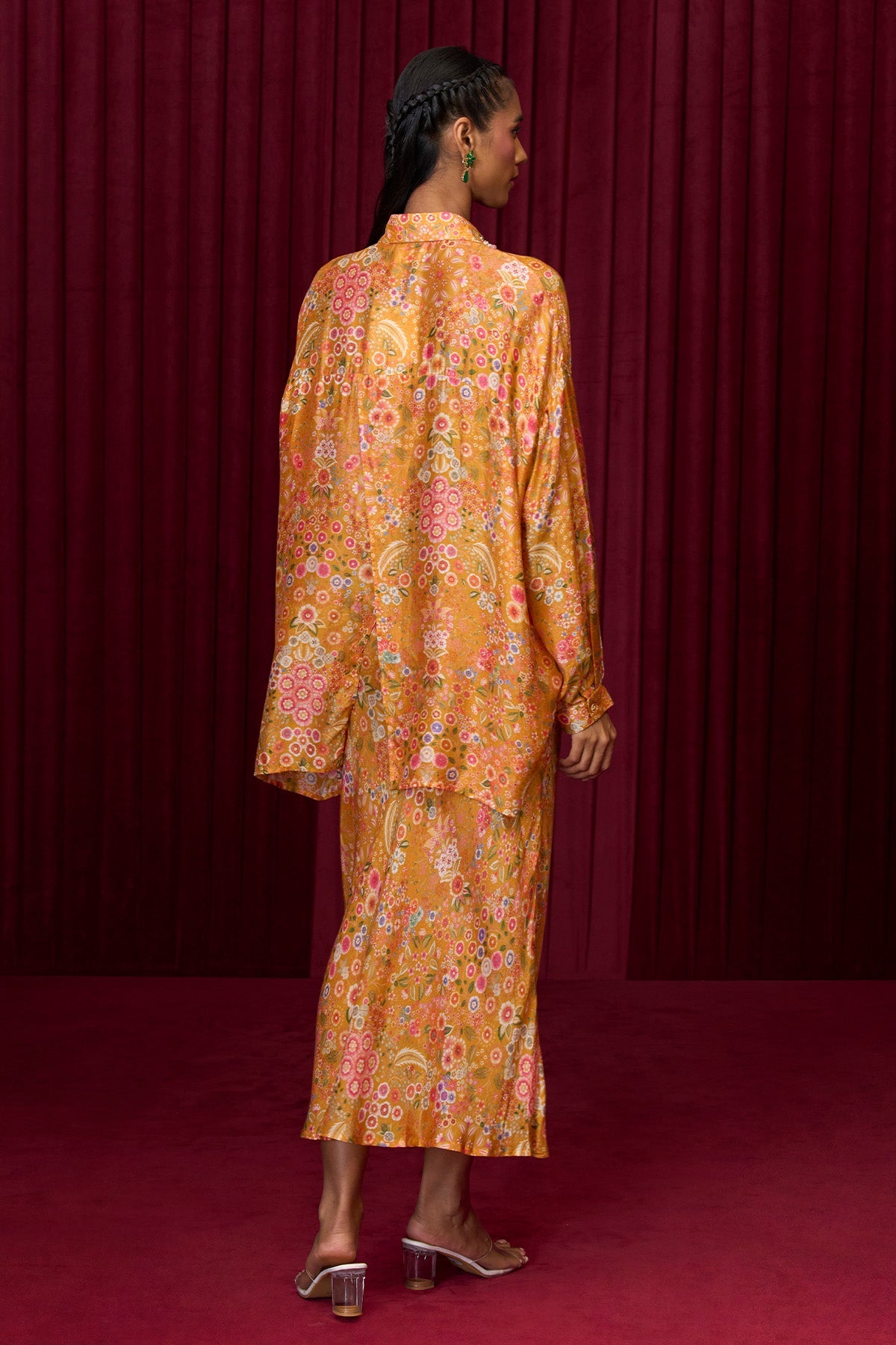 Yellow fine silk printed shirt beautifully paired with a skirt.