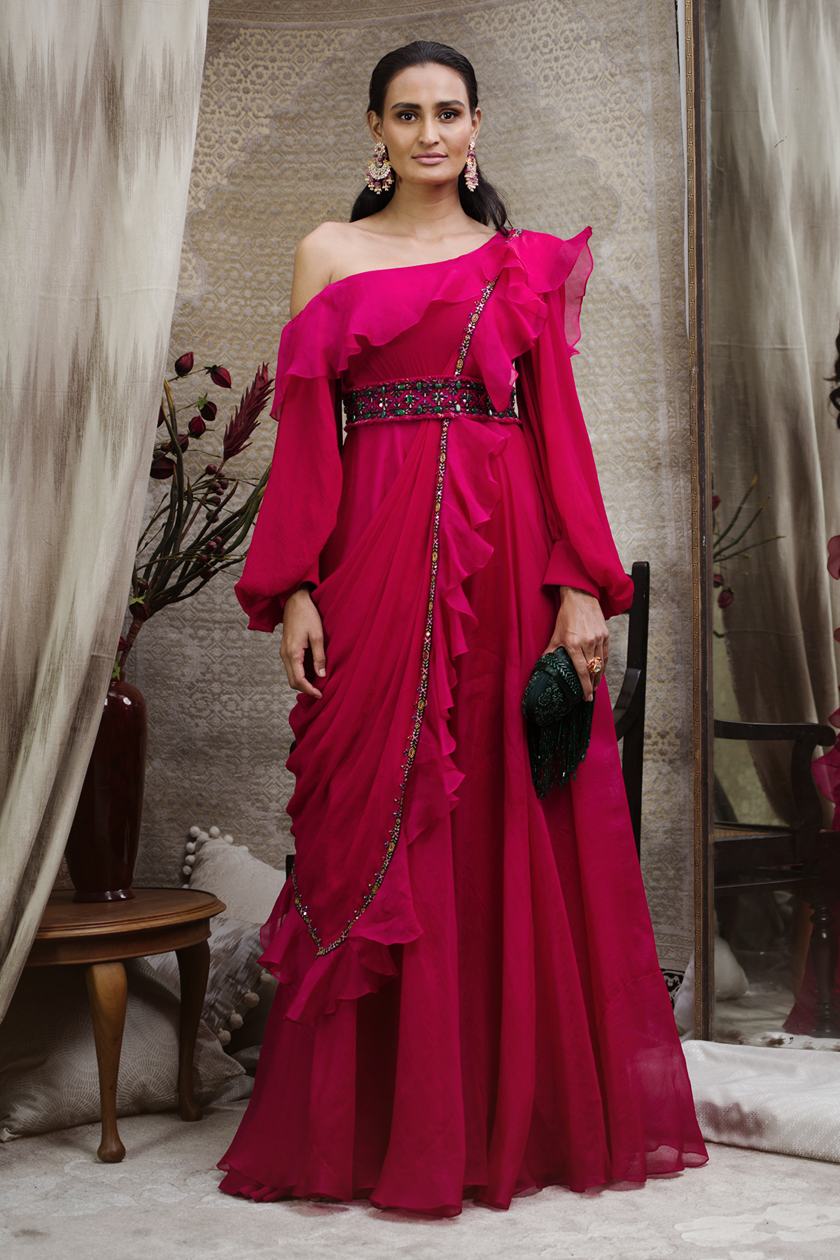 Drop Shoulder Fuschia Organza Ruffled Jumpsuit with Ruffled Chiffon Dupatta and Boho Belt