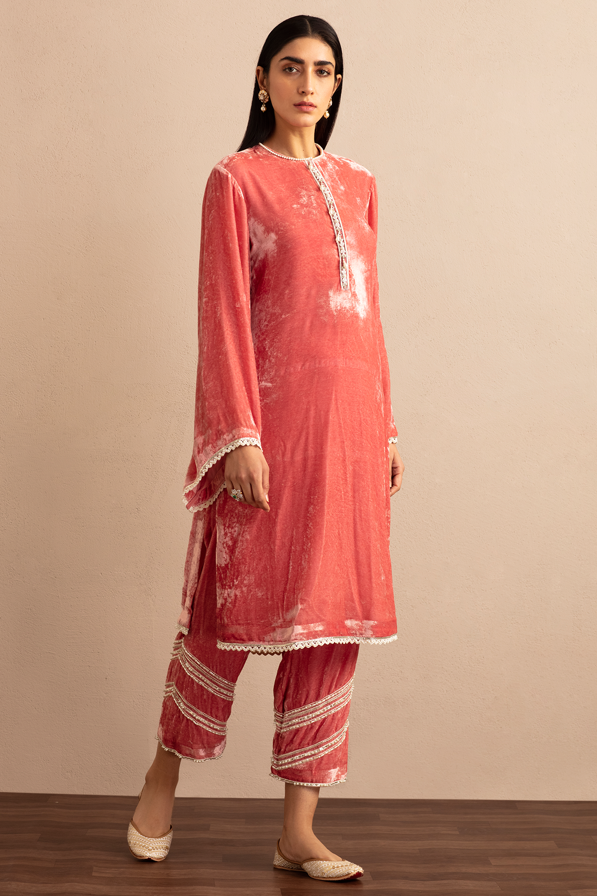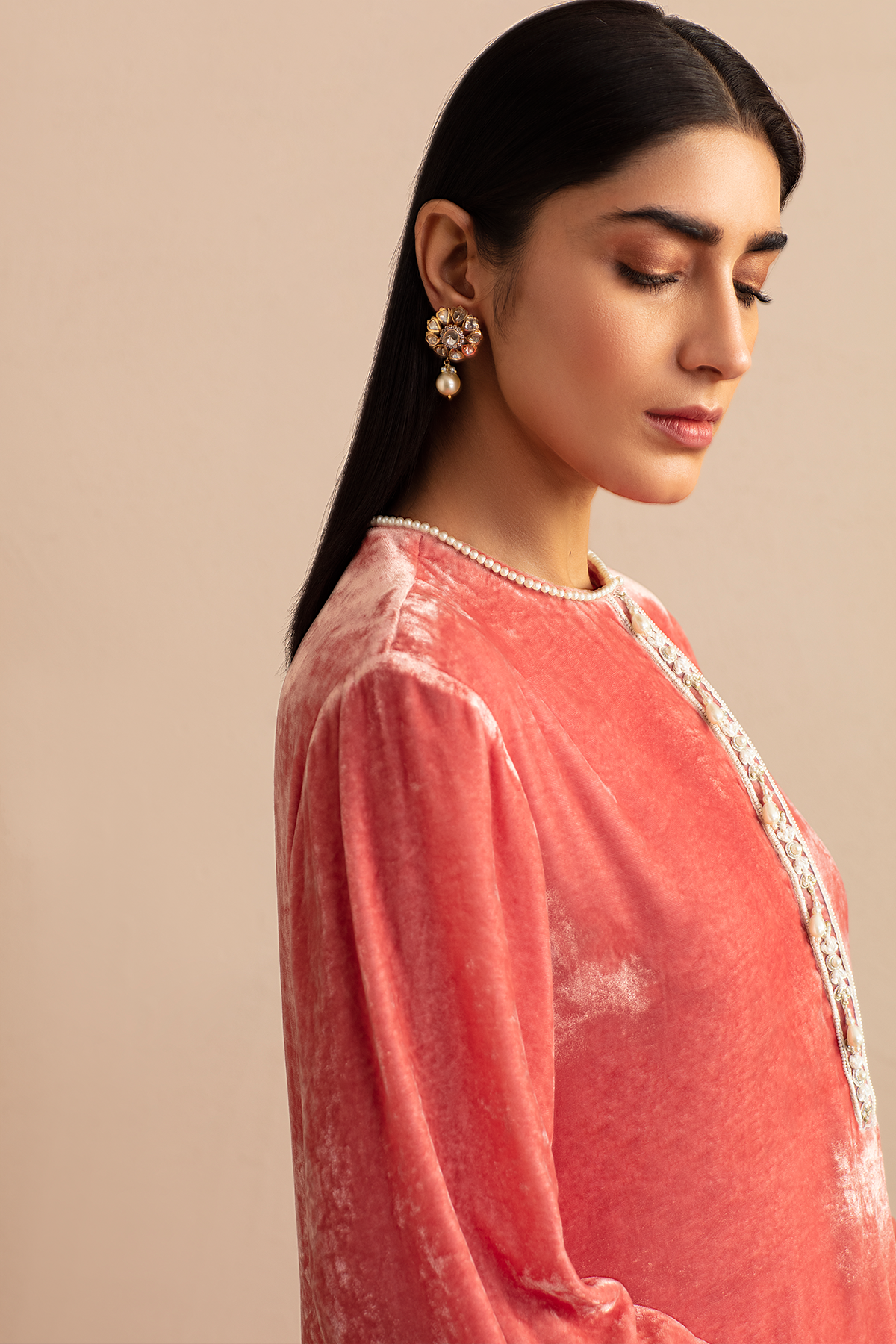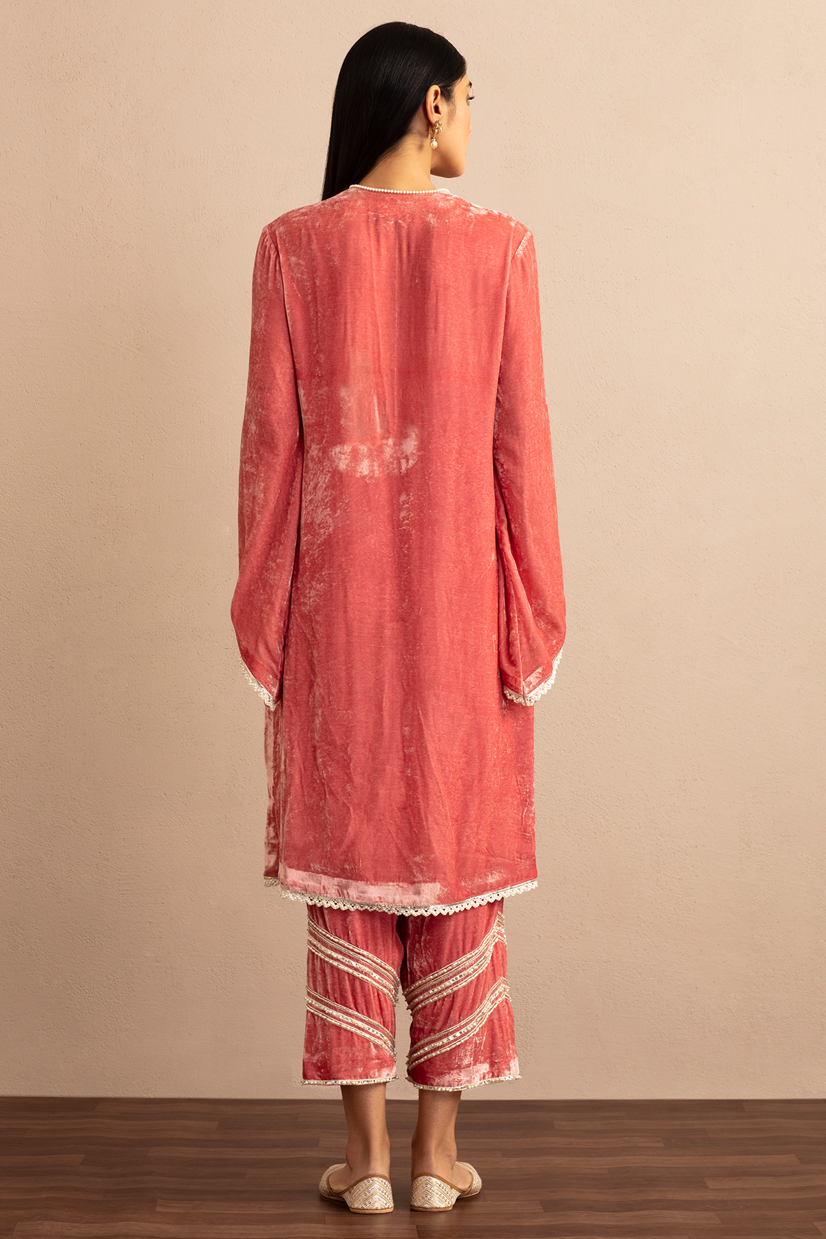 Onion pink velvet hand embroidered kurta with embroidered velvet pants