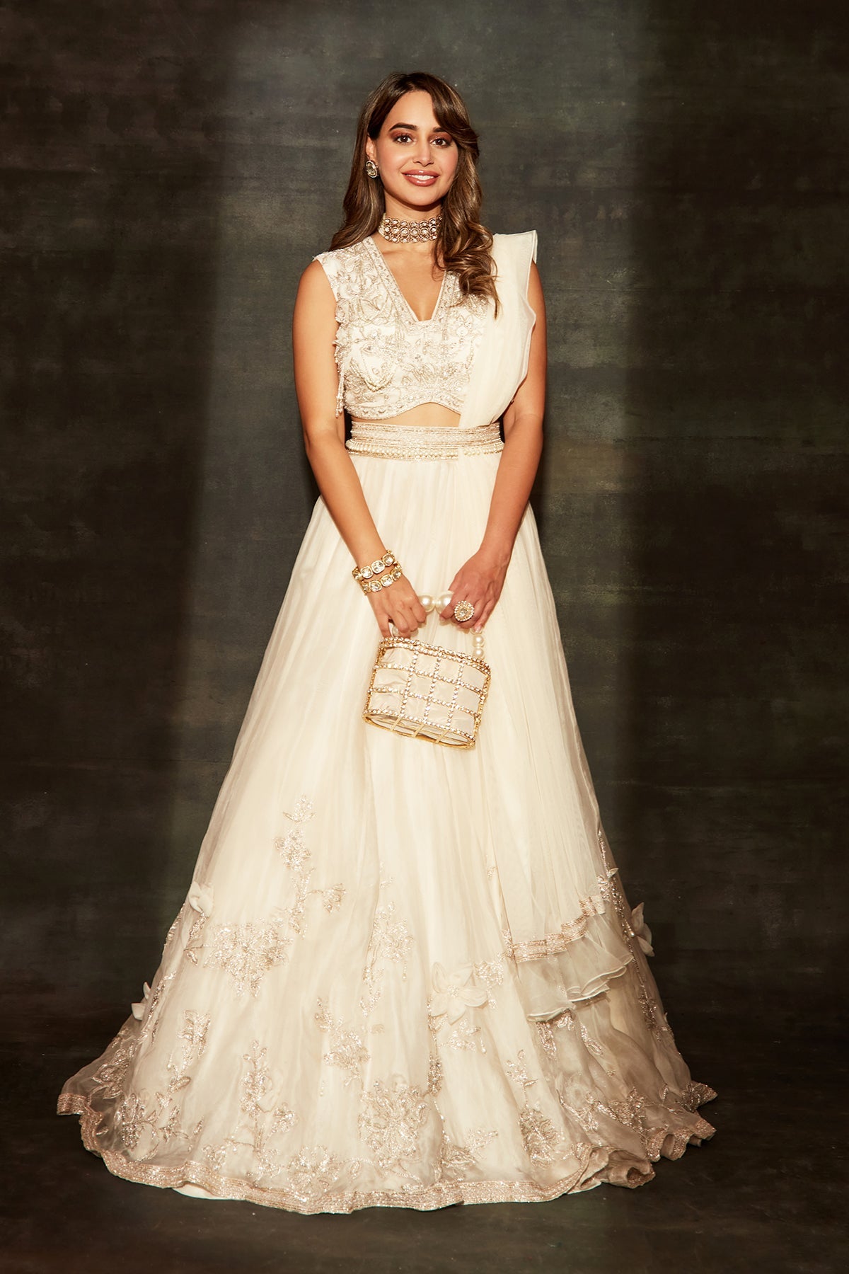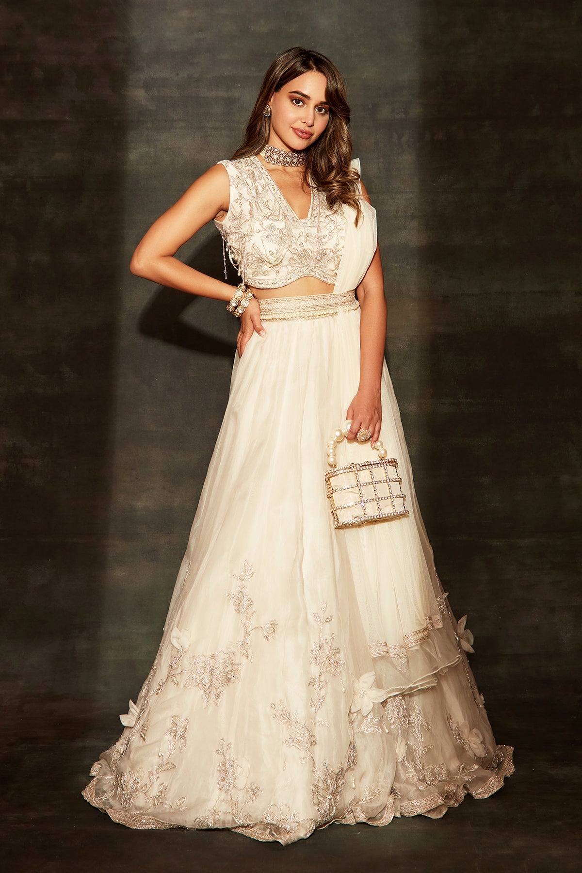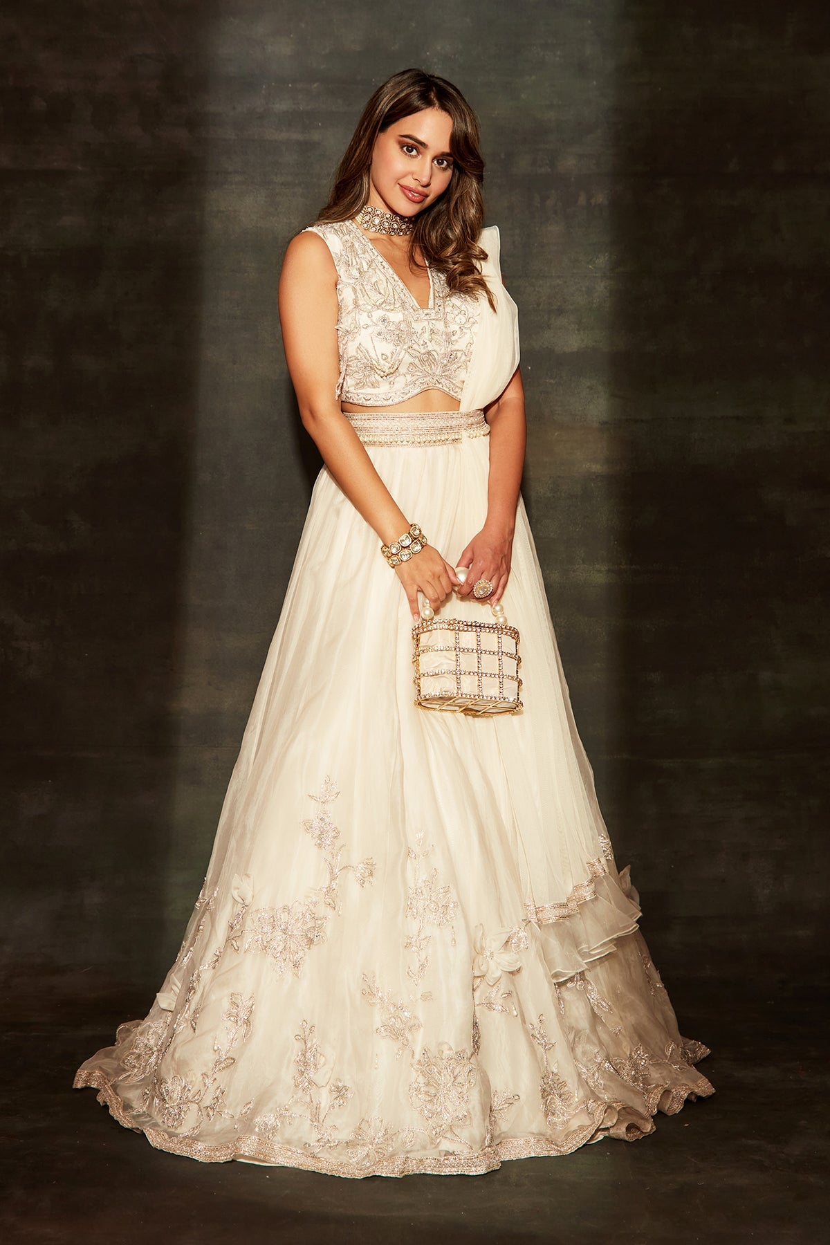 Embroidered organza lehenga with a net blouse and ruffled dupatta and embroidered belt