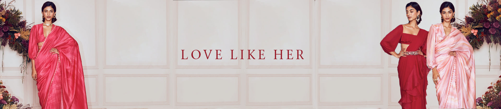 Love Like Her is a modern take on The Saree - a quintessential in the Indian ethnic fashion scene. Replete with both traditional and contemporary styles, every drape in this collection is ethereal in itself, drenched in vibrant colors and accentuated with distinct designs. Mostly done in georgette and organza, these dazzling drapes have been meticulously made to fit your festive wardrobes just right.Â