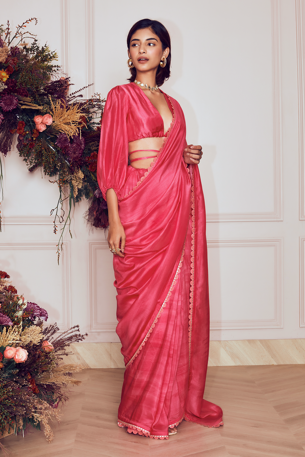 Fuchsia ombre printed silk saree V neck exaggerated sleeves blouse and crepe petticoat