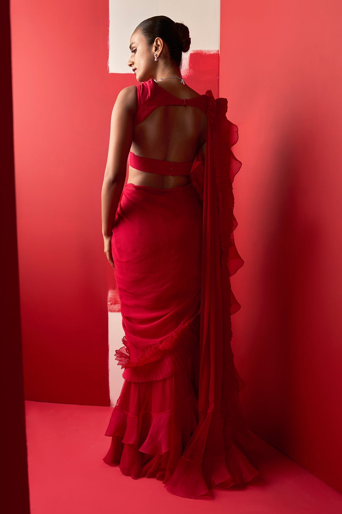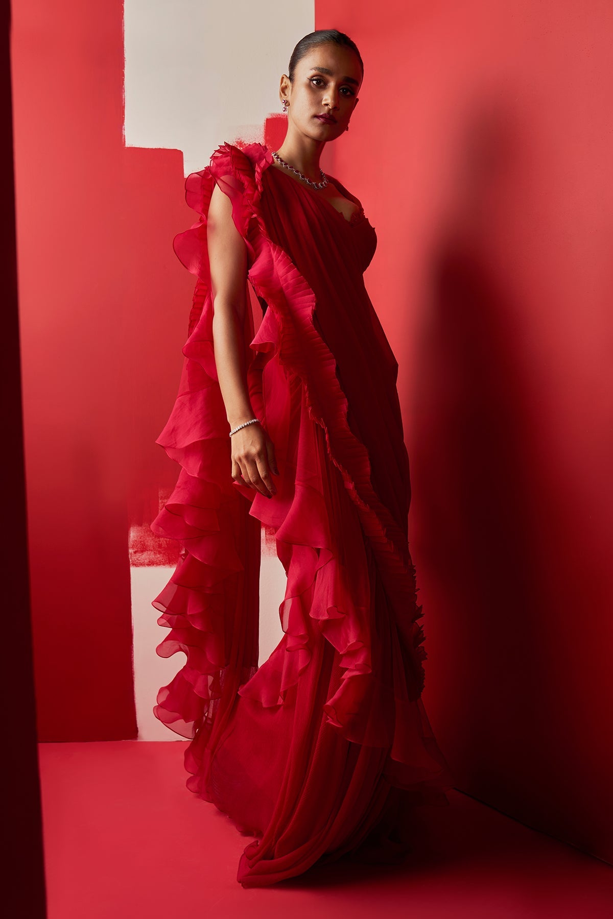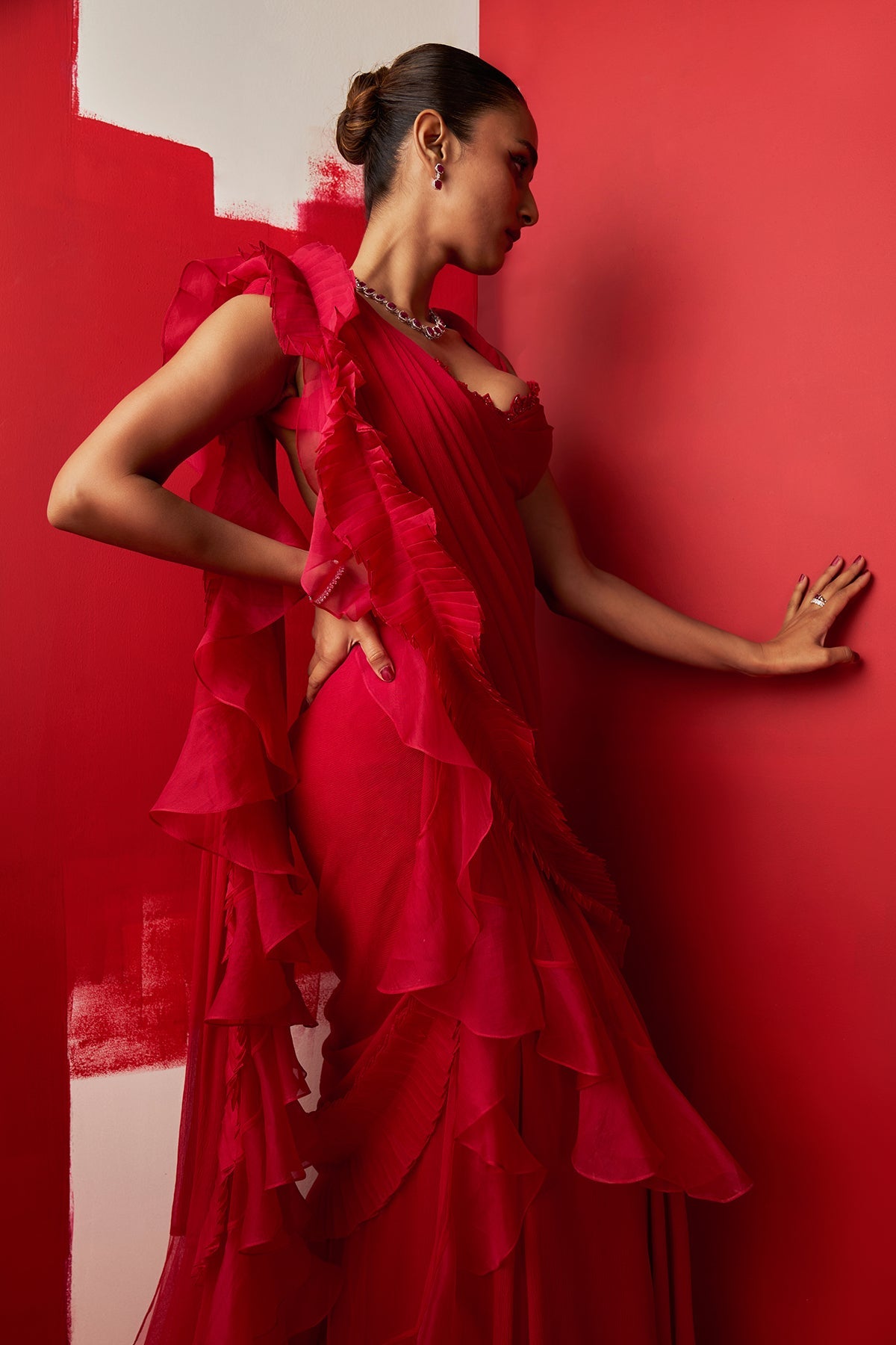 Red Net Monotone Embroidered Organza Draped Blouse Paired With Chiffon Organza Double Draped Ruffled Saree